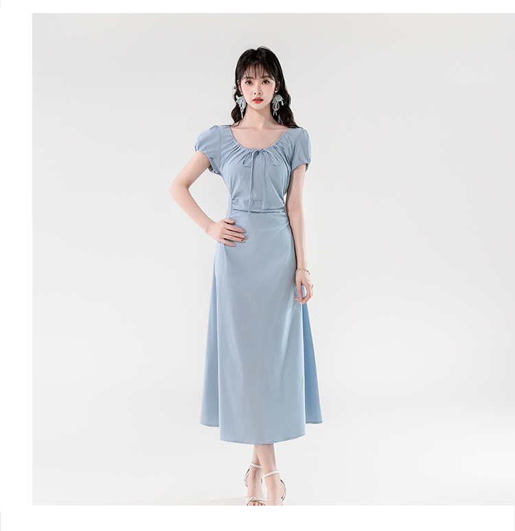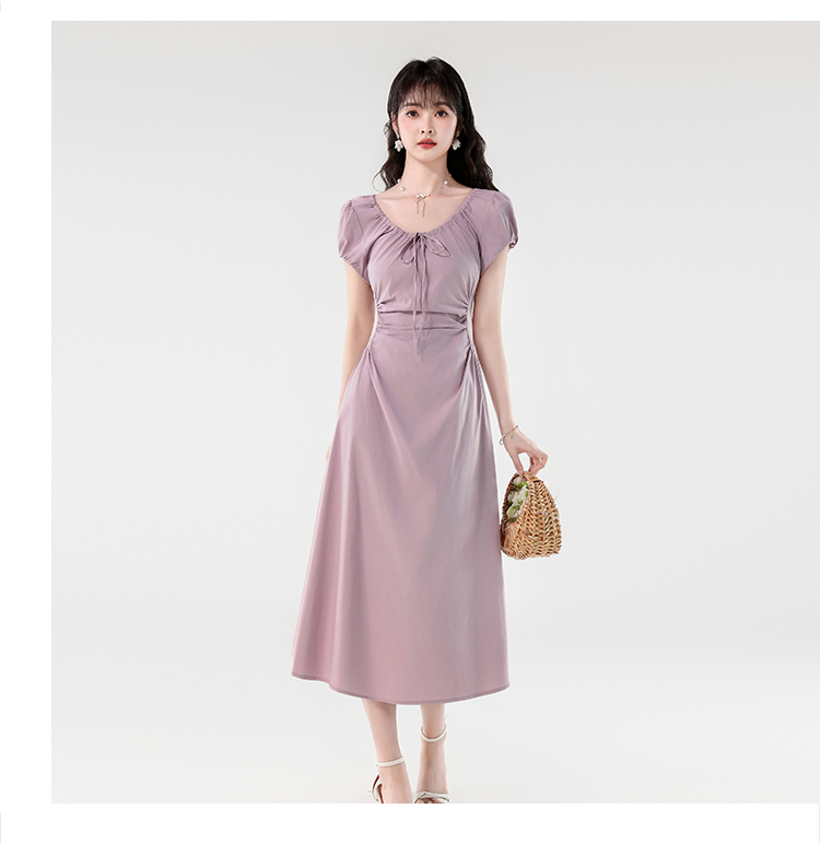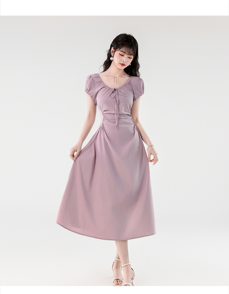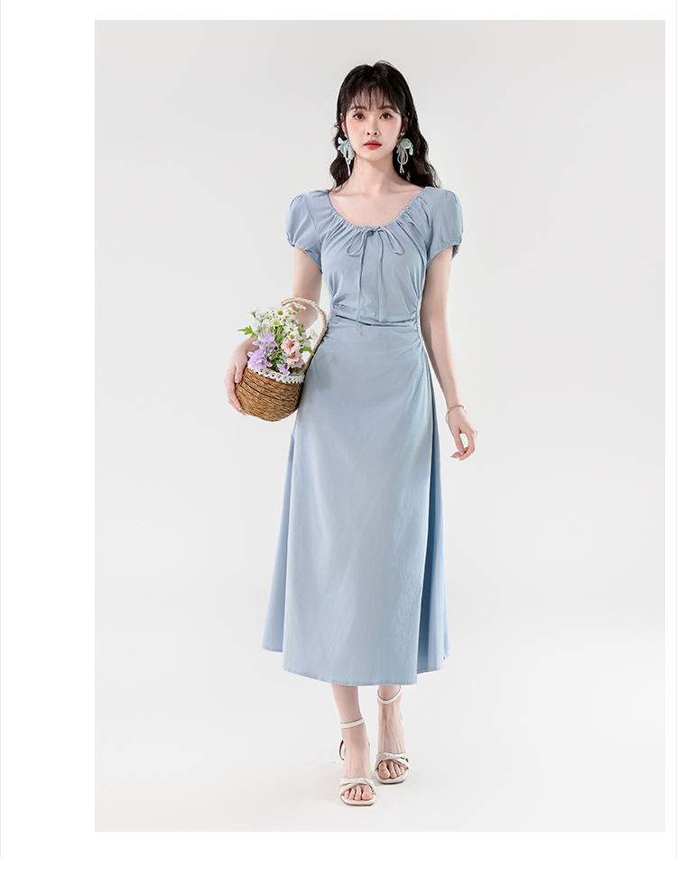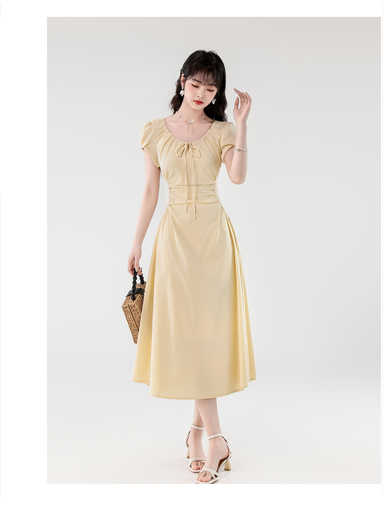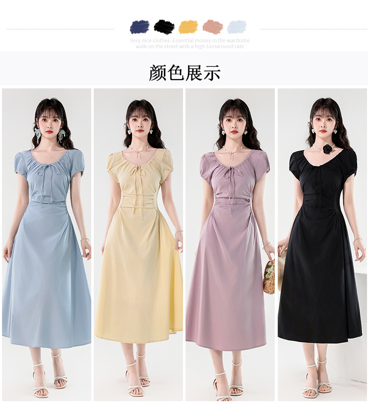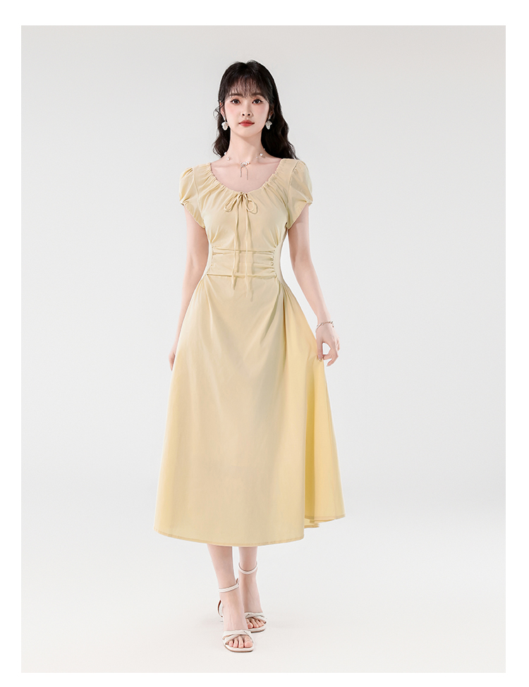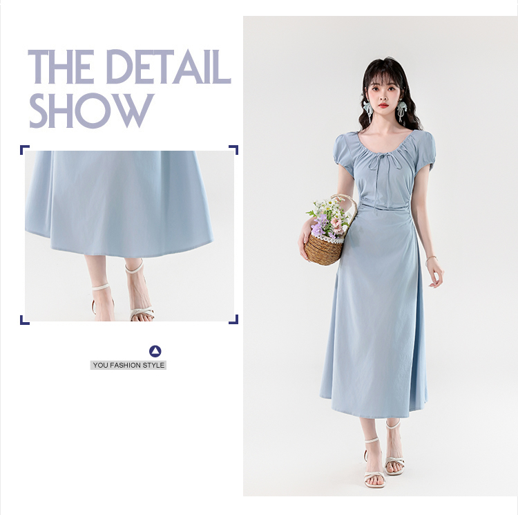 RY390# 实拍2026夏新款韩版甜美减龄抽绳系带褶皱收腰弹力显瘦长款连衣裙