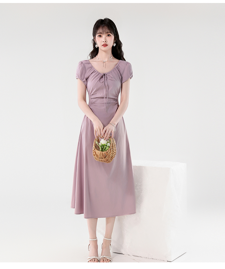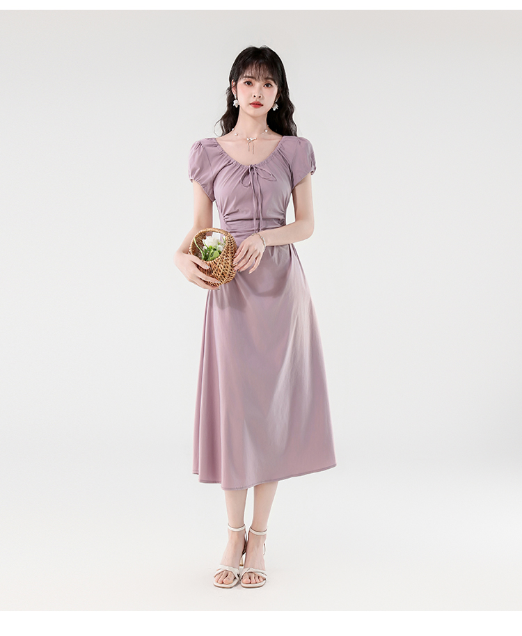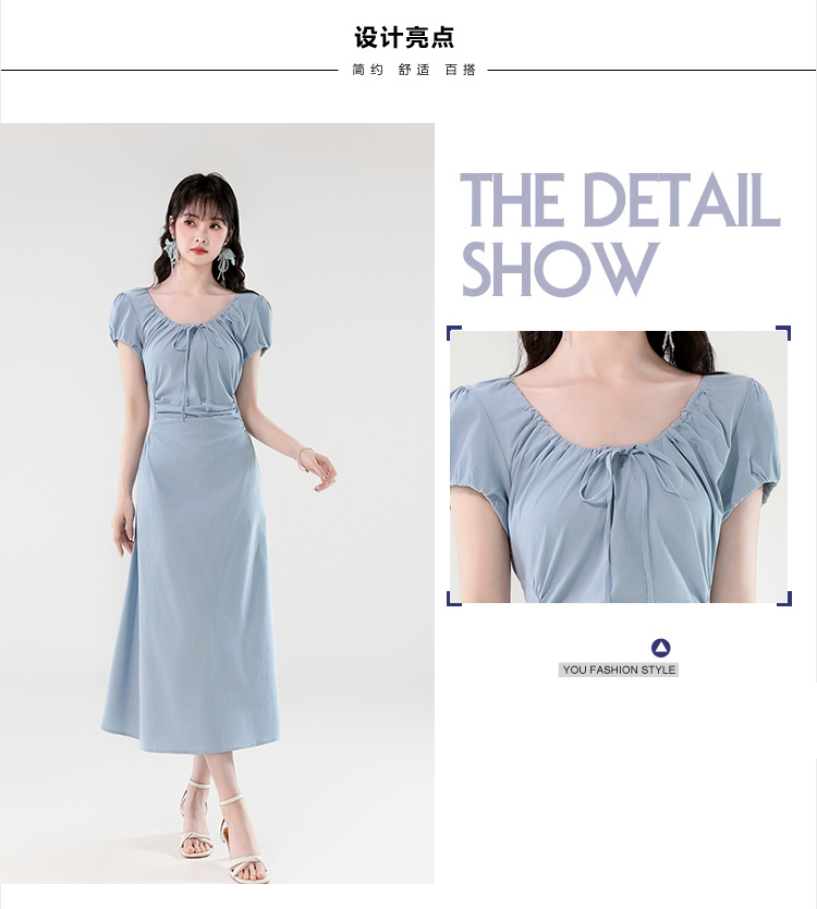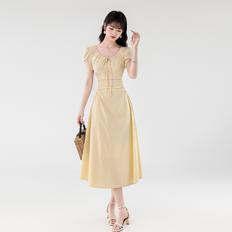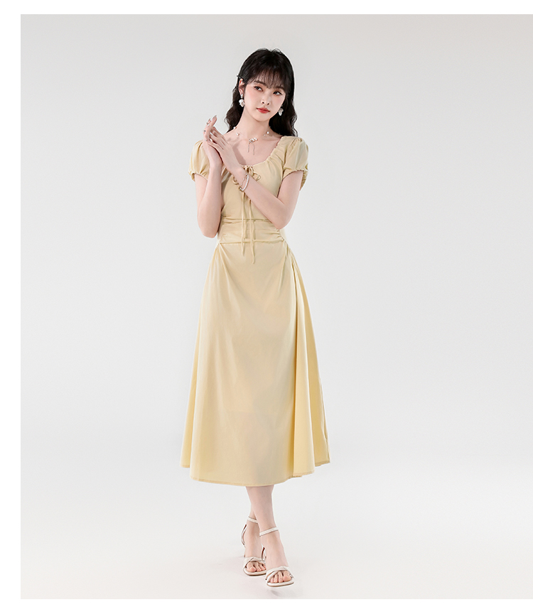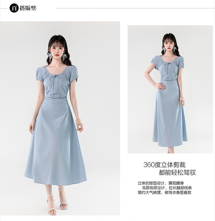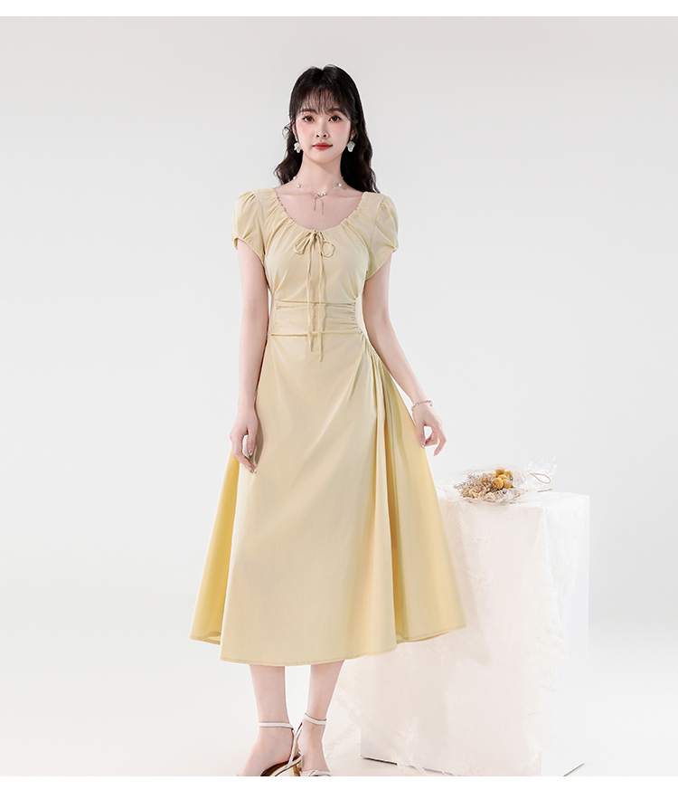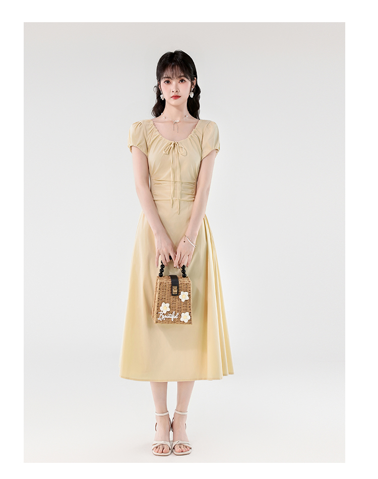 RY390# 实拍2026夏新款韩版甜美减龄抽绳系带褶皱收腰弹力显瘦长款连衣裙