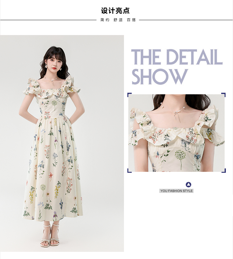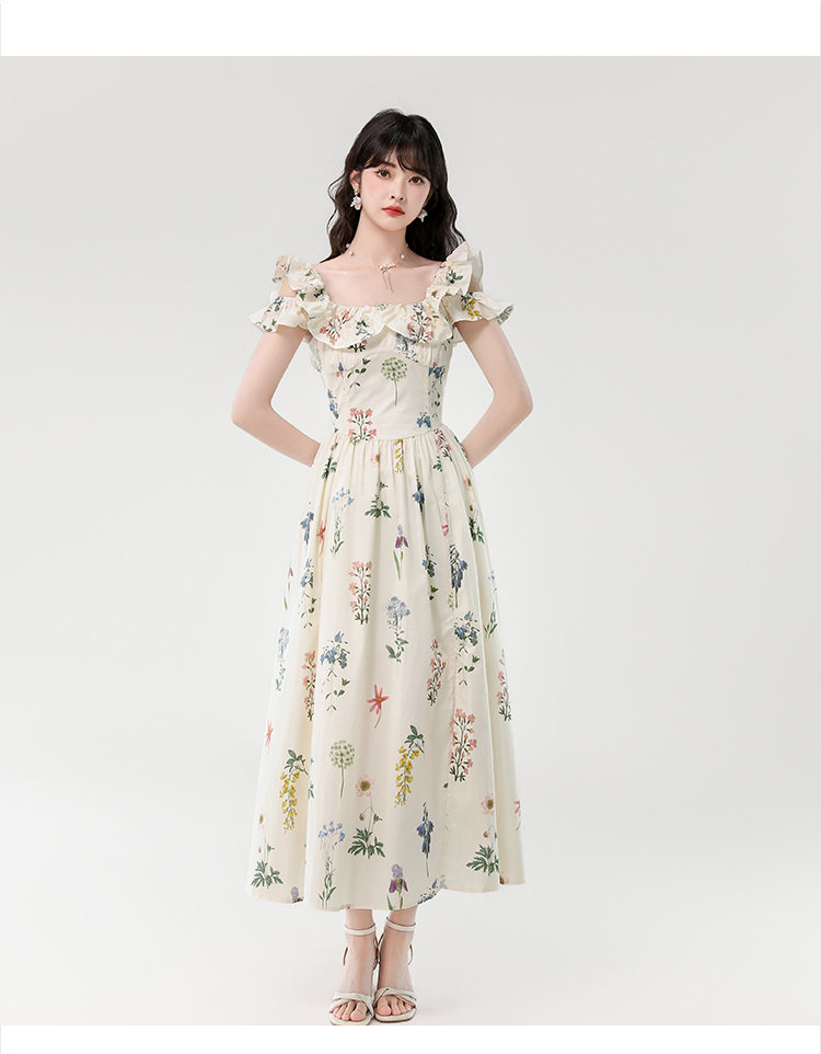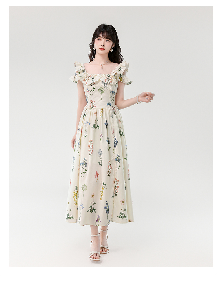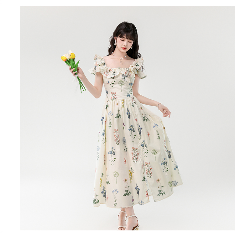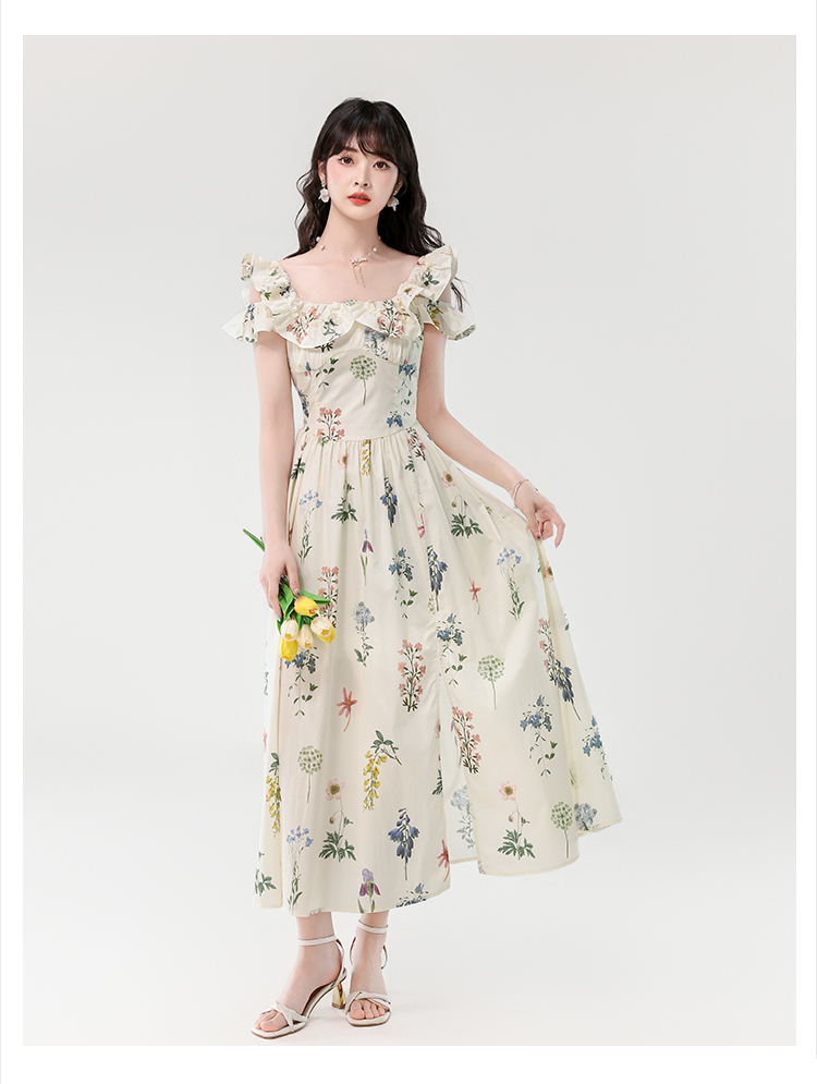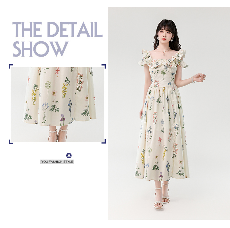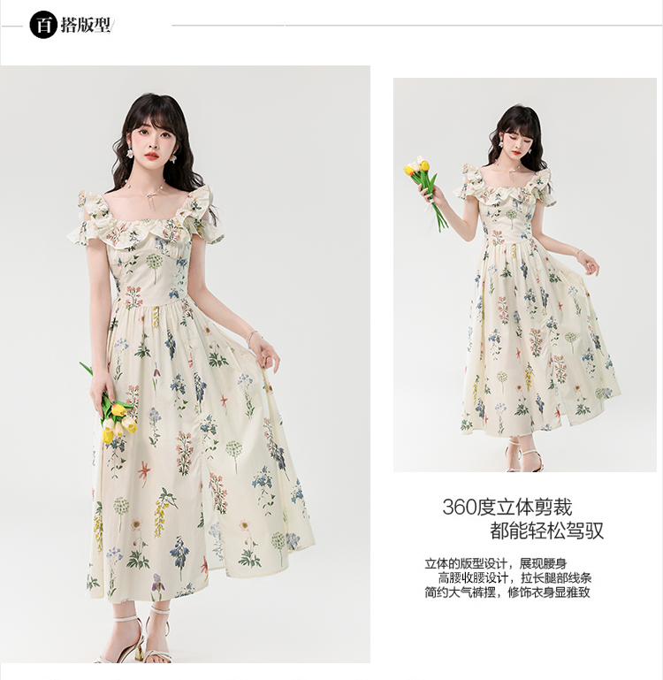 RY394# 实拍2026夏季新款法式方领荷叶袖收腰显瘦长款度假风碎花连衣裙