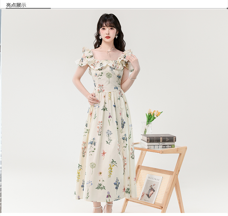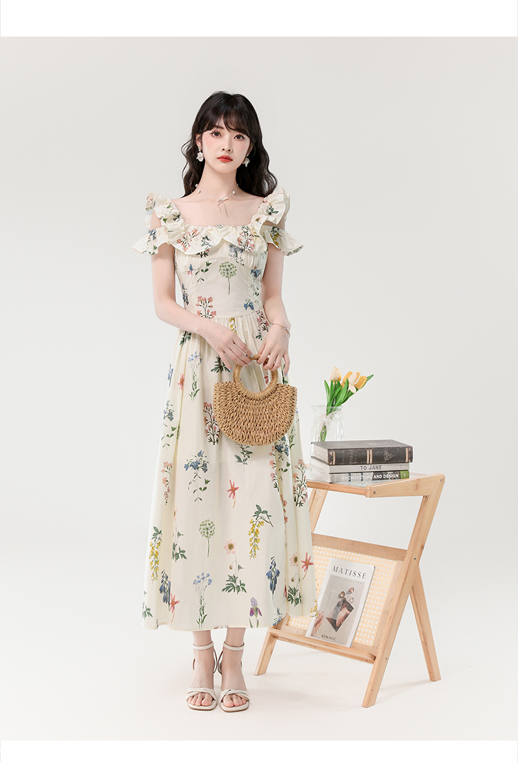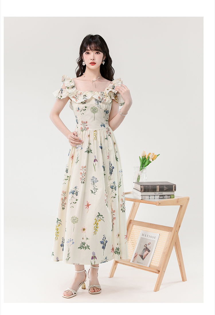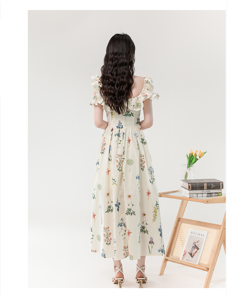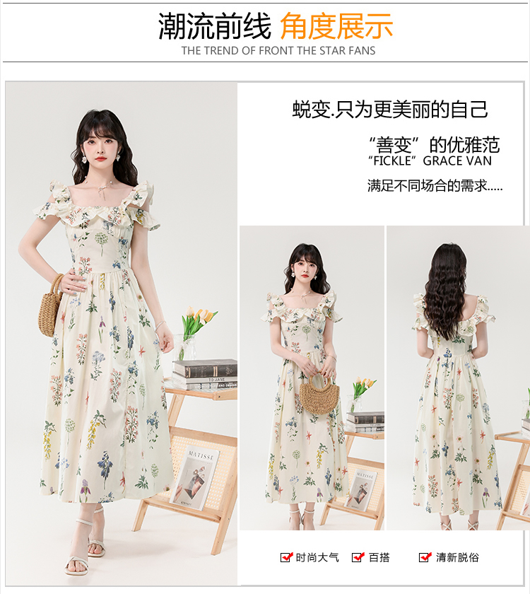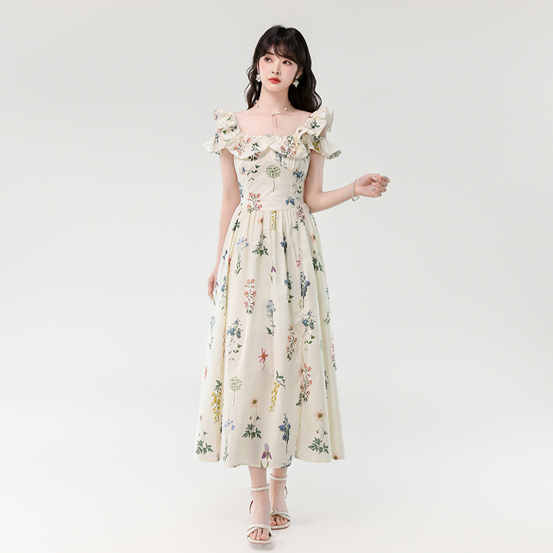 RY394# 实拍2026夏季新款法式方领荷叶袖收腰显瘦长款度假风碎花连衣裙