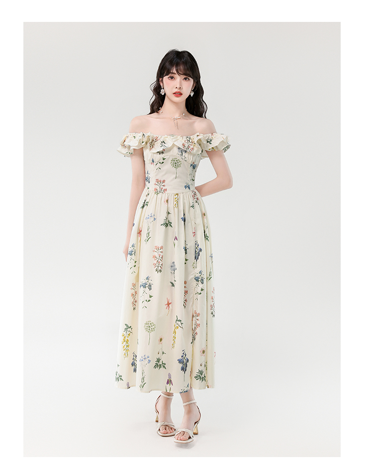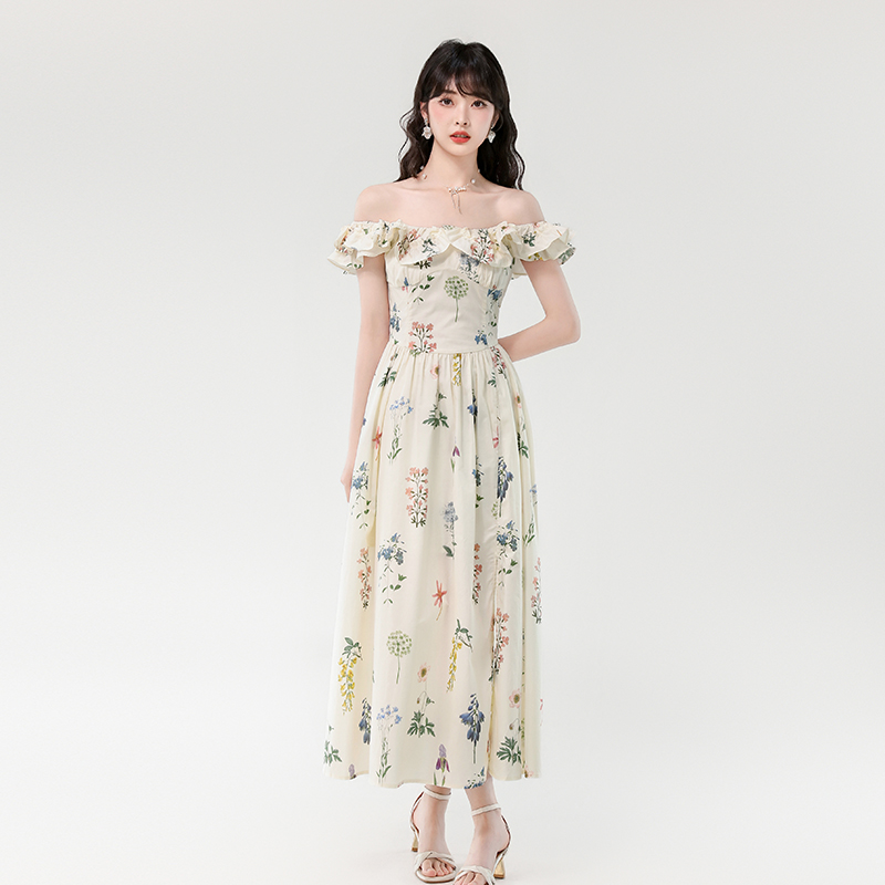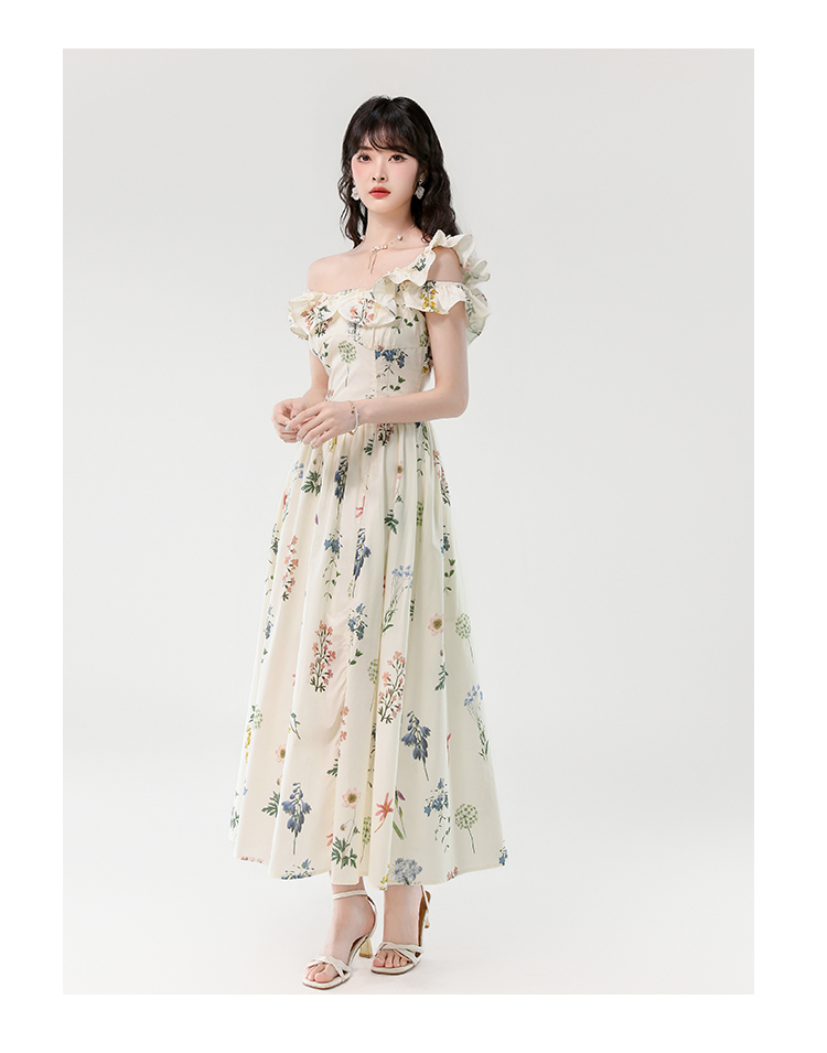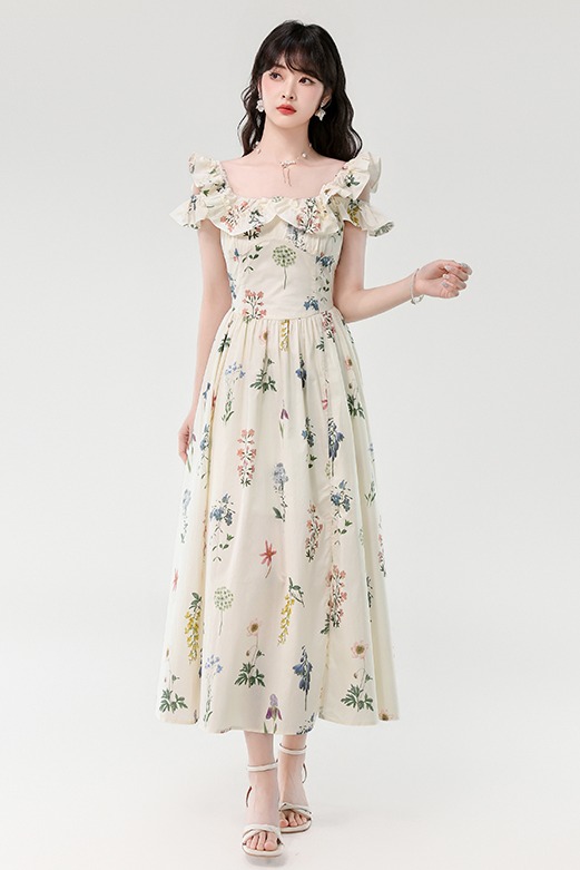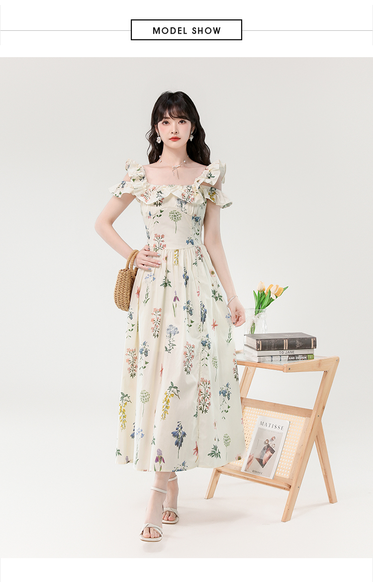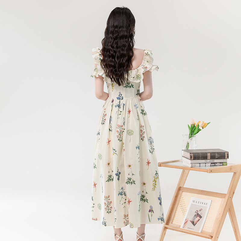 RY394# 实拍2026夏季新款法式方领荷叶袖收腰显瘦长款度假风碎花连衣裙