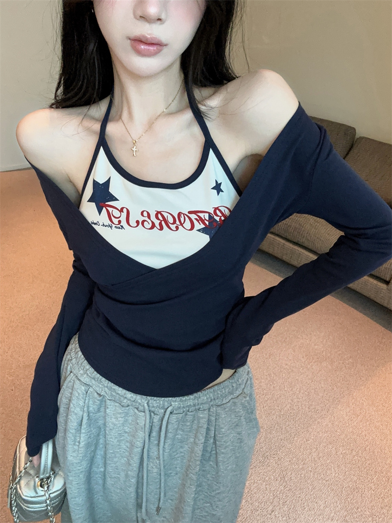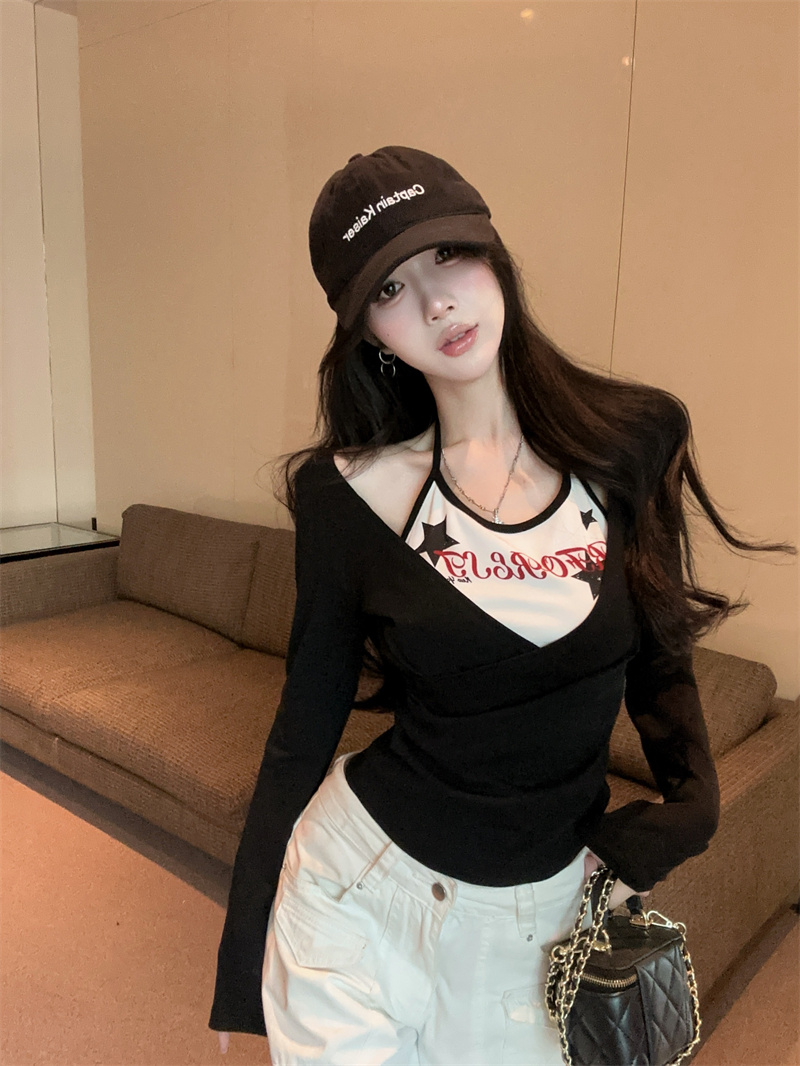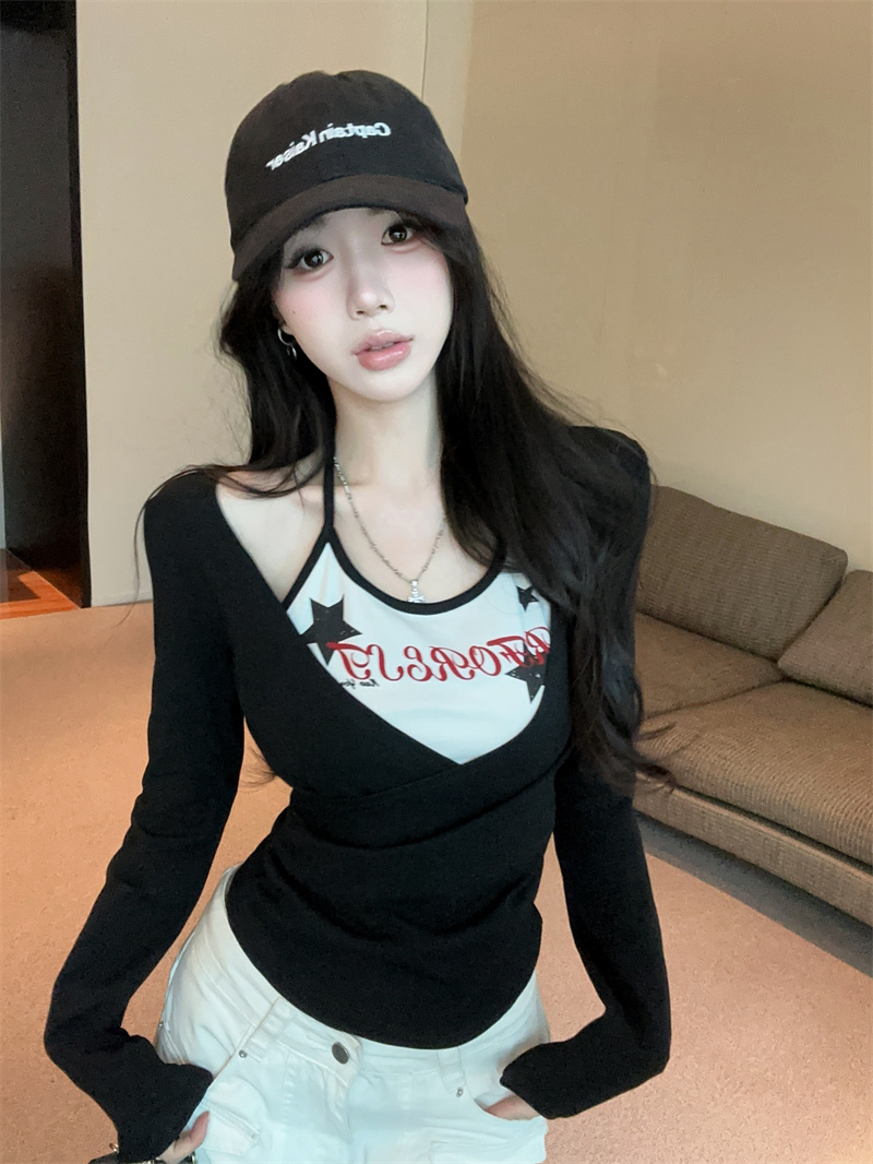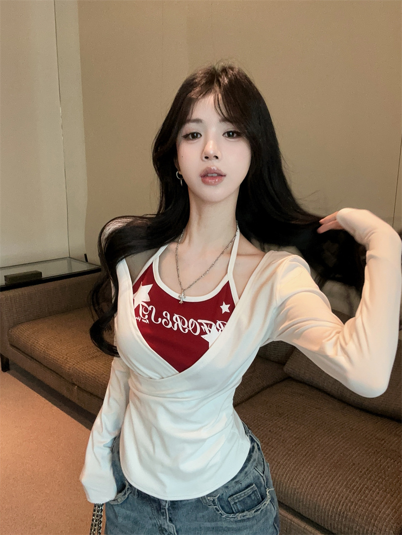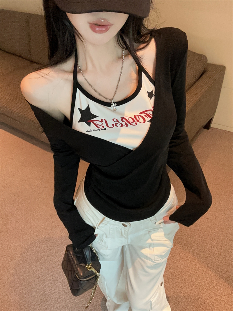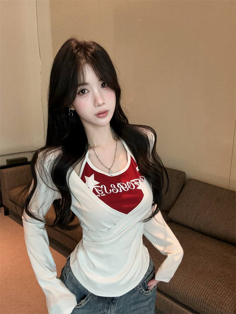 RY403# 美式假两件印花撞色长袖挂脖T恤女春季新款显瘦辣妹上衣