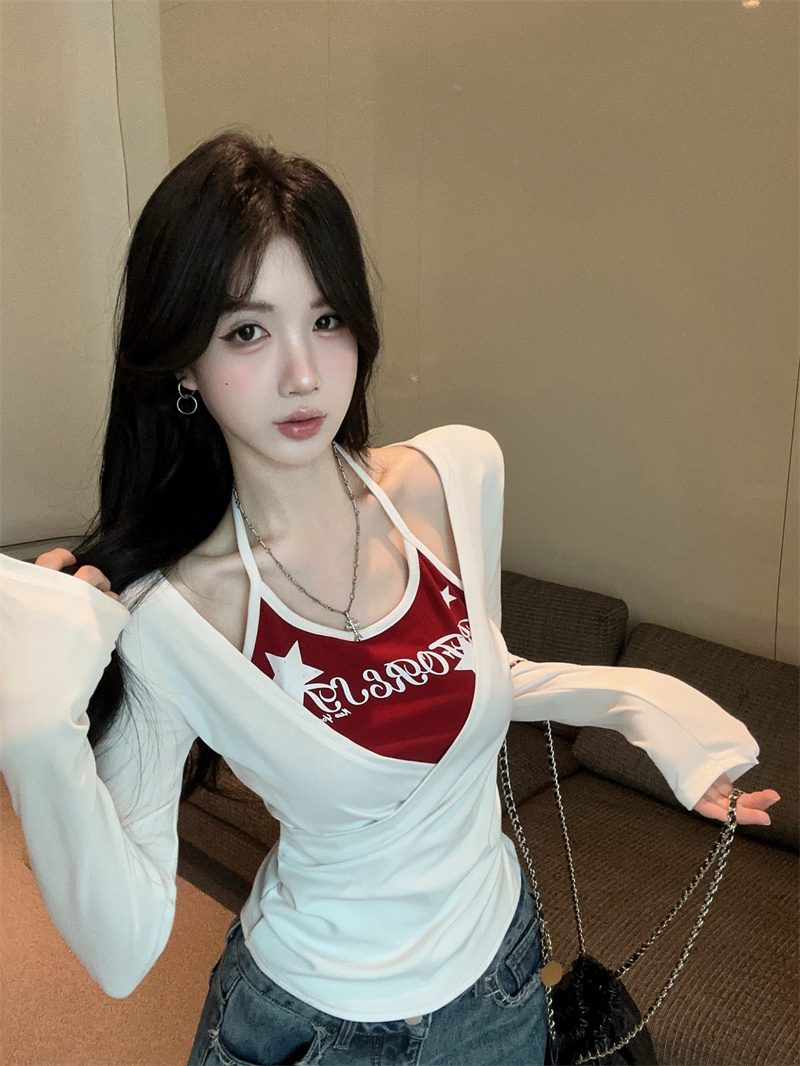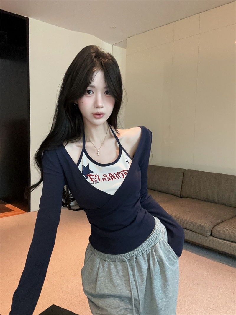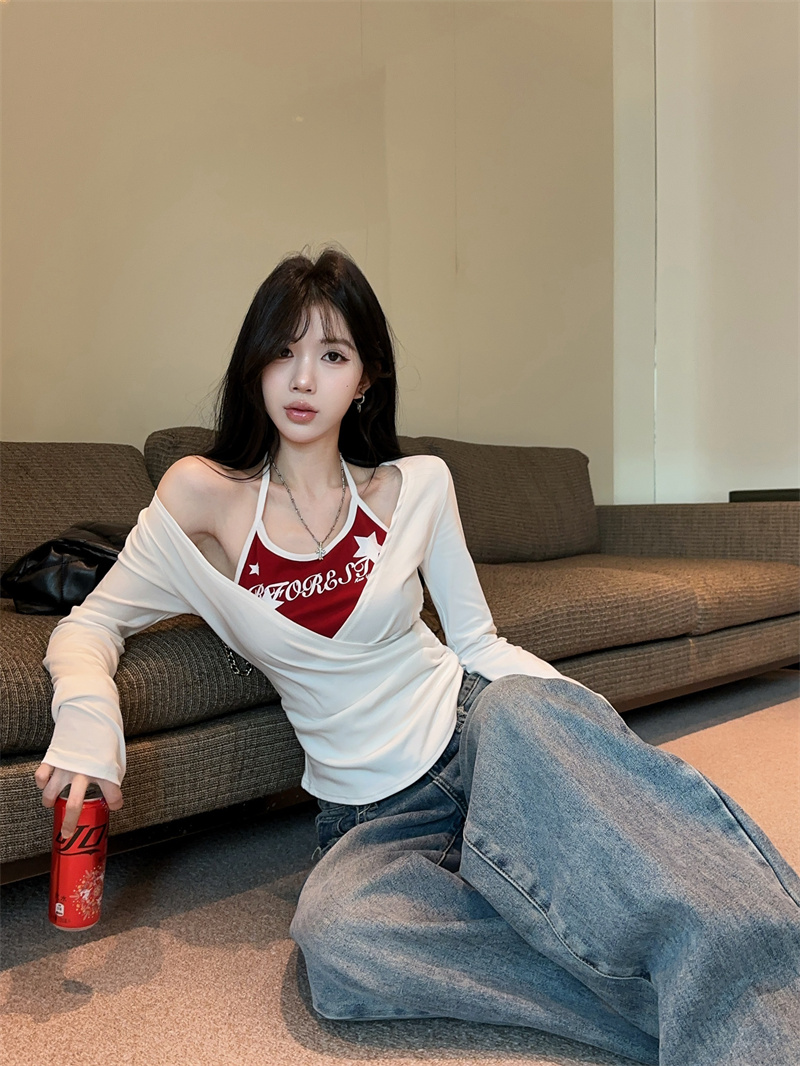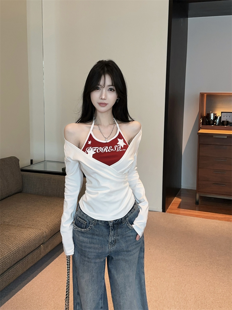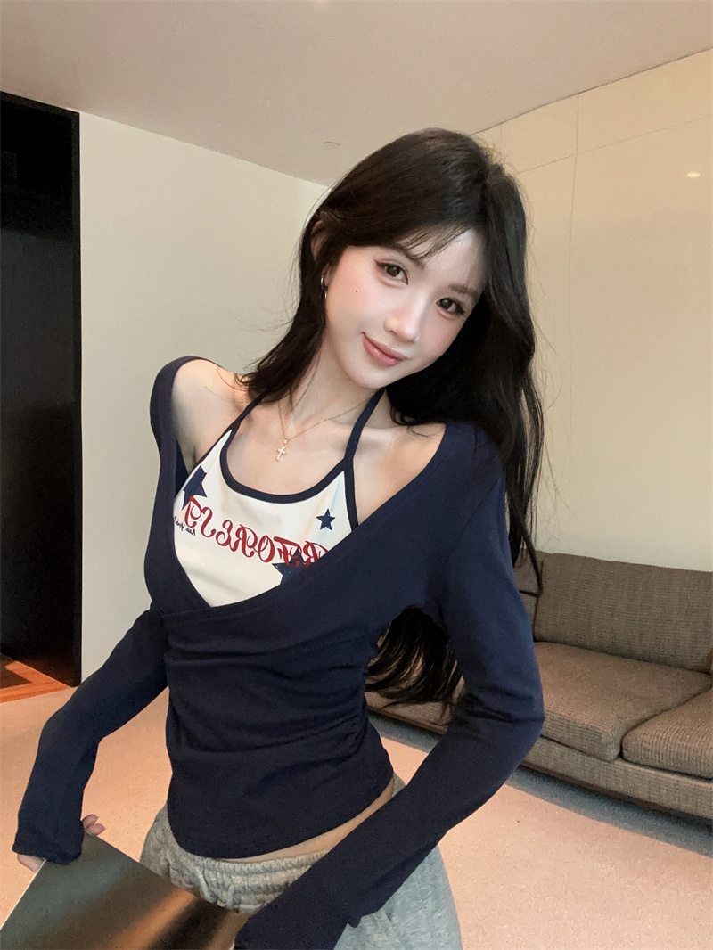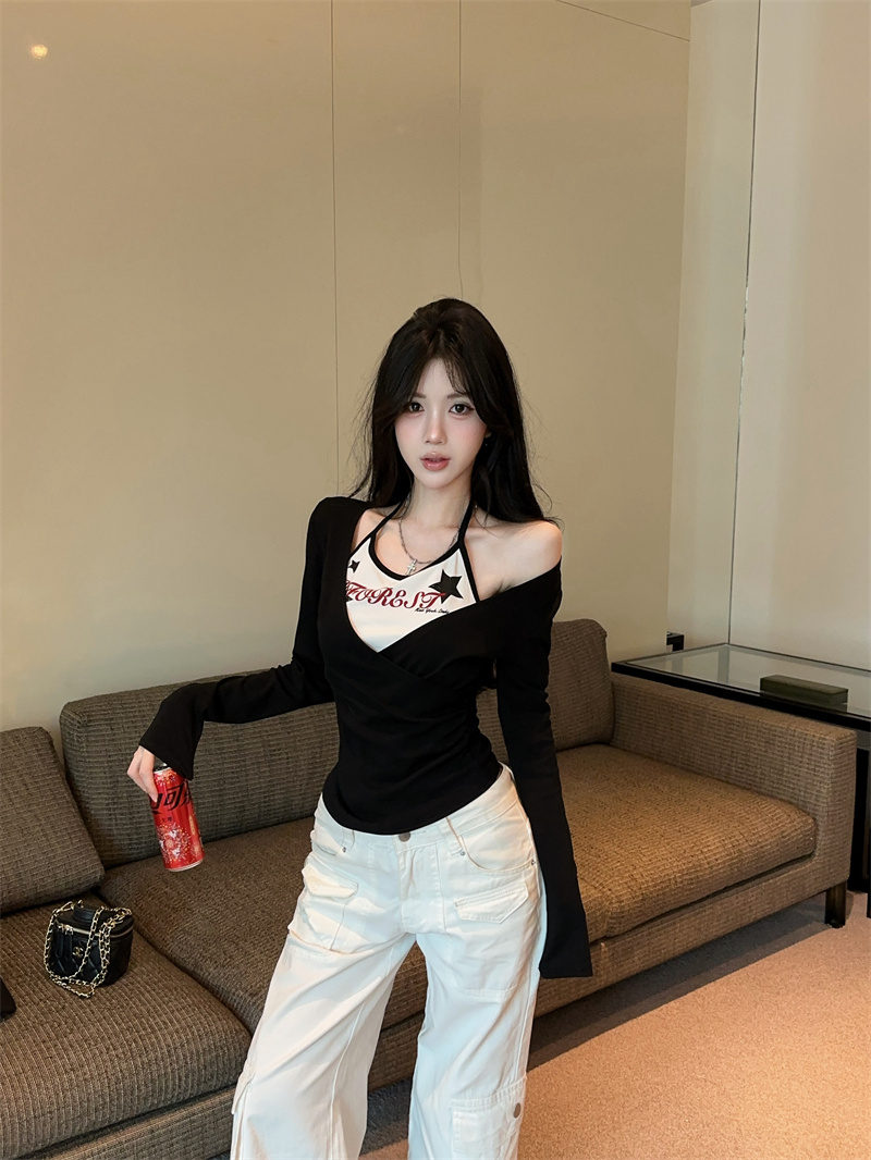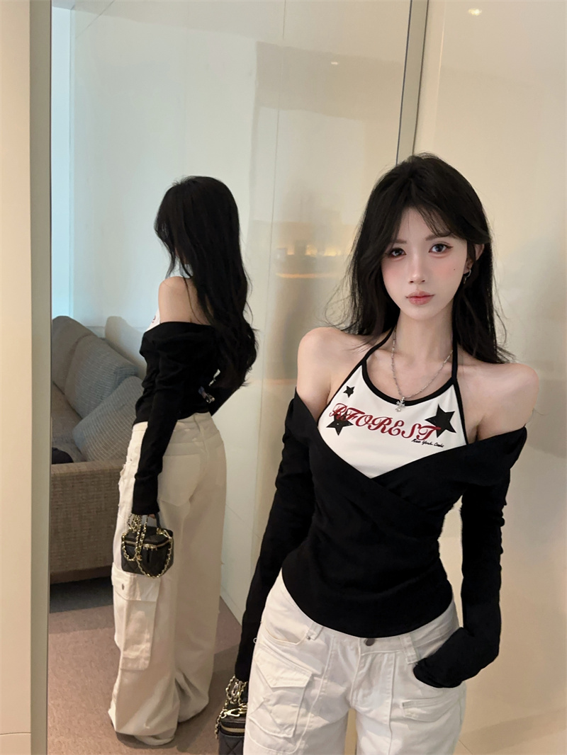 RY403# 美式假两件印花撞色长袖挂脖T恤女春季新款显瘦辣妹上衣