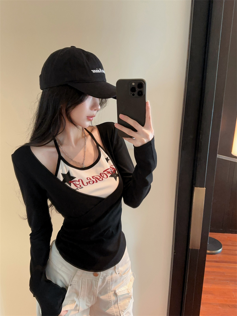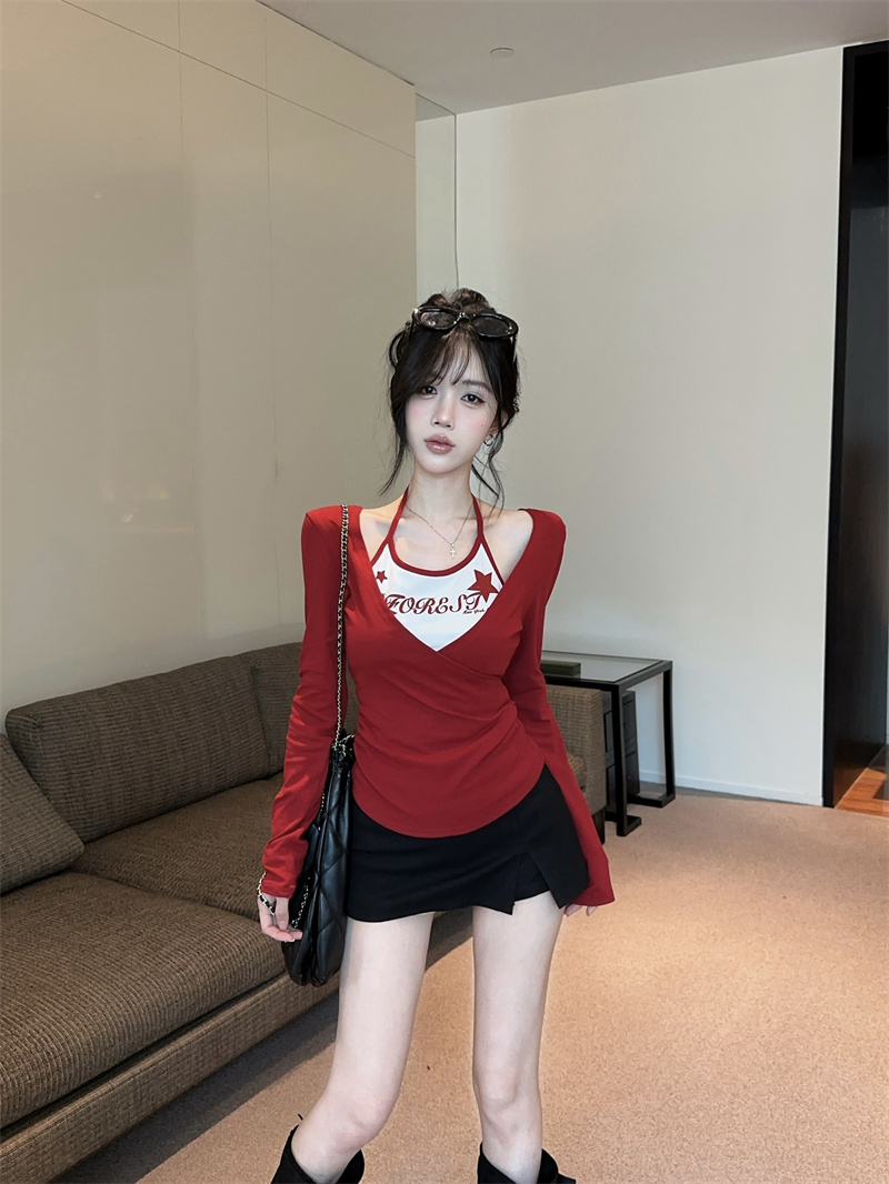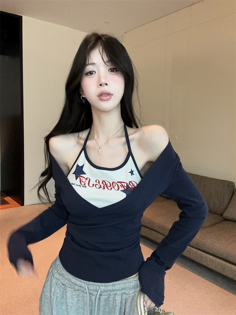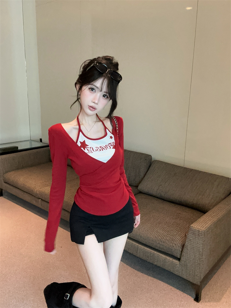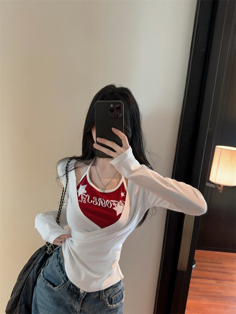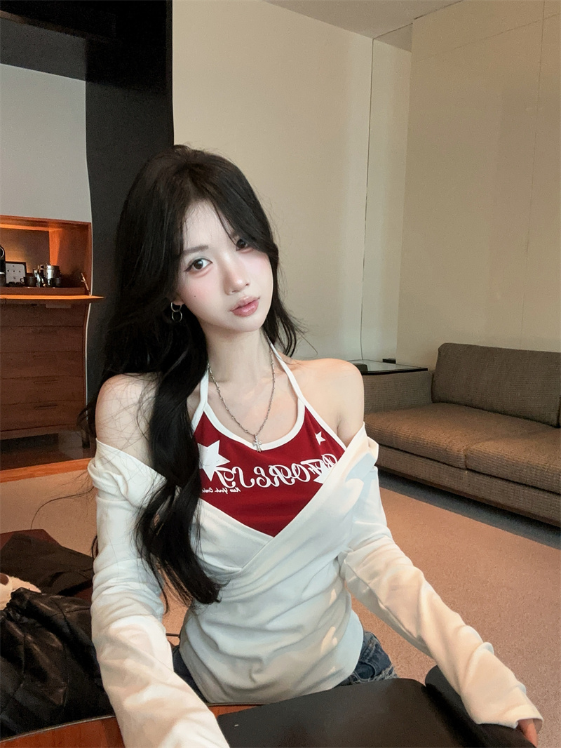 RY403# 美式假两件印花撞色长袖挂脖T恤女春季新款显瘦辣妹上衣