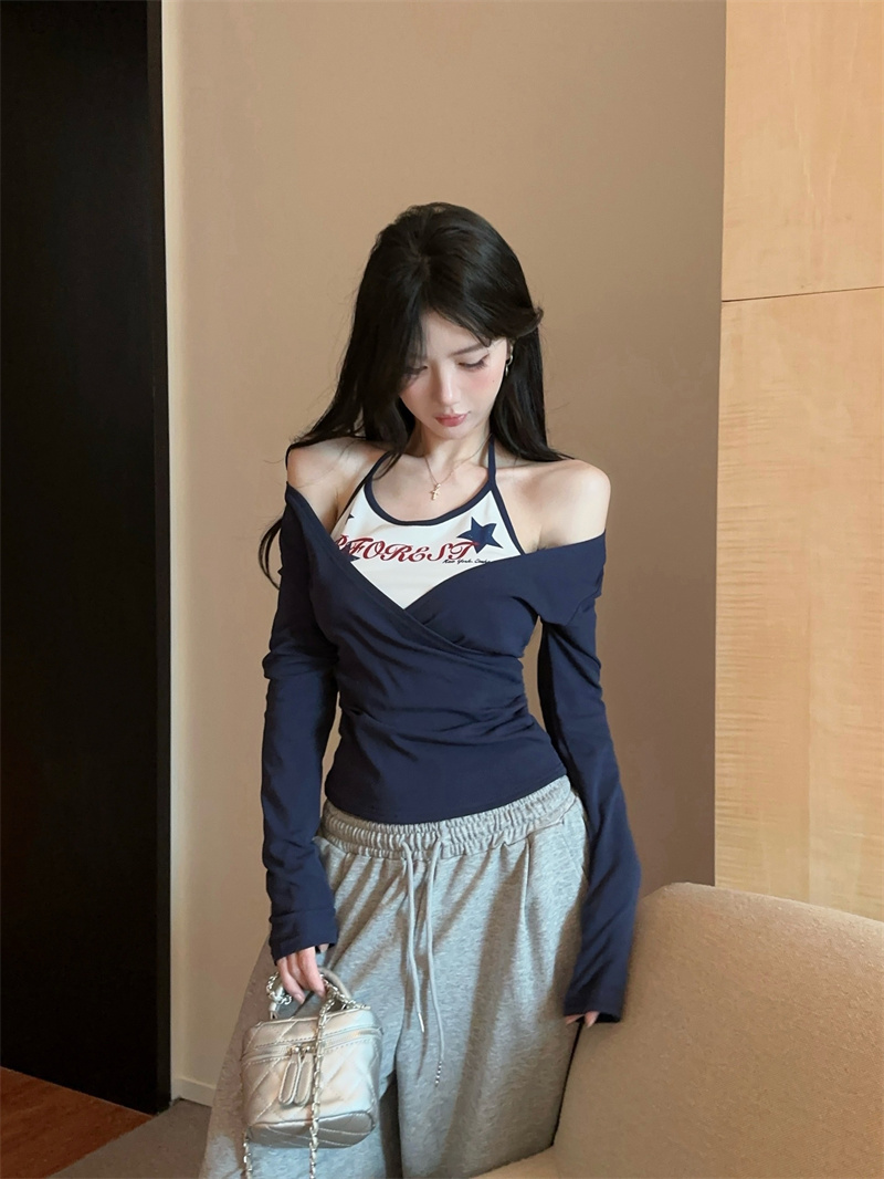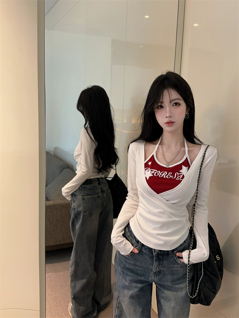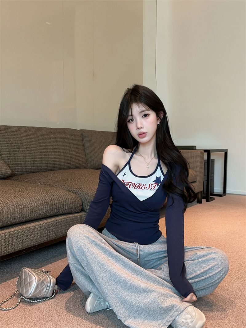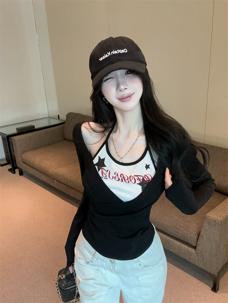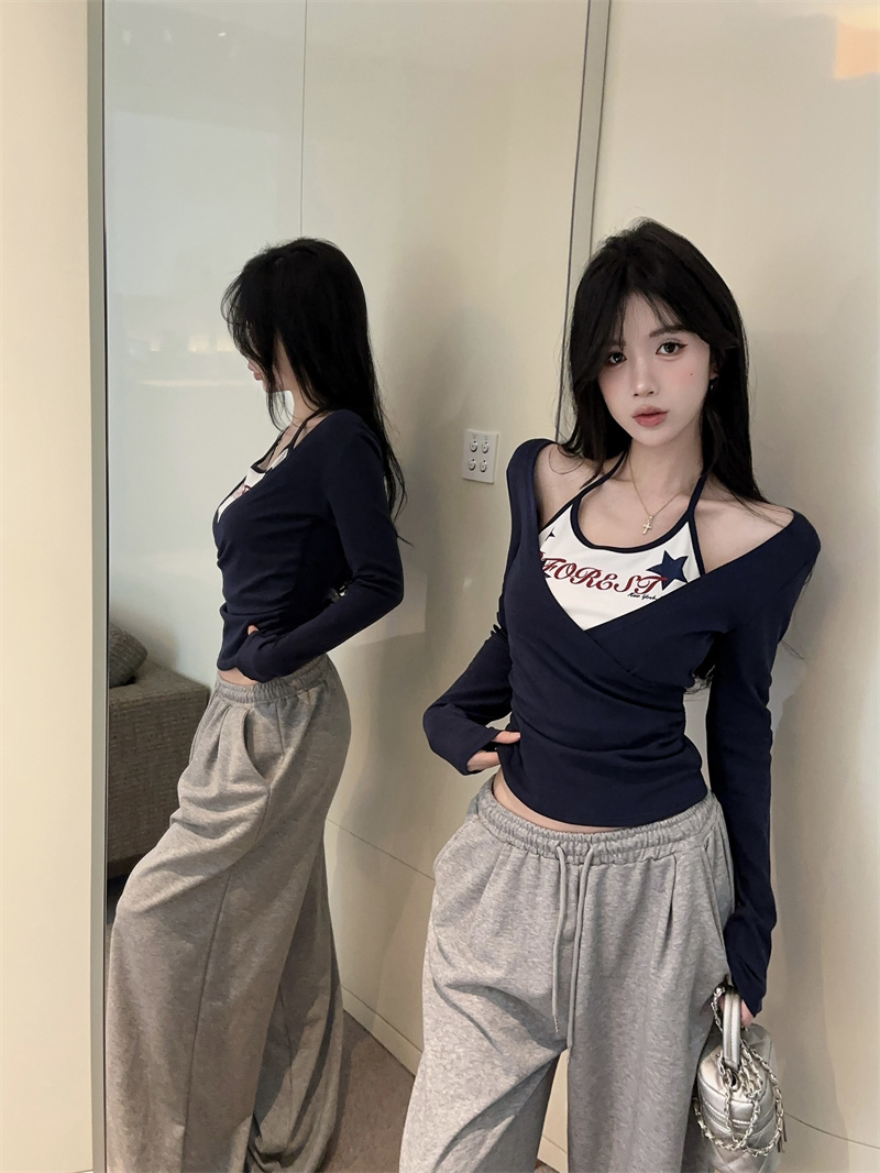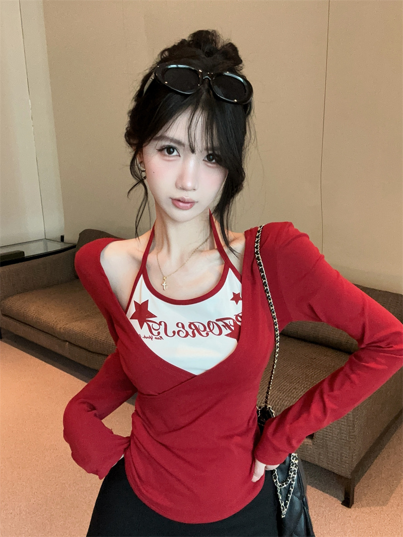 RY403# 美式假两件印花撞色长袖挂脖T恤女春季新款显瘦辣妹上衣