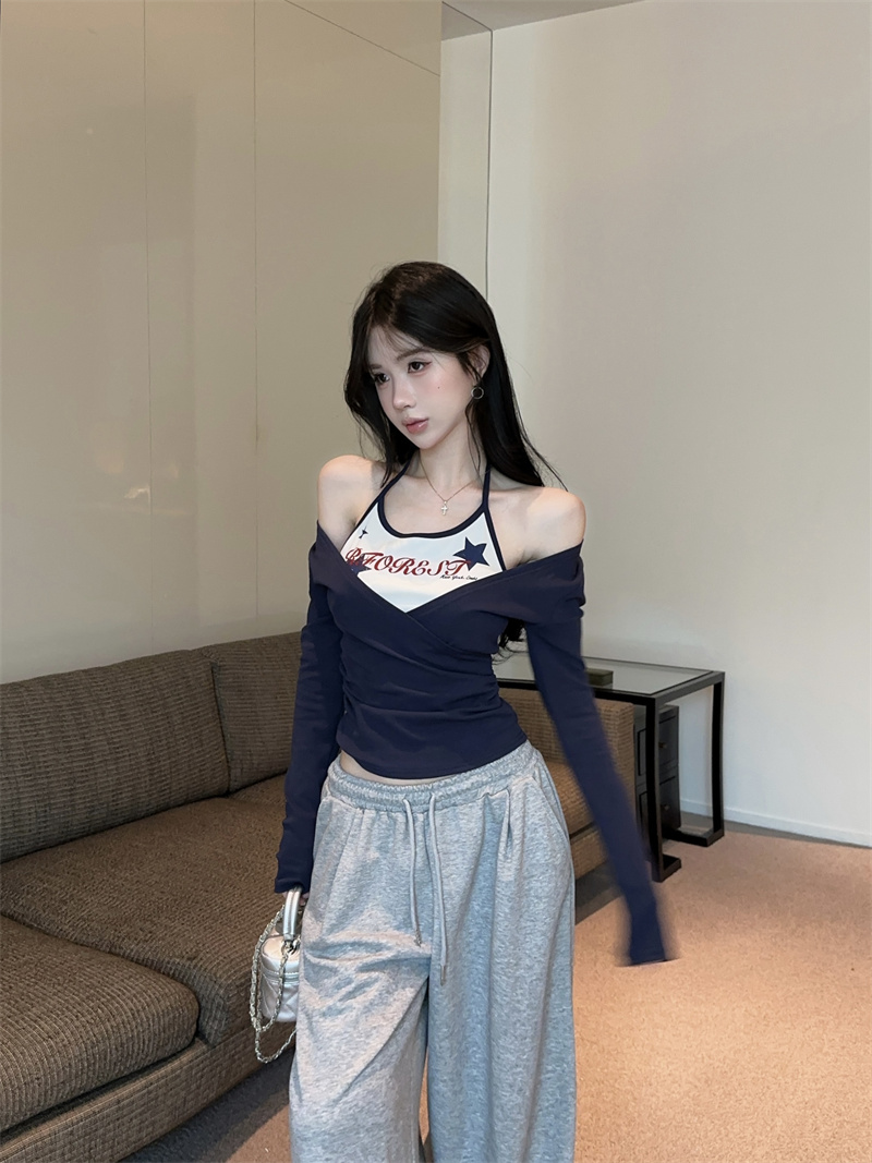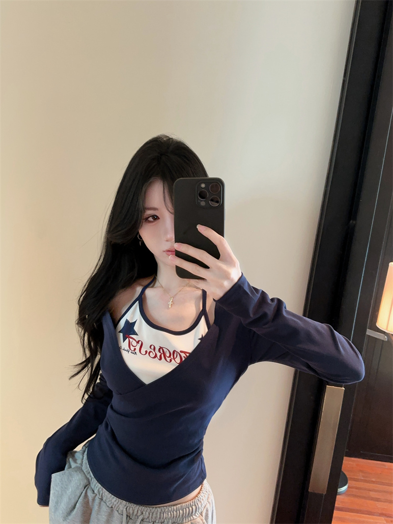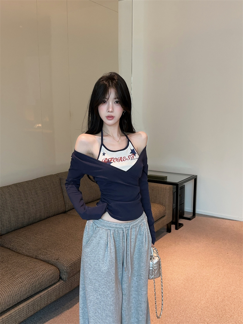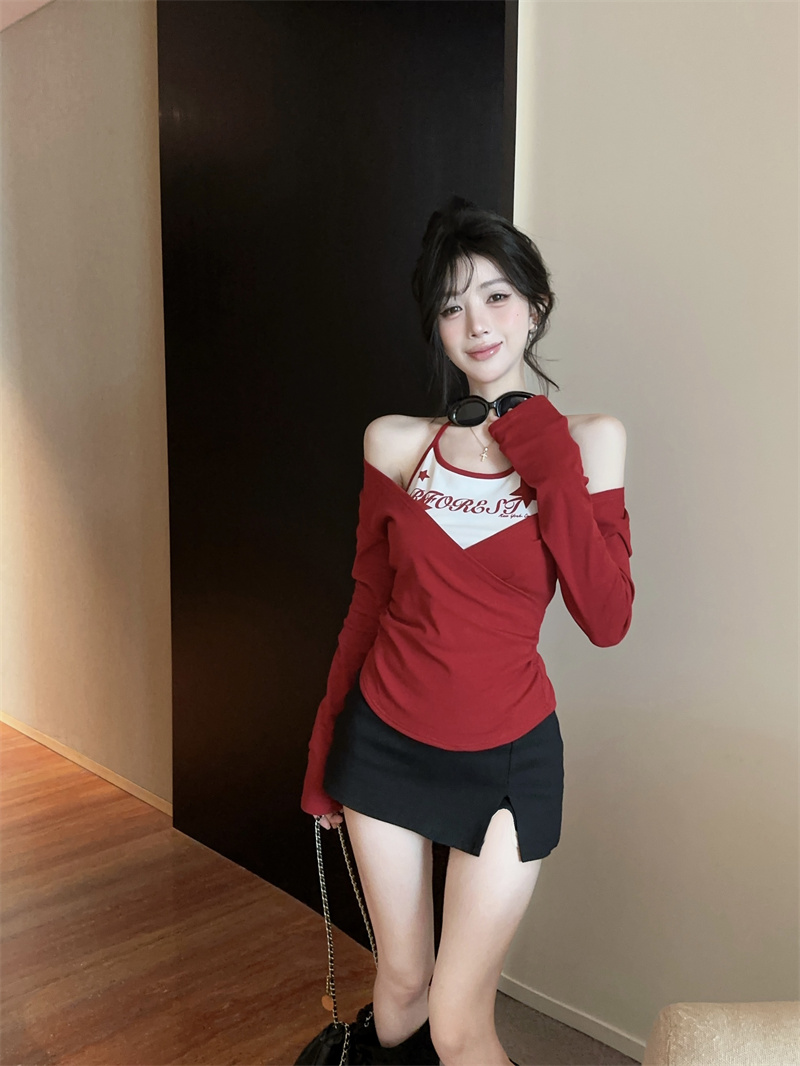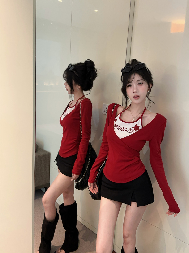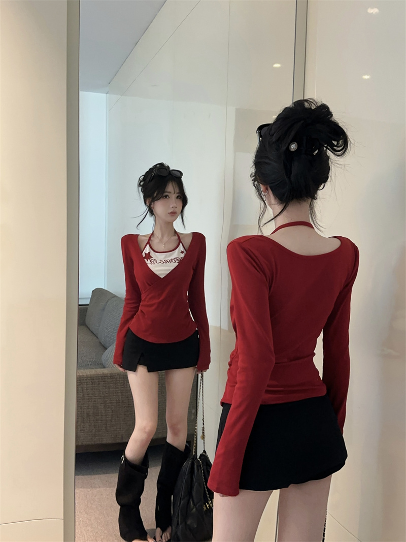 RY403# 美式假两件印花撞色长袖挂脖T恤女春季新款显瘦辣妹上衣