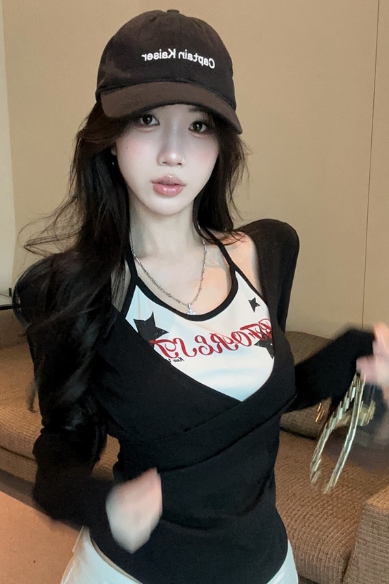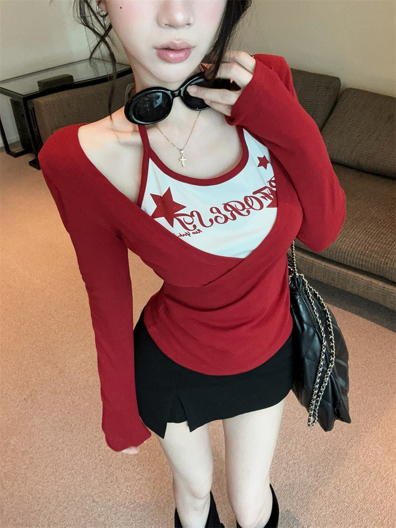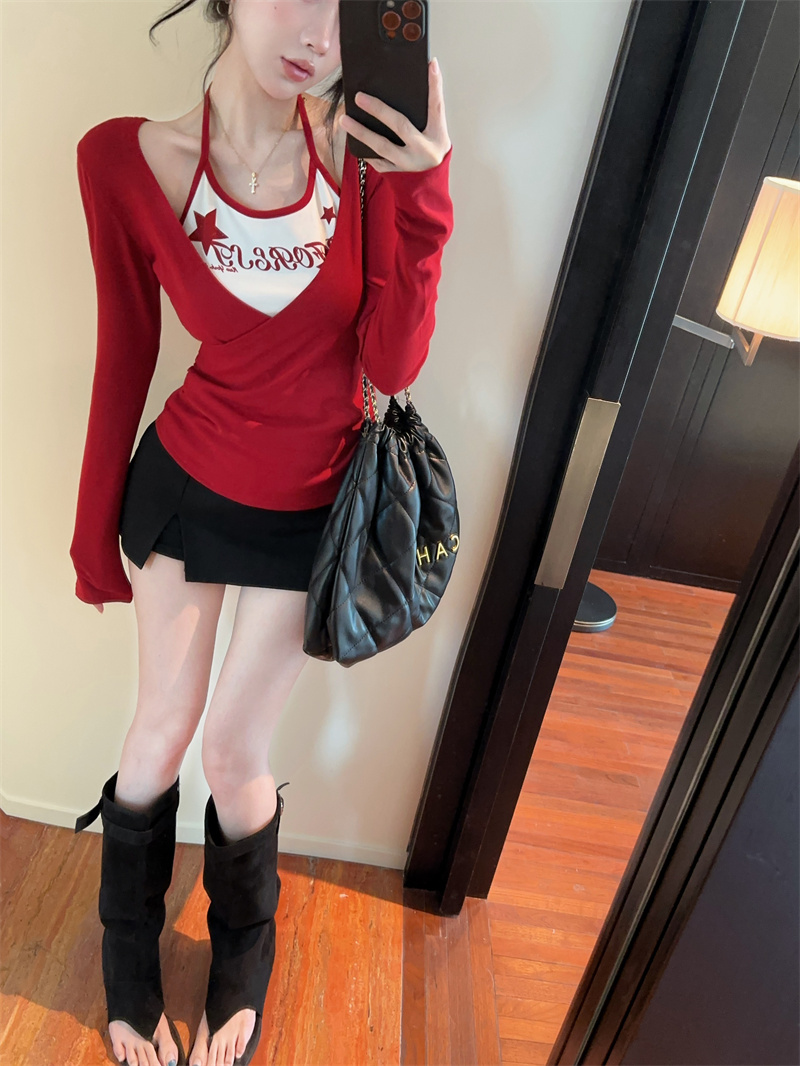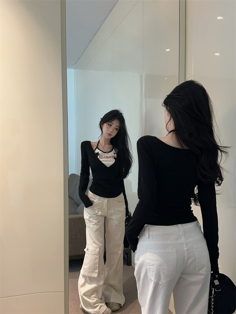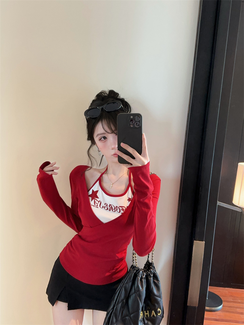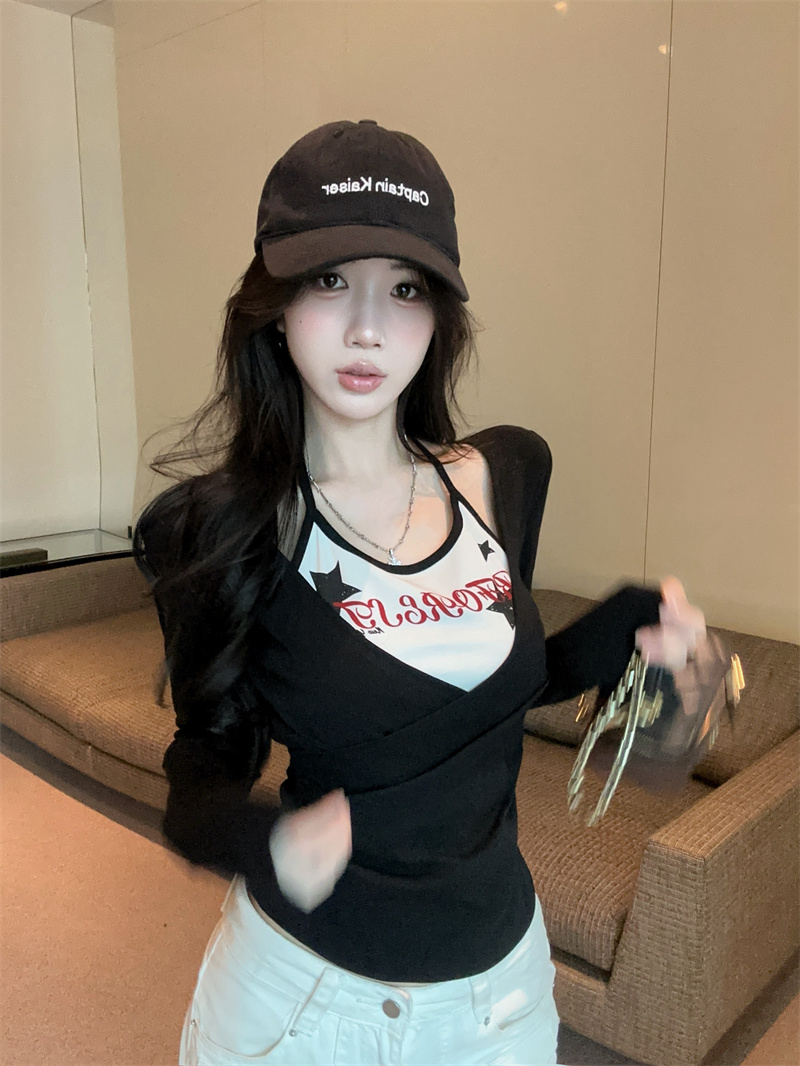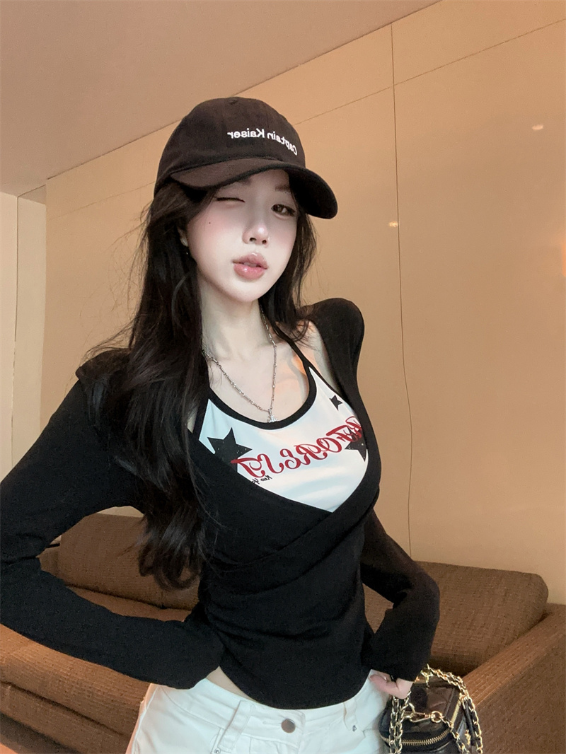 RY403# 美式假两件印花撞色长袖挂脖T恤女春季新款显瘦辣妹上衣