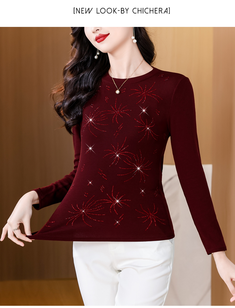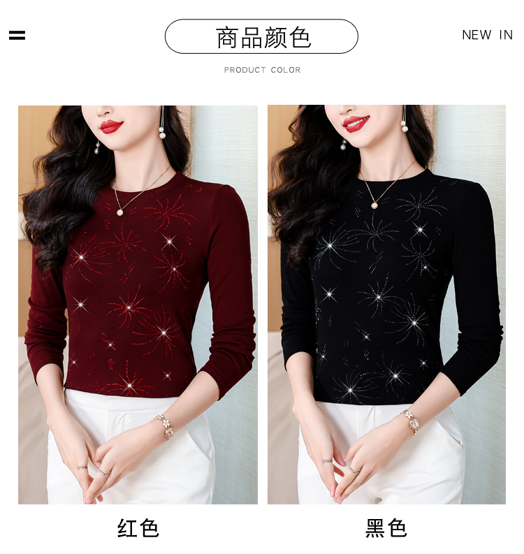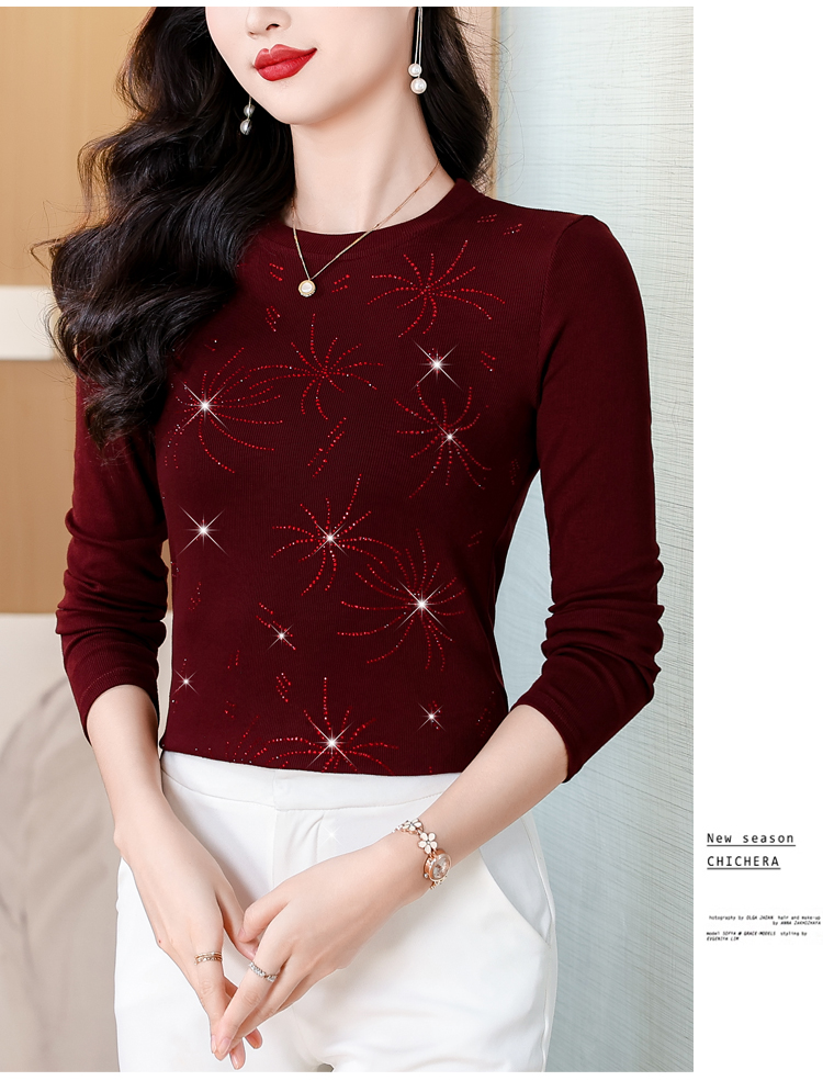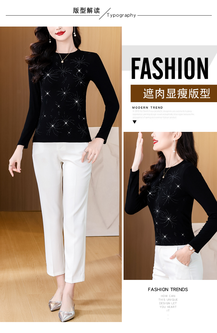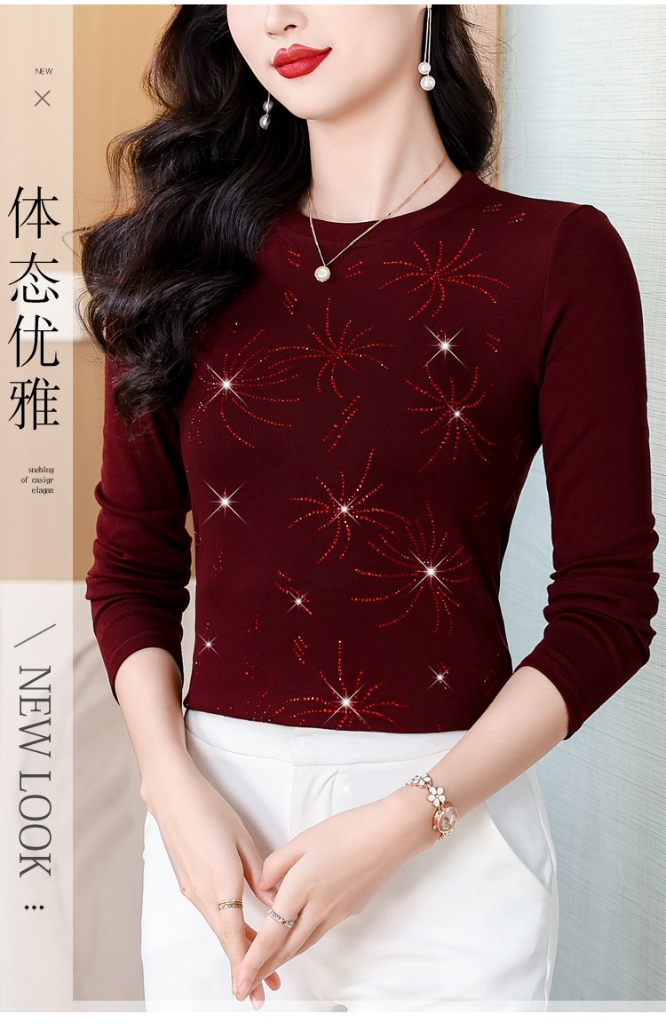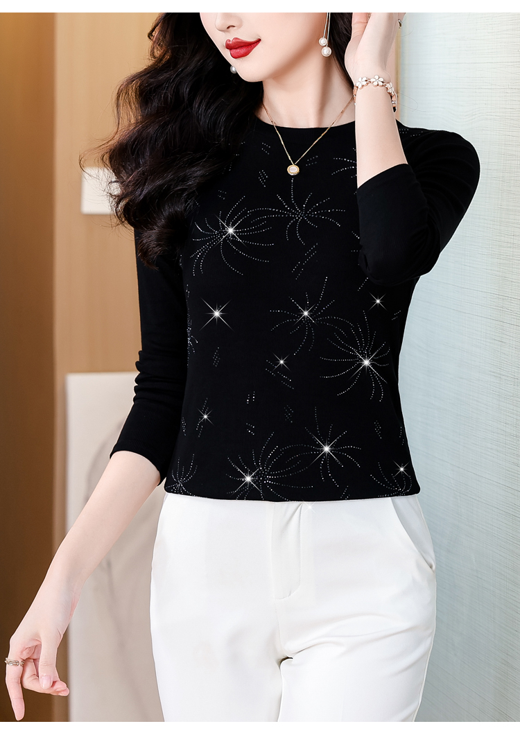 RY538# 实拍2026春季新款高级感烫彩钻烟花图案圆领长袖棉t恤洋气上衣女