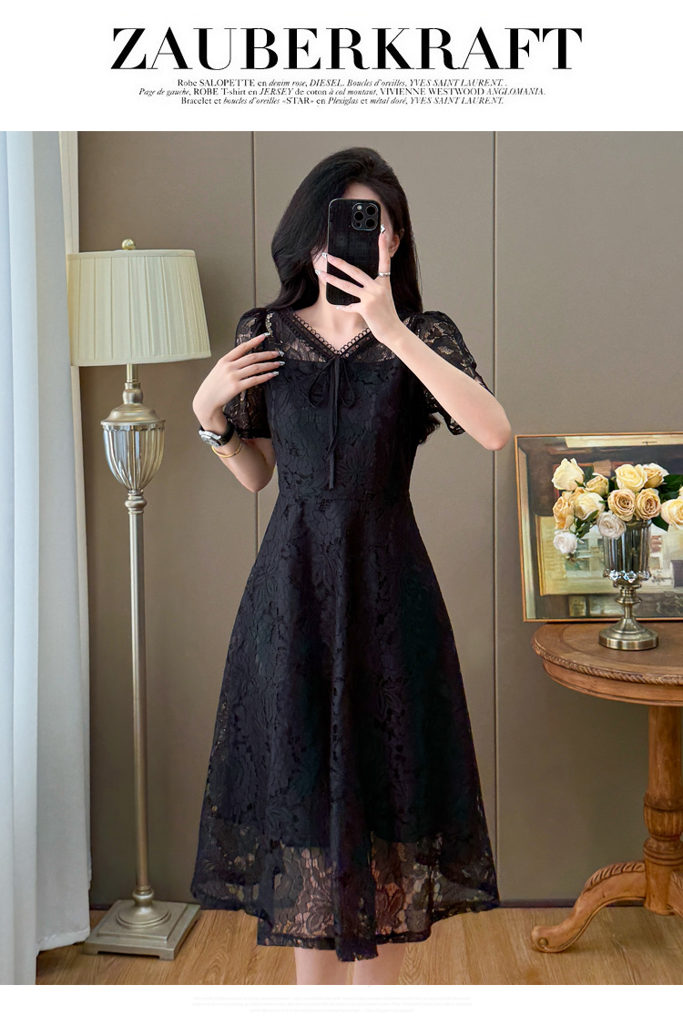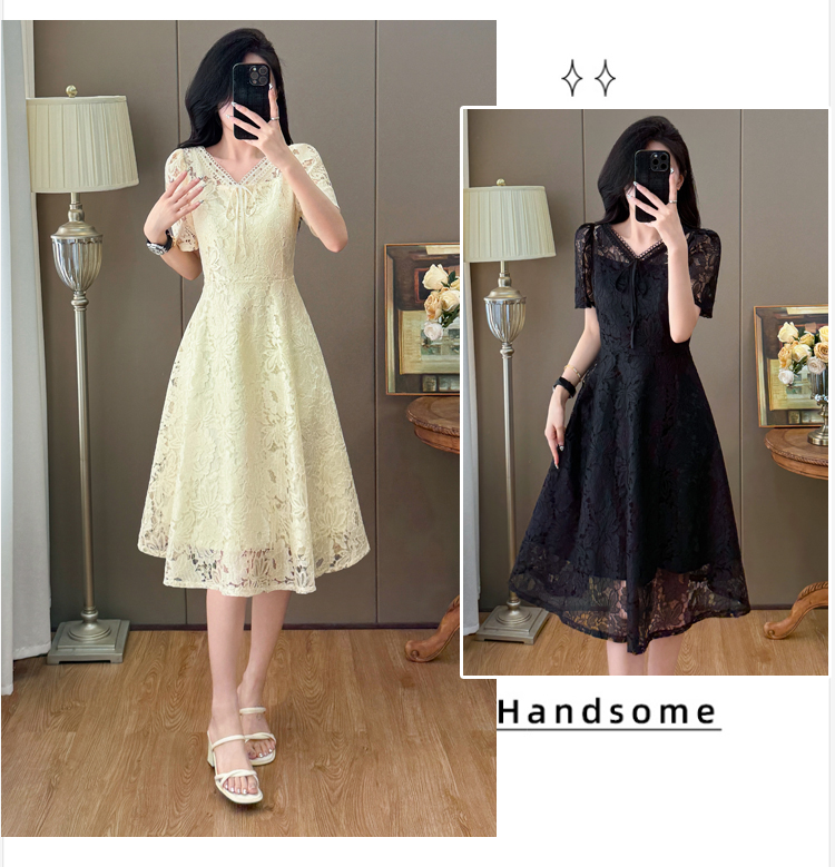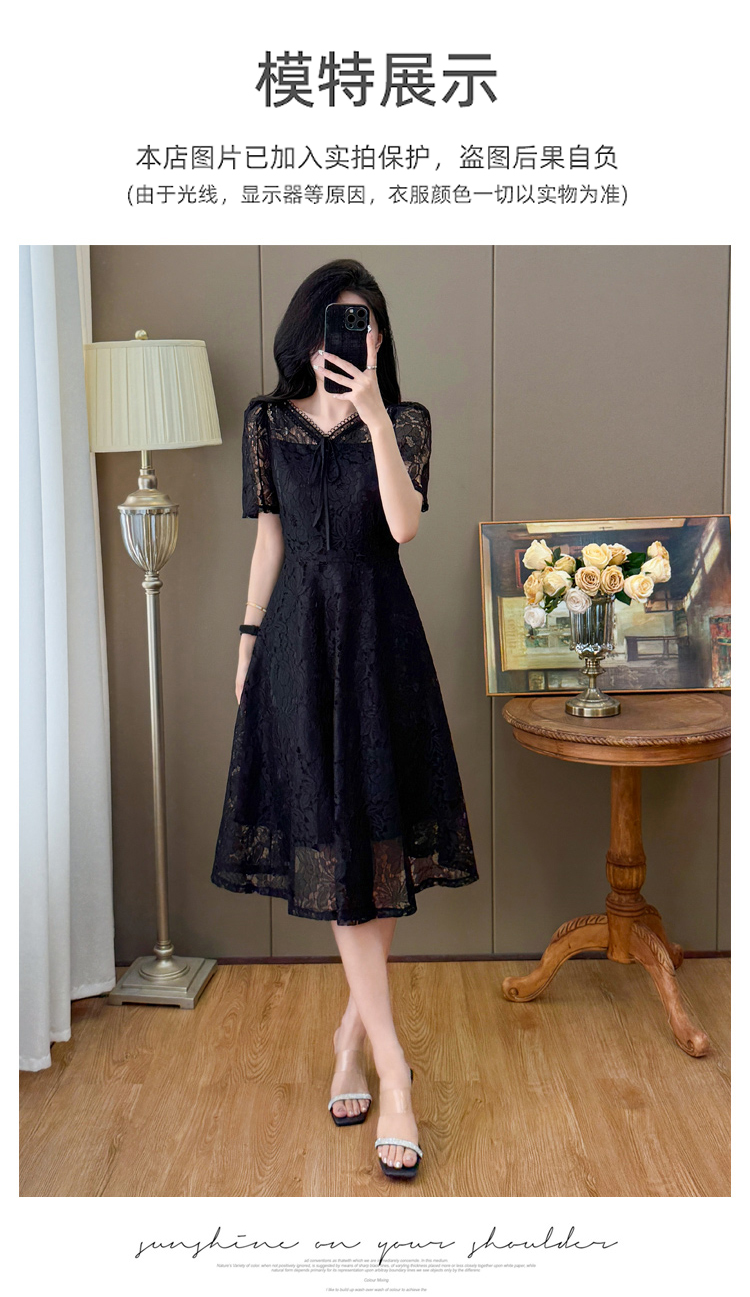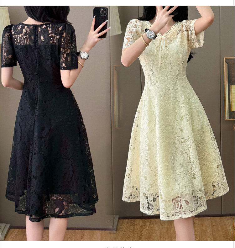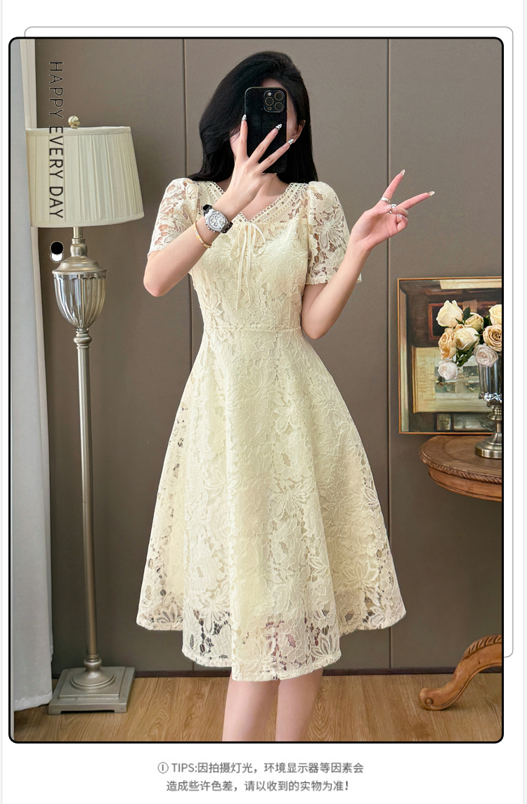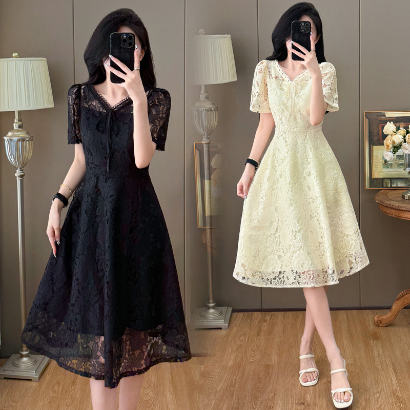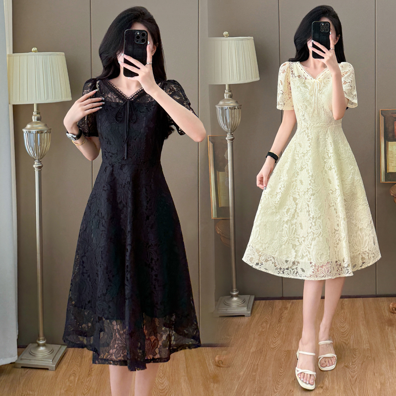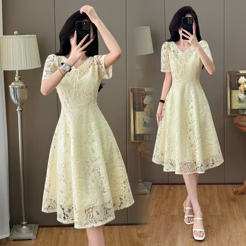 RY600# 新款大码女装法式优雅v领蕾丝绣花连衣裙2026夏季掐腰遮肚a字长裙
