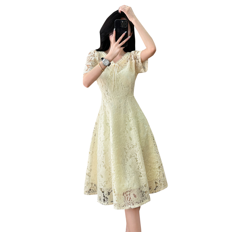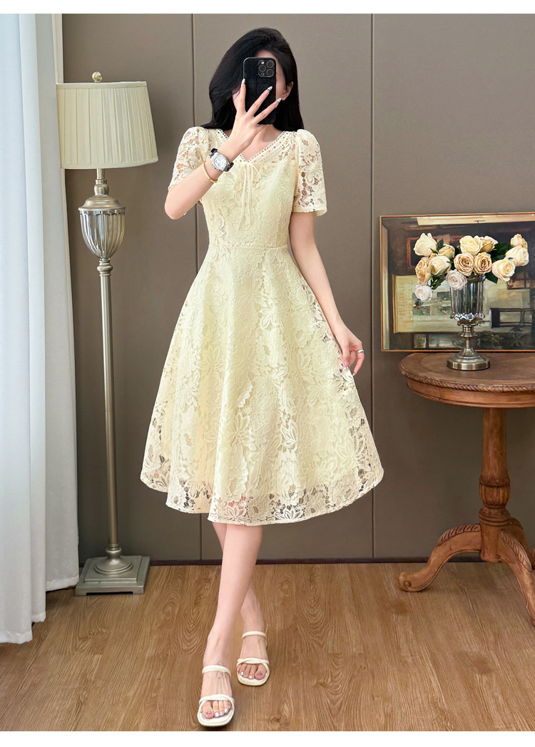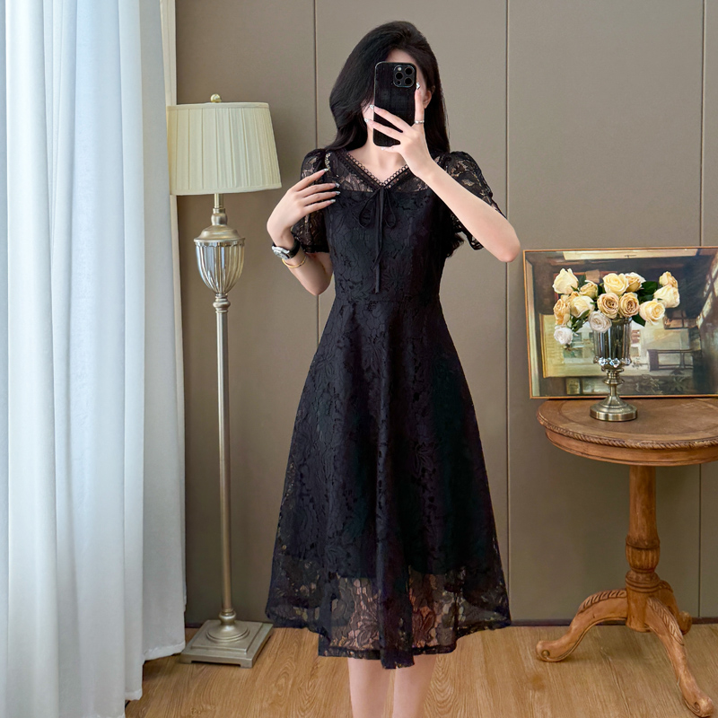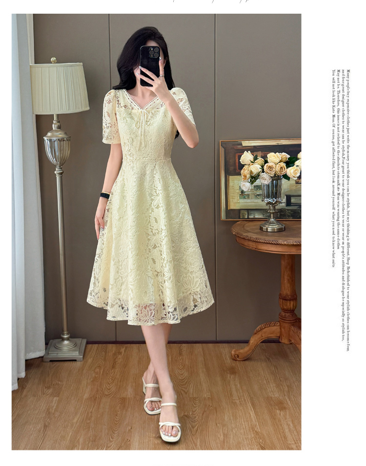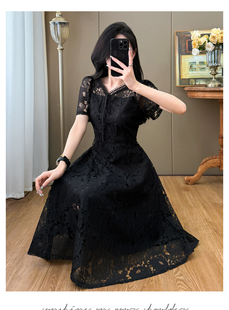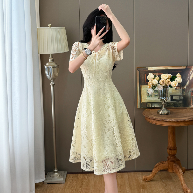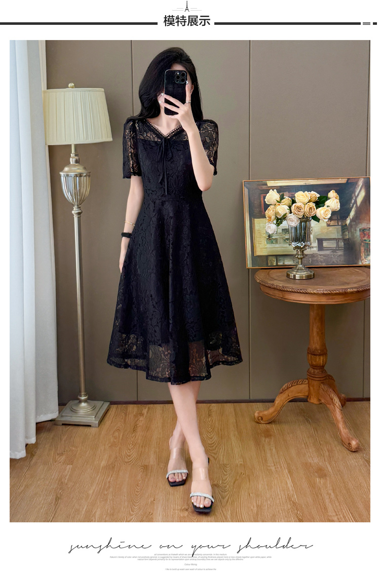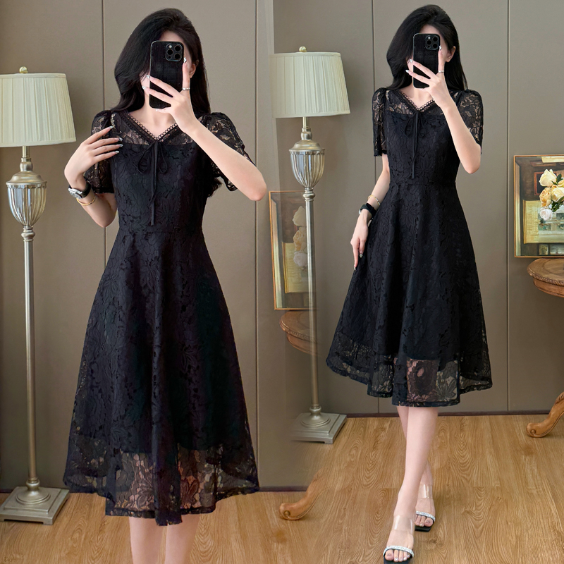 RY600# 新款大码女装法式优雅v领蕾丝绣花连衣裙2026夏季掐腰遮肚a字长裙