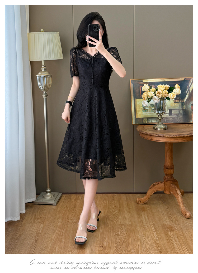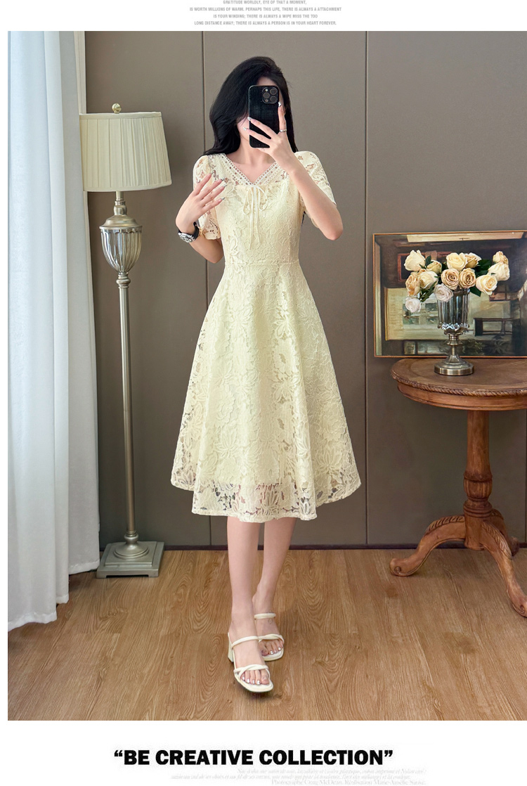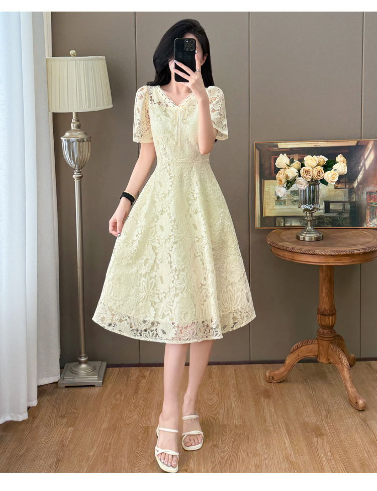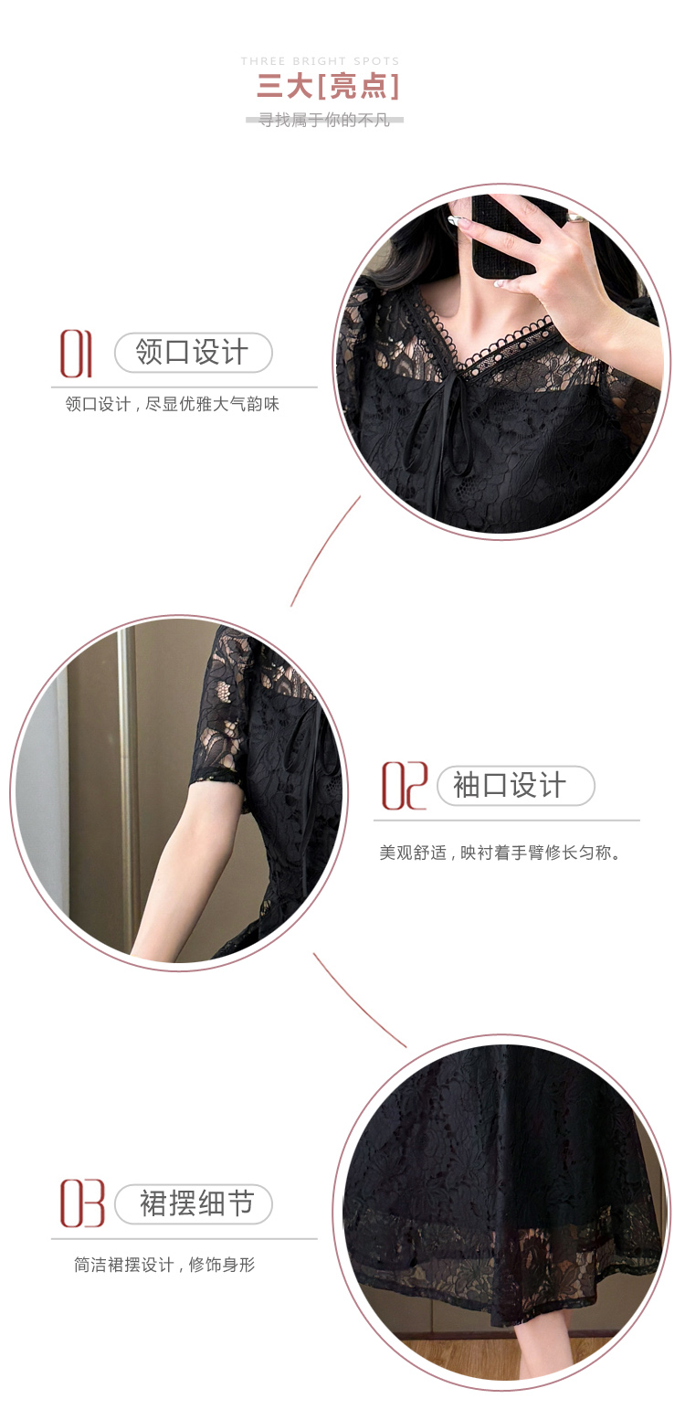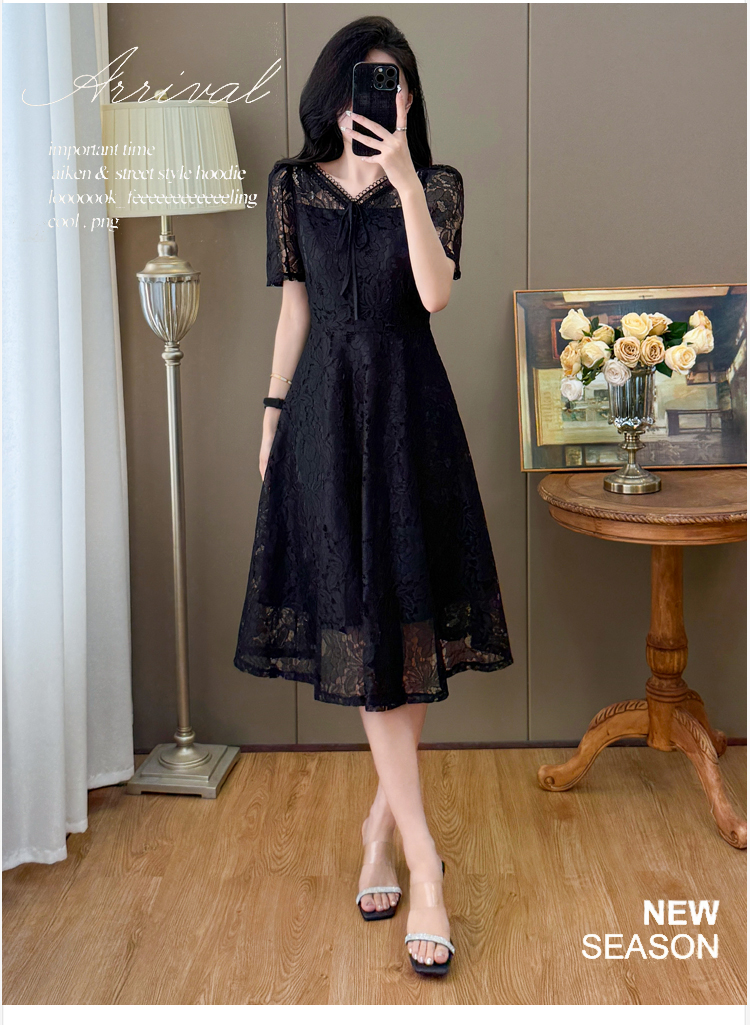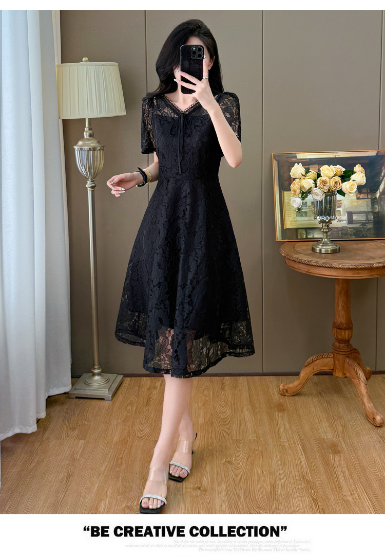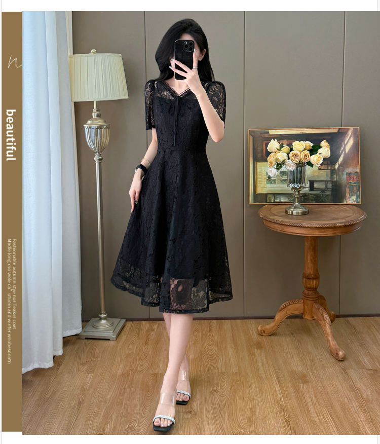 RY600# 新款大码女装法式优雅v领蕾丝绣花连衣裙2026夏季掐腰遮肚a字长裙