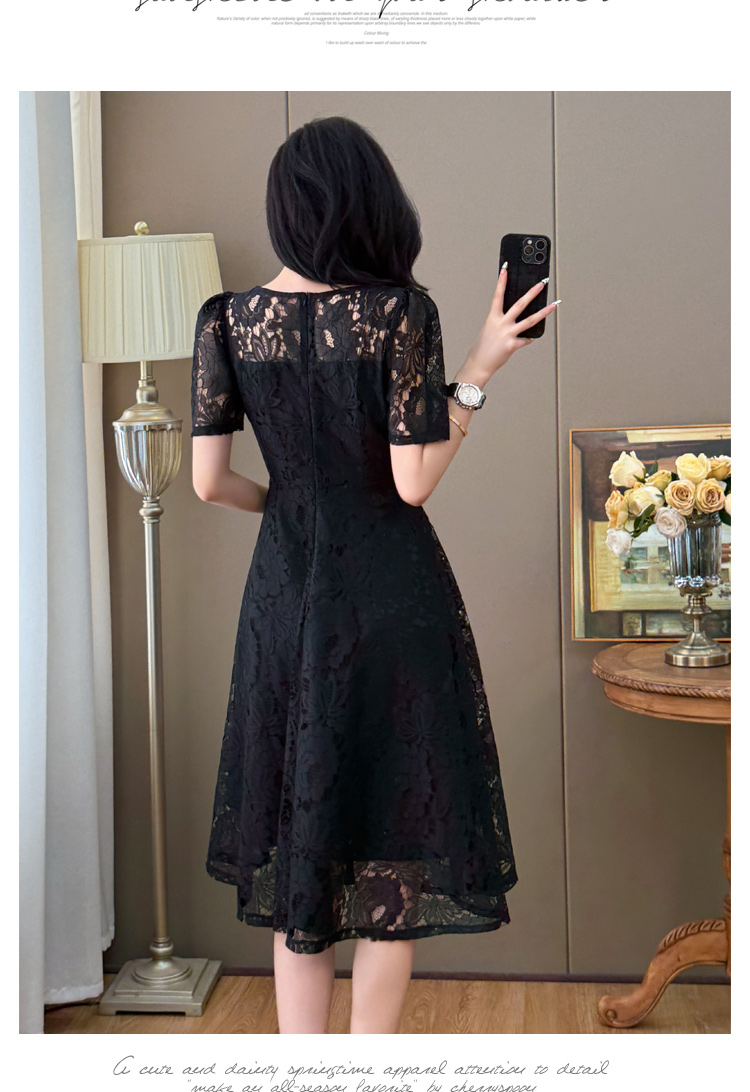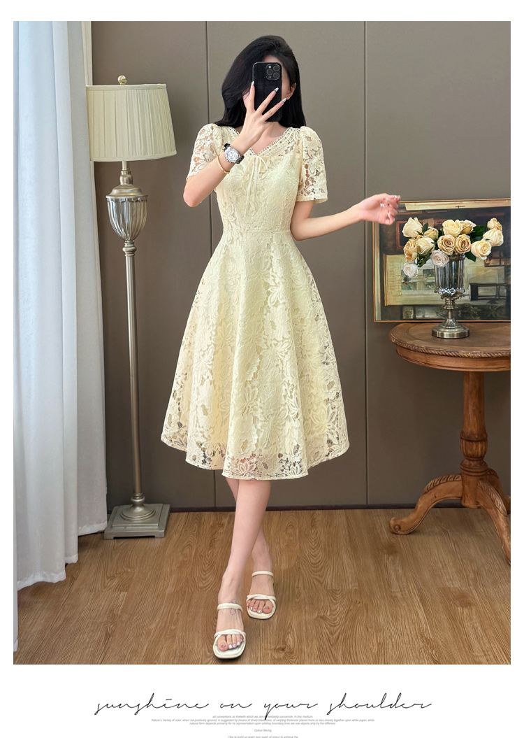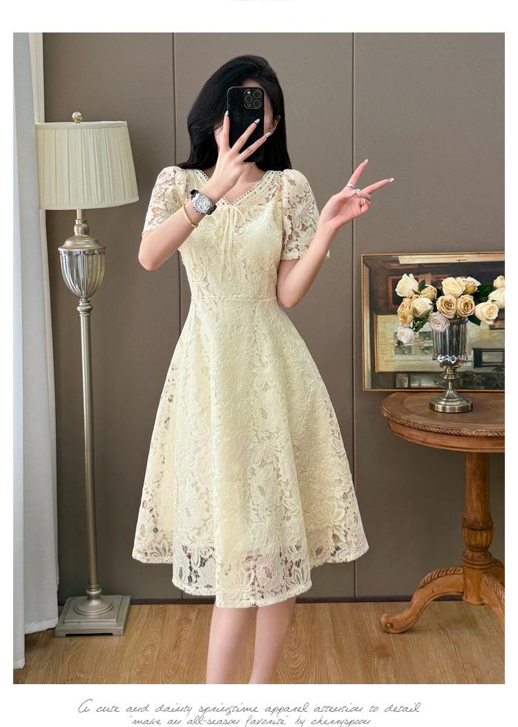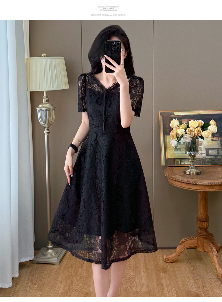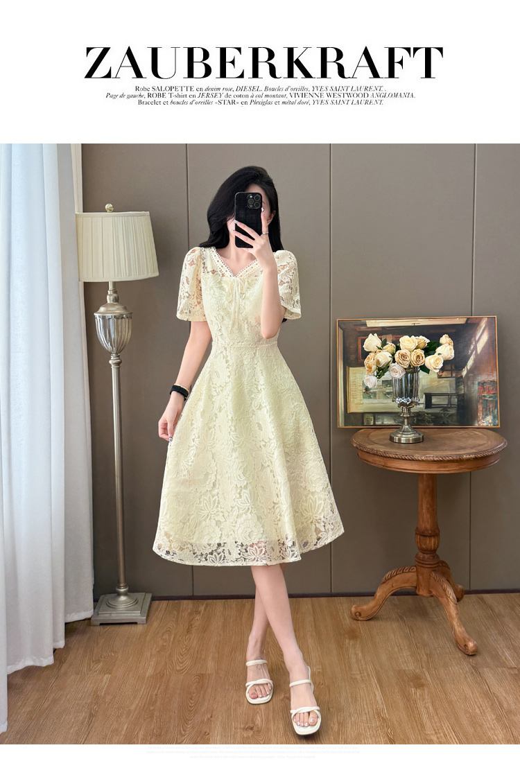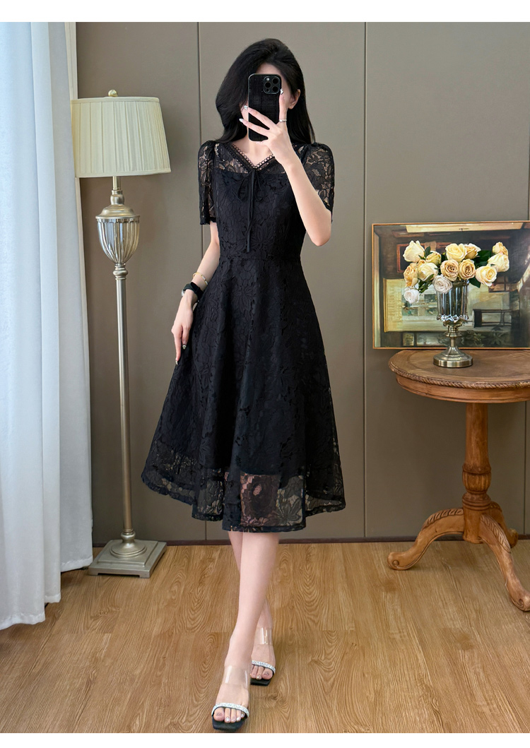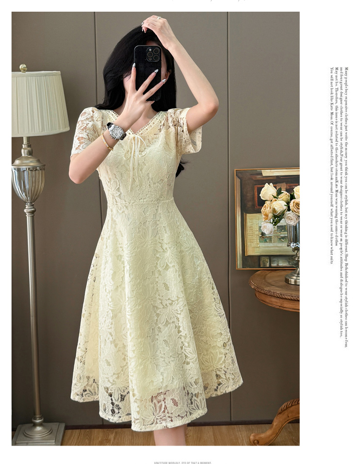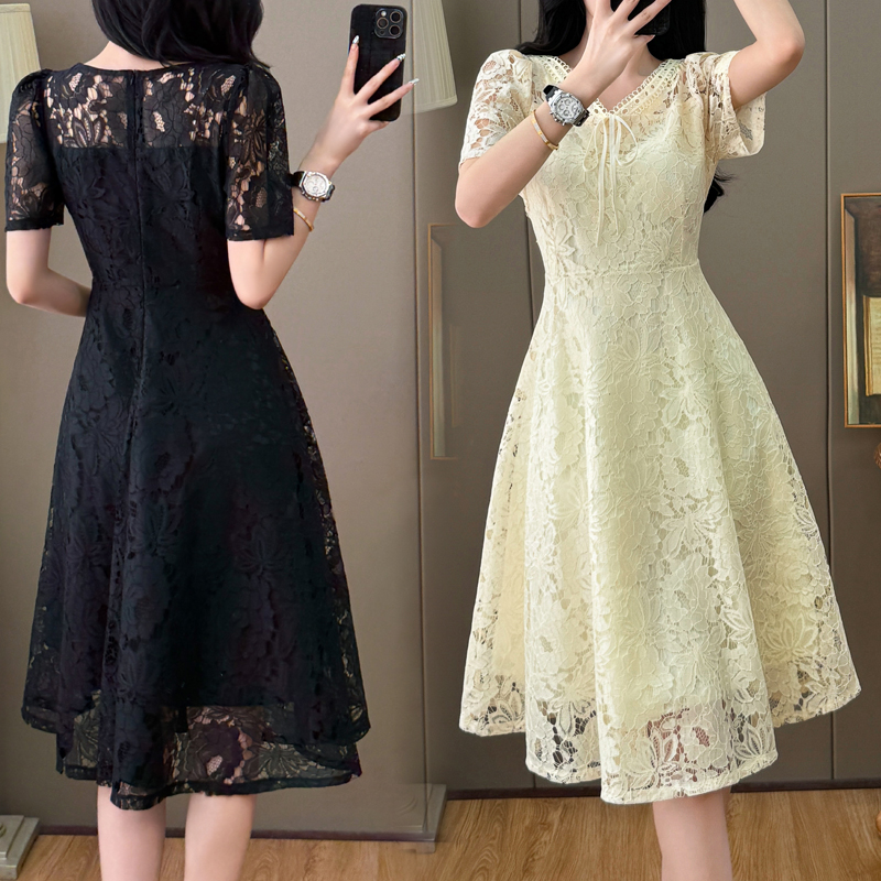 RY600# 新款大码女装法式优雅v领蕾丝绣花连衣裙2026夏季掐腰遮肚a字长裙