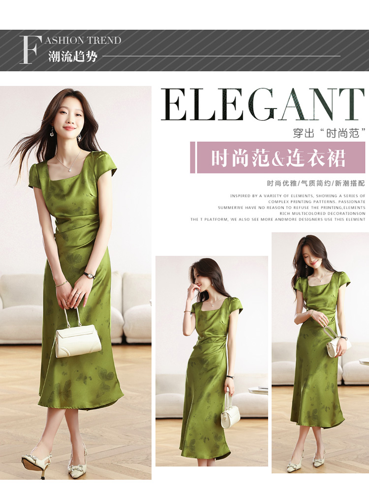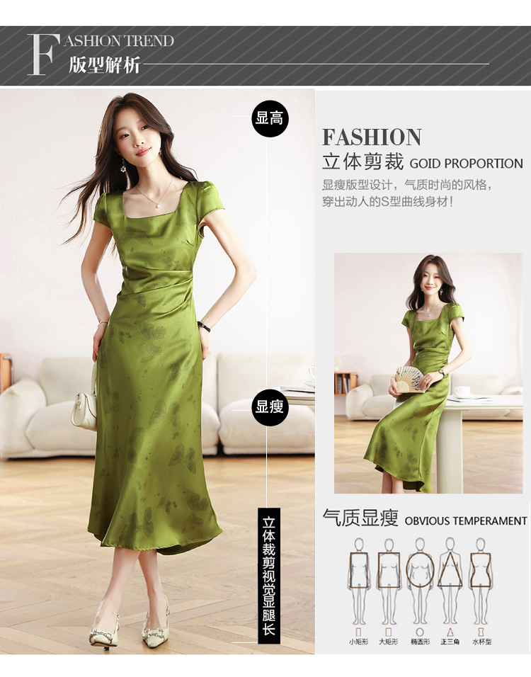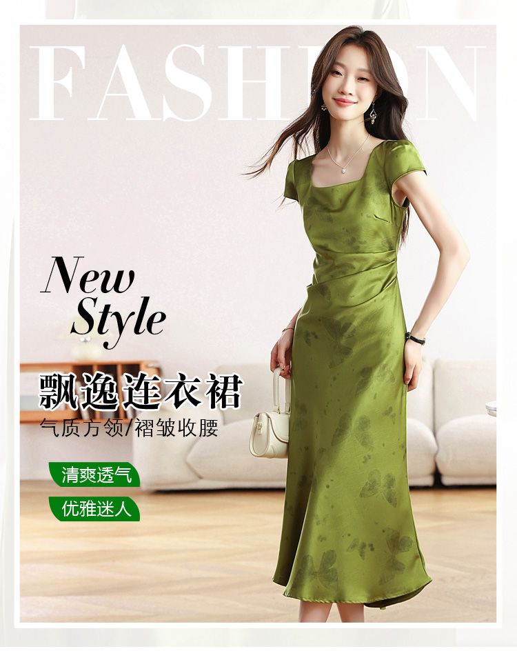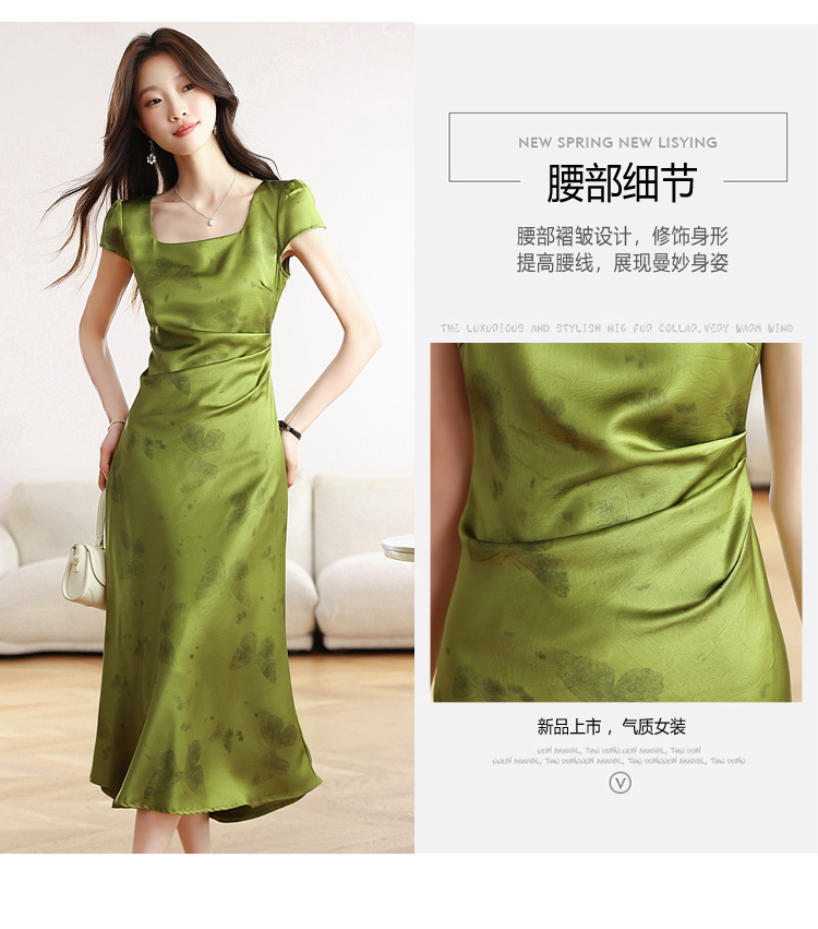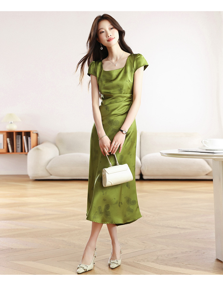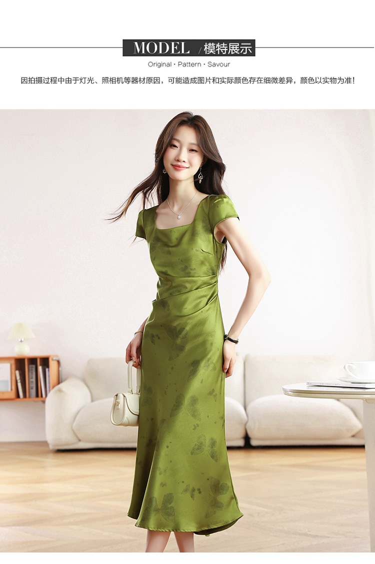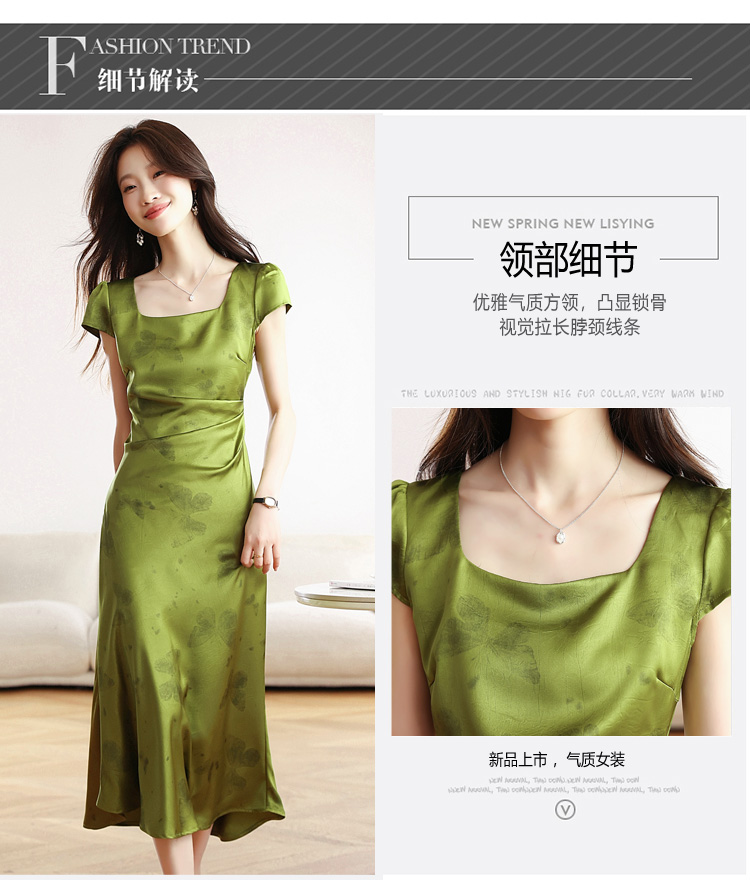 RY617# 实拍 2026夏季新原创斜裁翡绿色优雅缎面提花方领短袖连衣裙