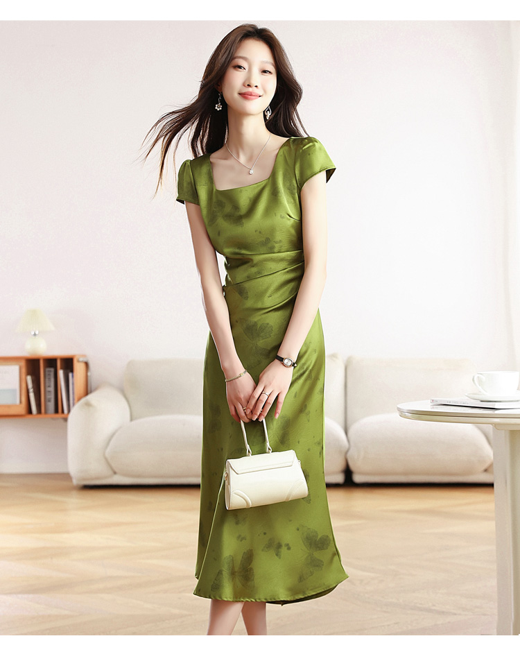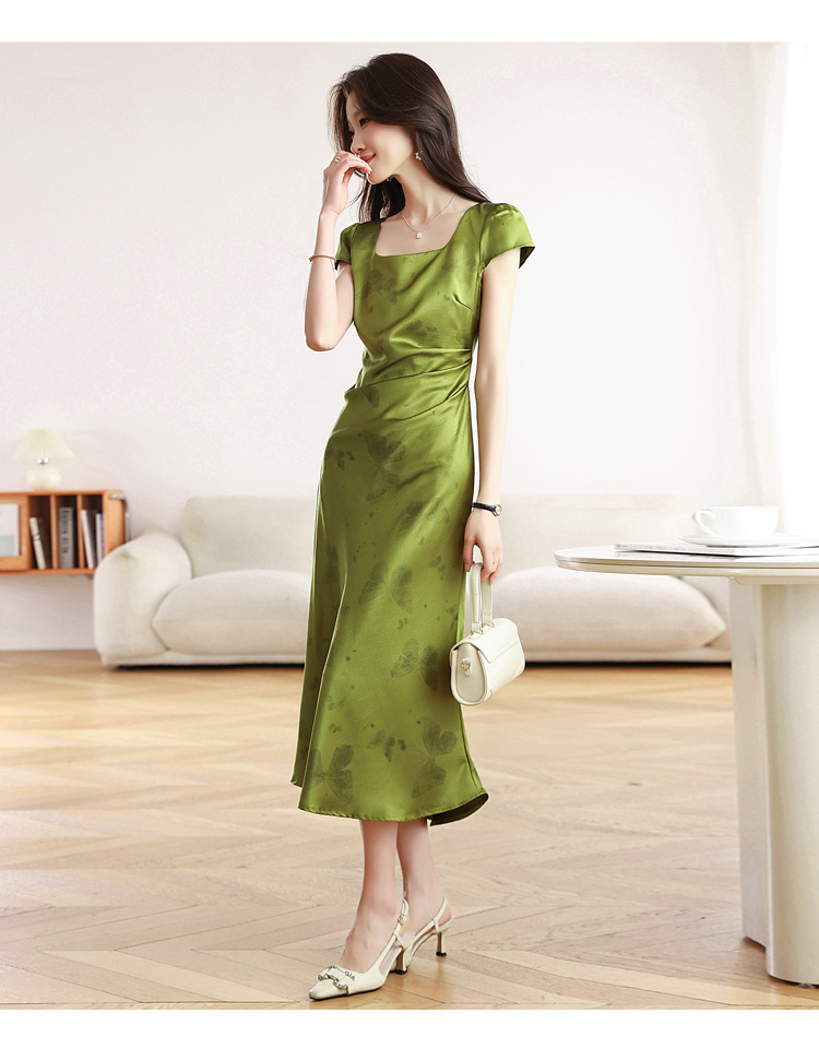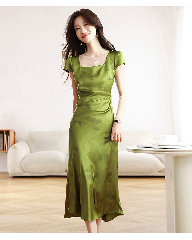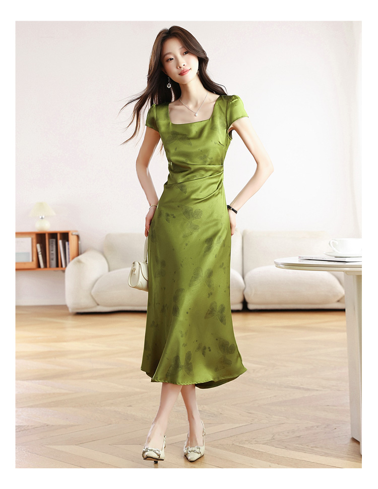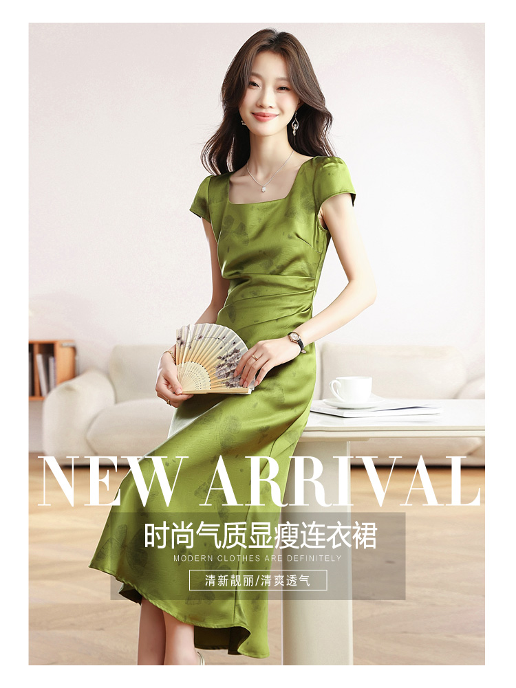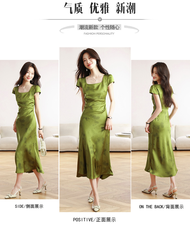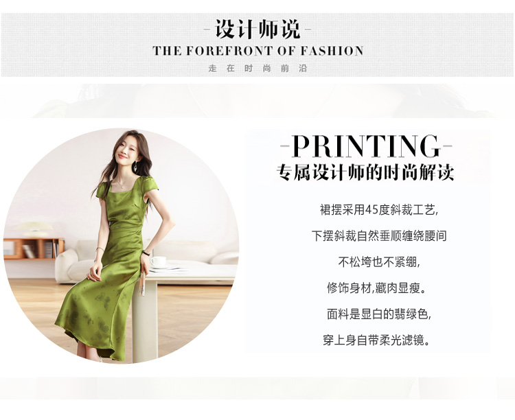 RY617# 实拍 2026夏季新原创斜裁翡绿色优雅缎面提花方领短袖连衣裙