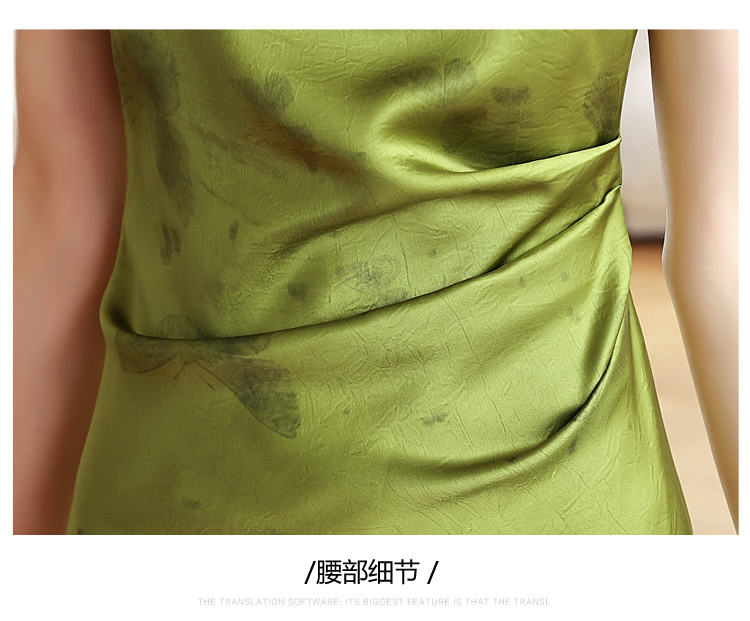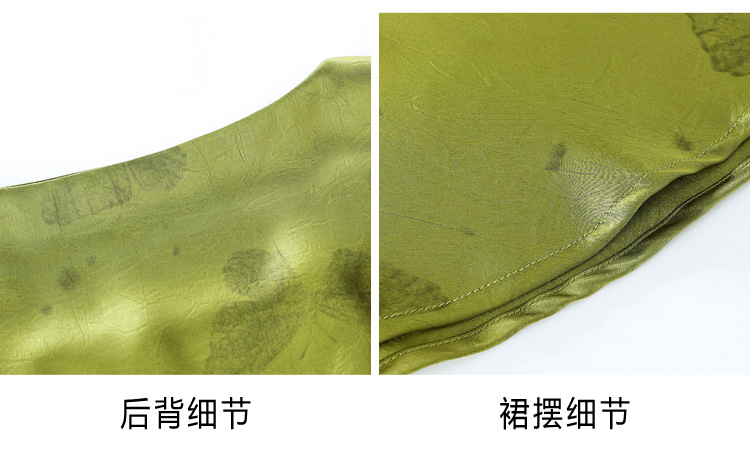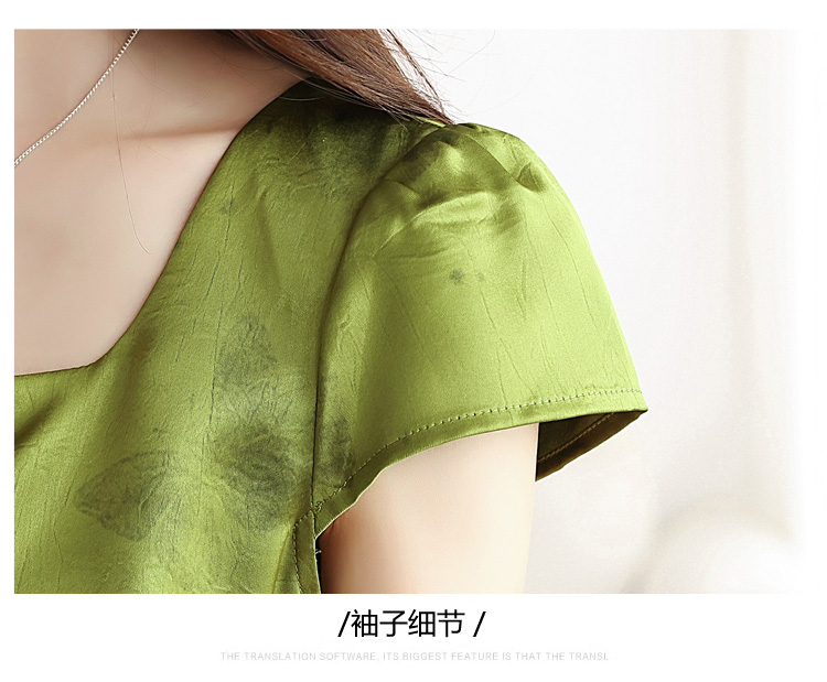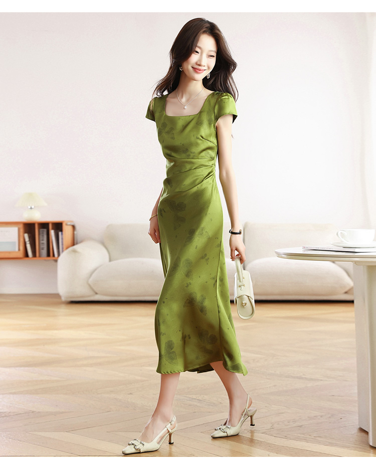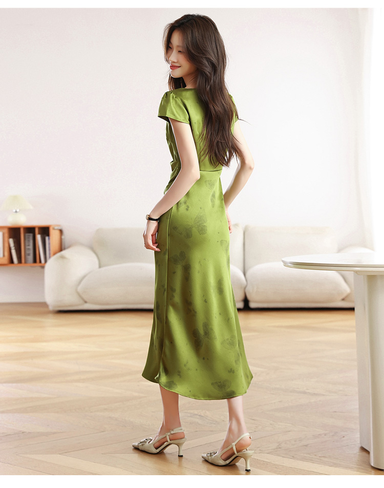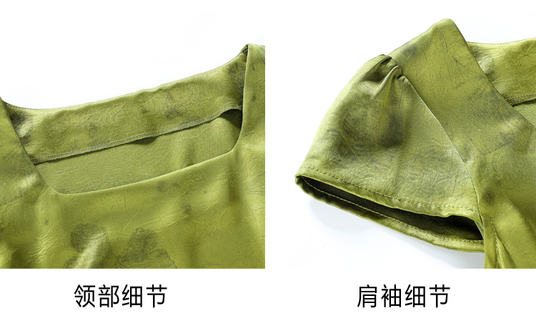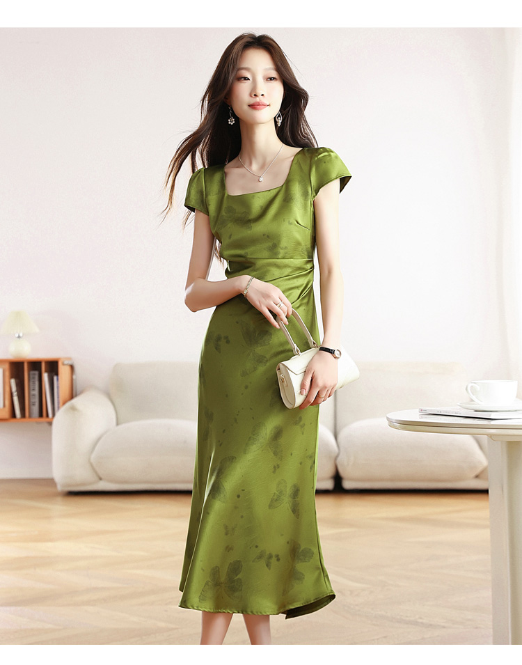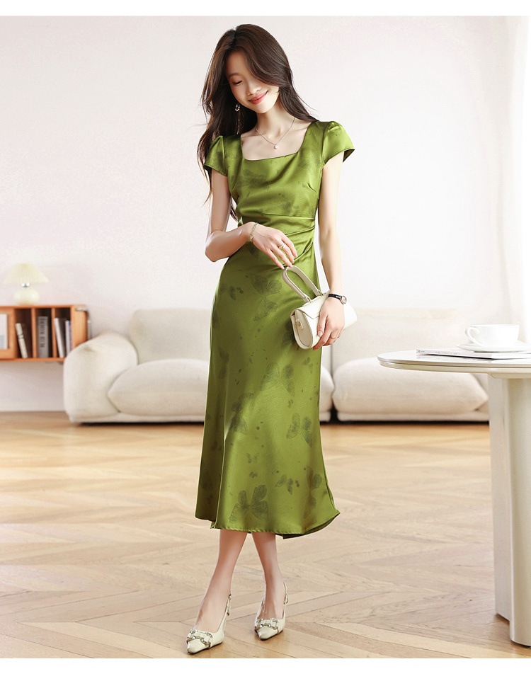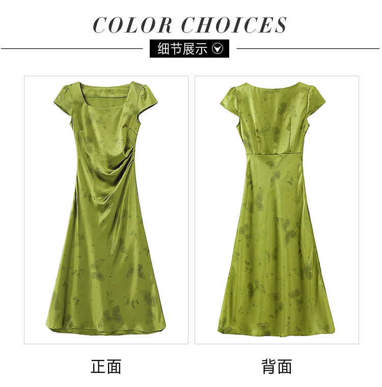 RY617# 实拍 2026夏季新原创斜裁翡绿色优雅缎面提花方领短袖连衣裙
