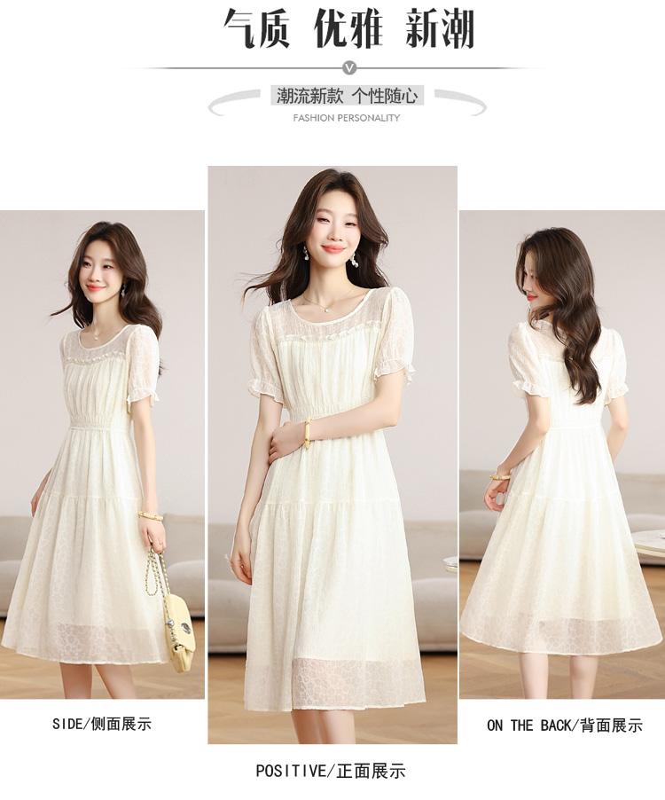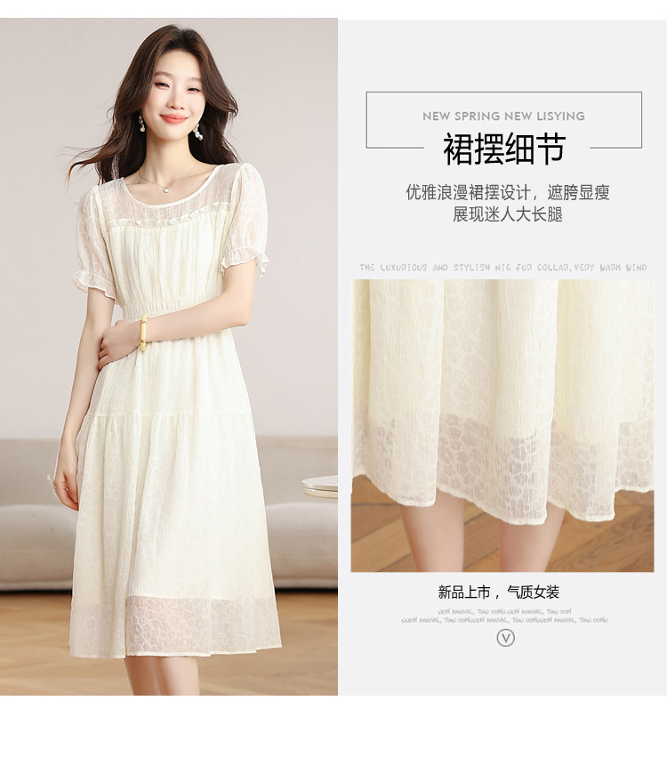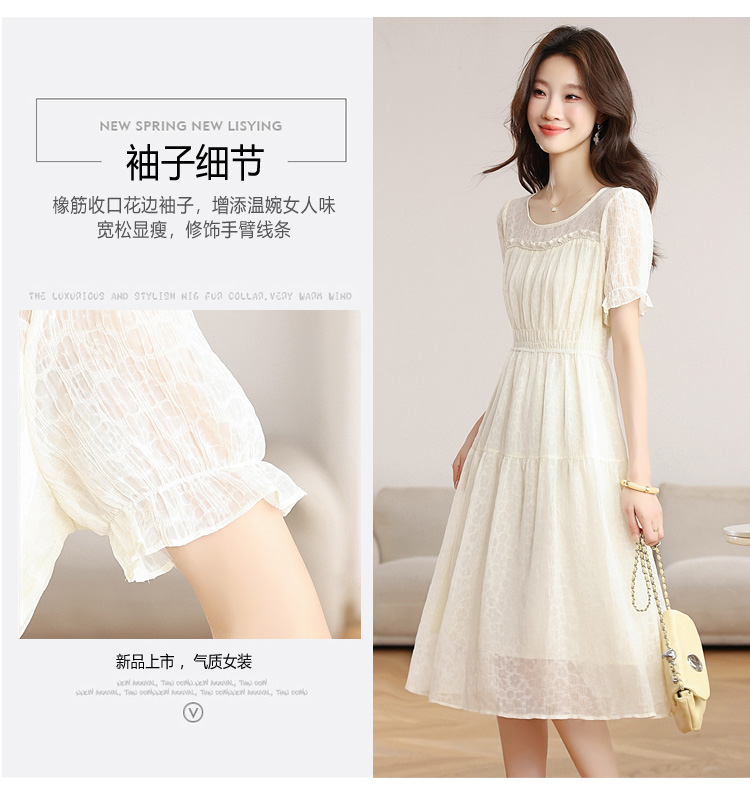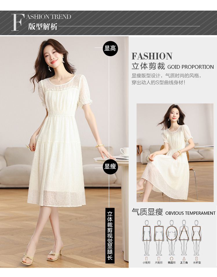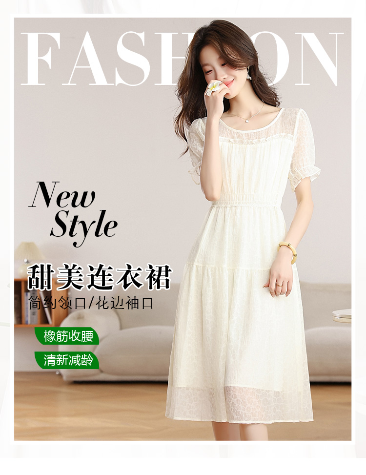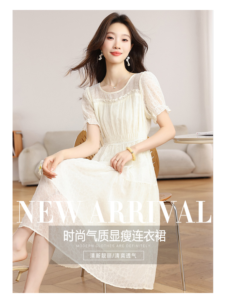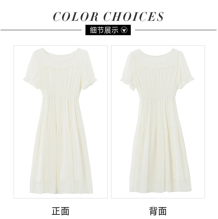 RY620# 实拍小个子白色雪纺连衣裙女新款夏季气质圆领收腰遮肚子a字裙子