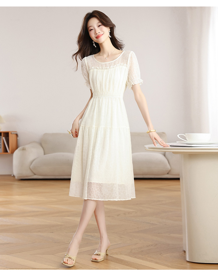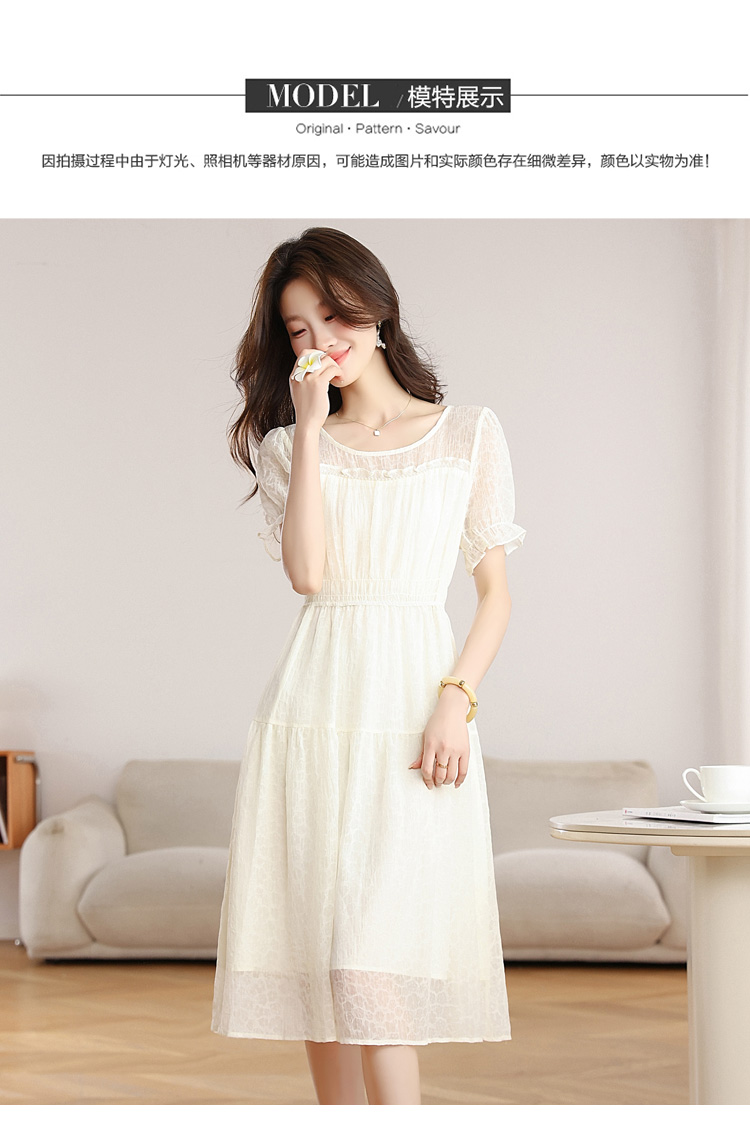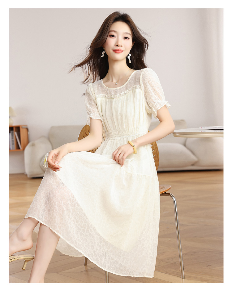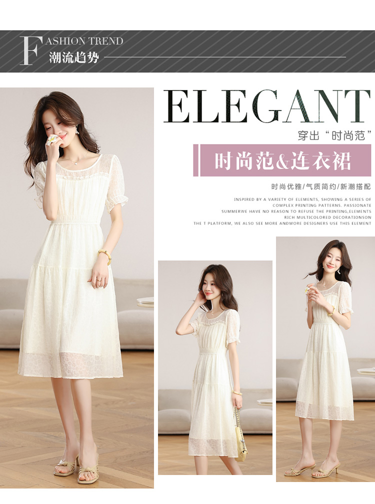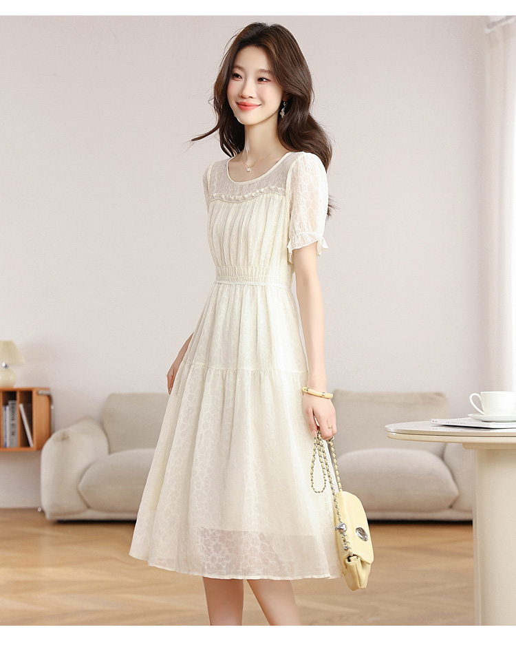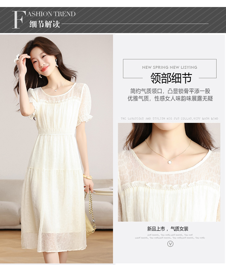 RY620# 实拍小个子白色雪纺连衣裙女新款夏季气质圆领收腰遮肚子a字裙子