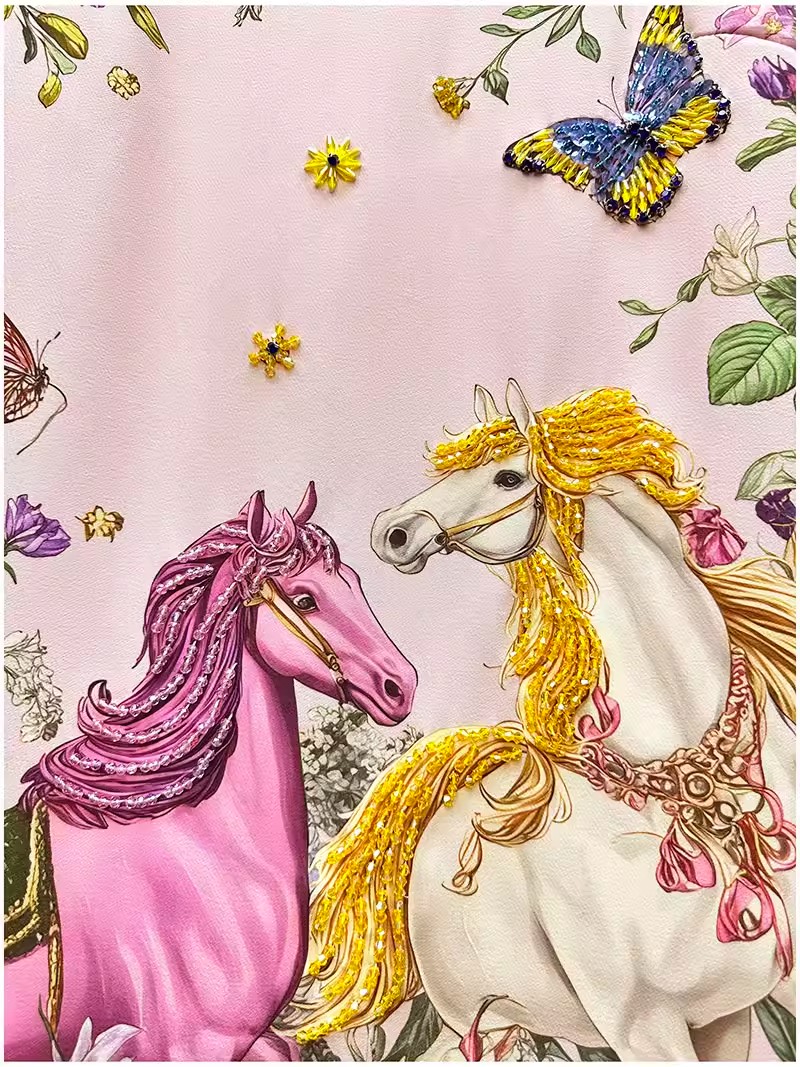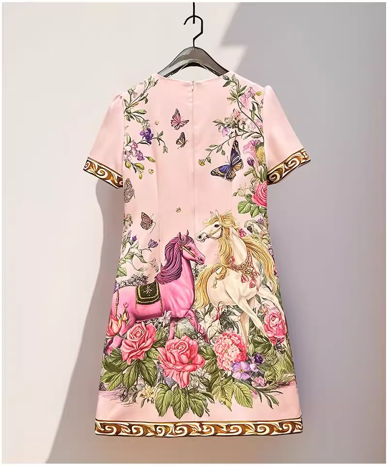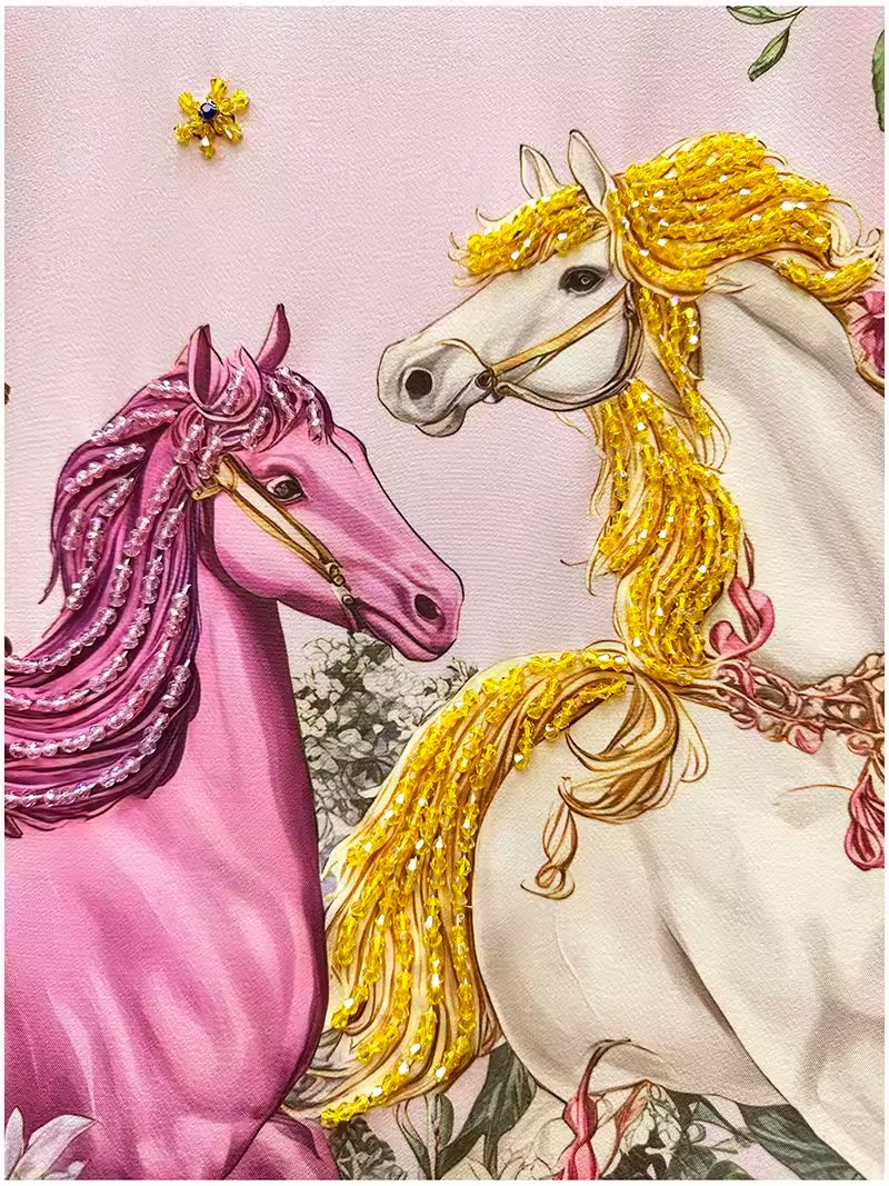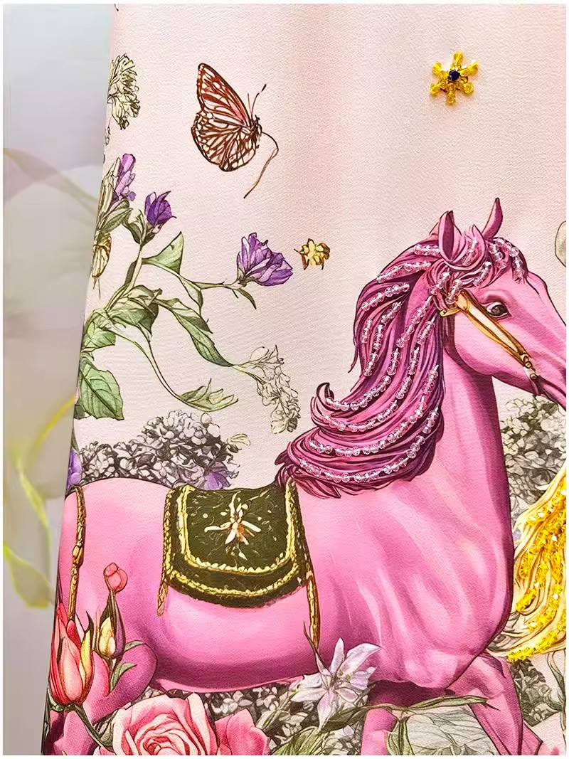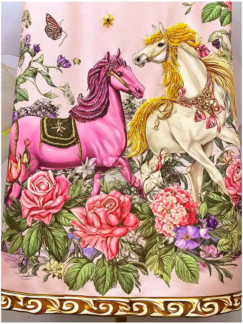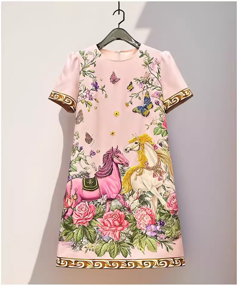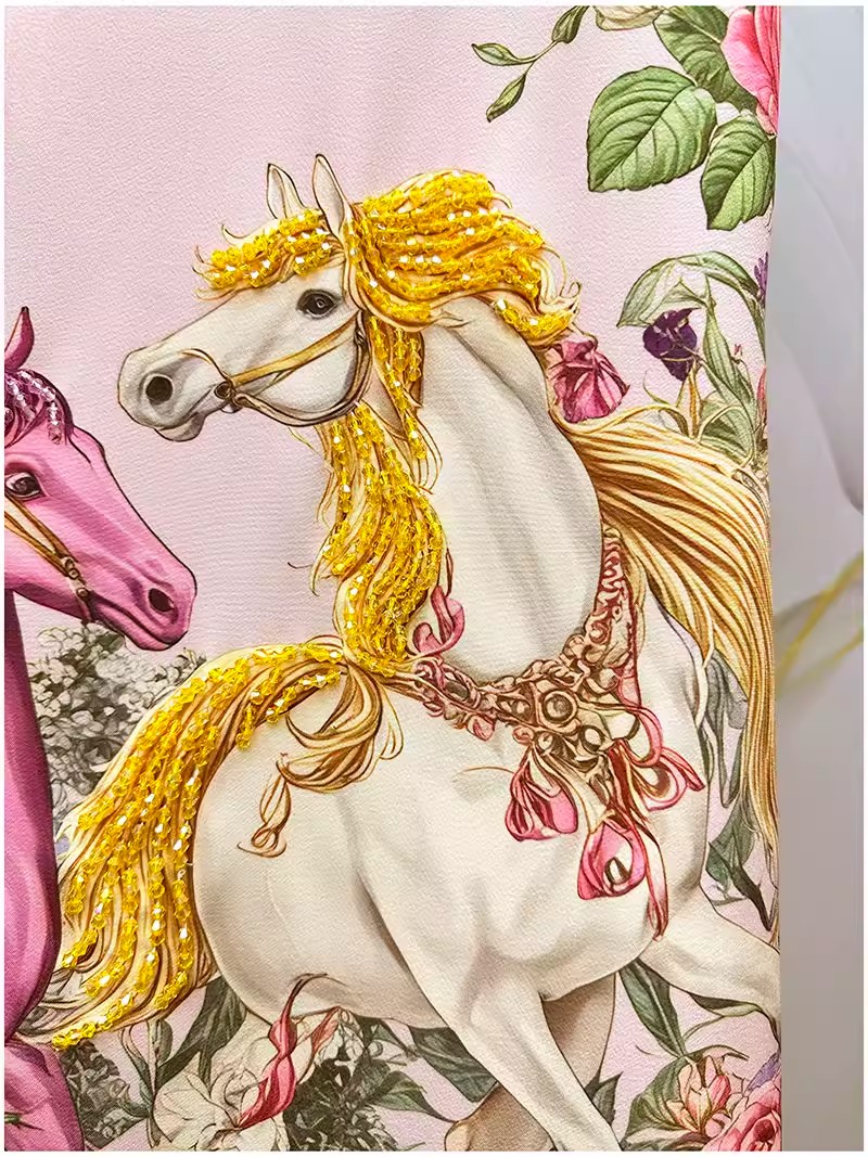 RY649# 马到成功~2026夏季新款女装时尚印花重工订珠双马轻奢名媛连衣裙