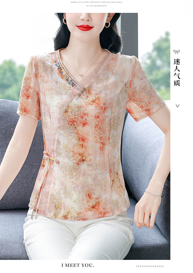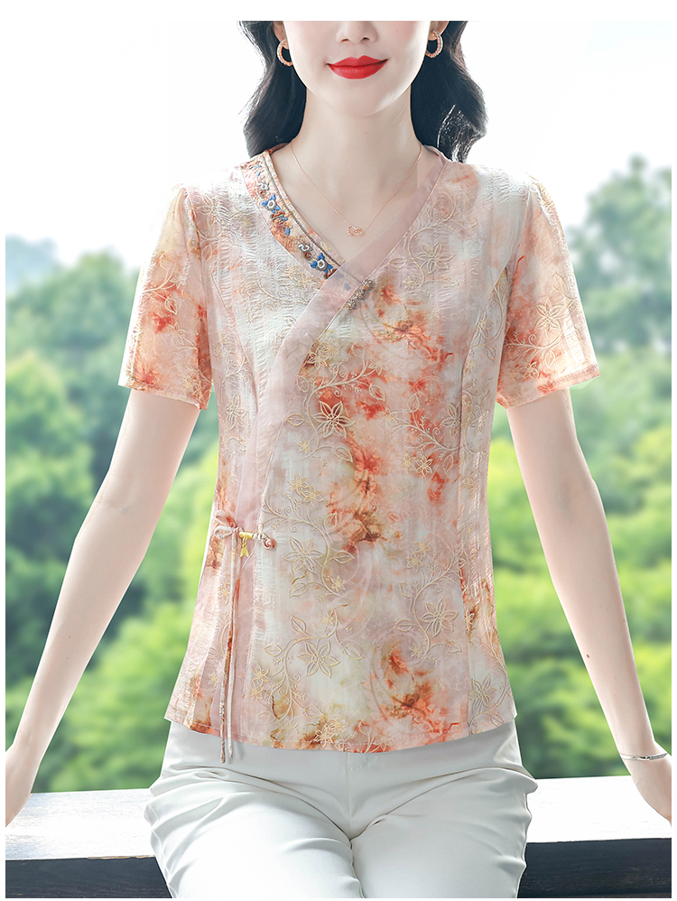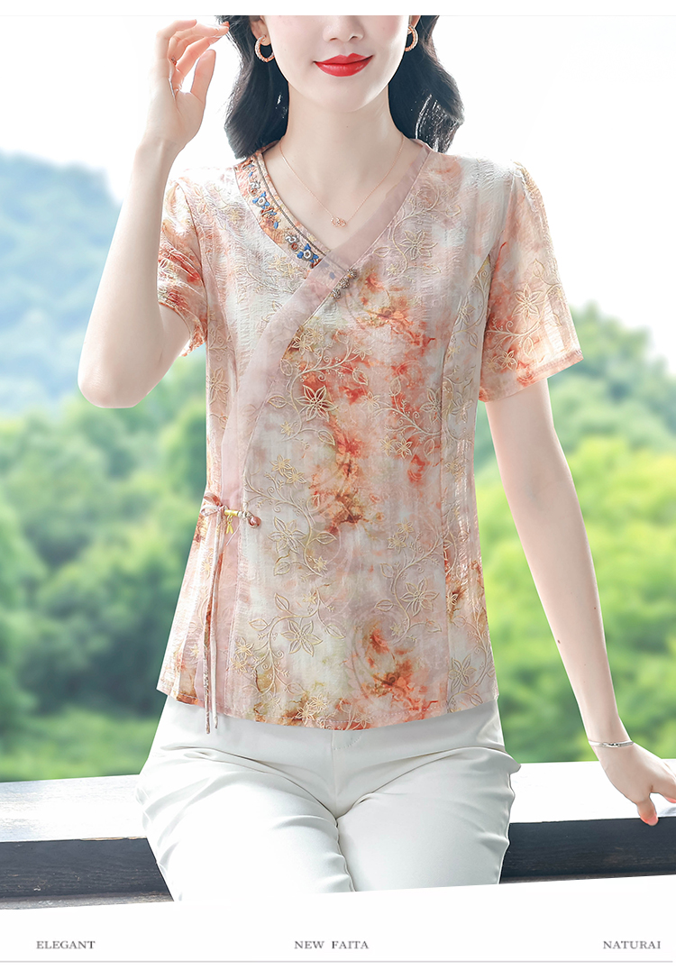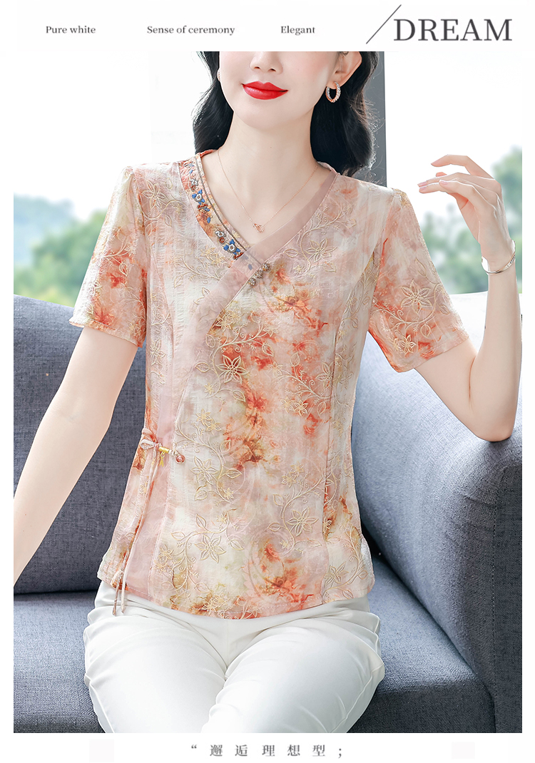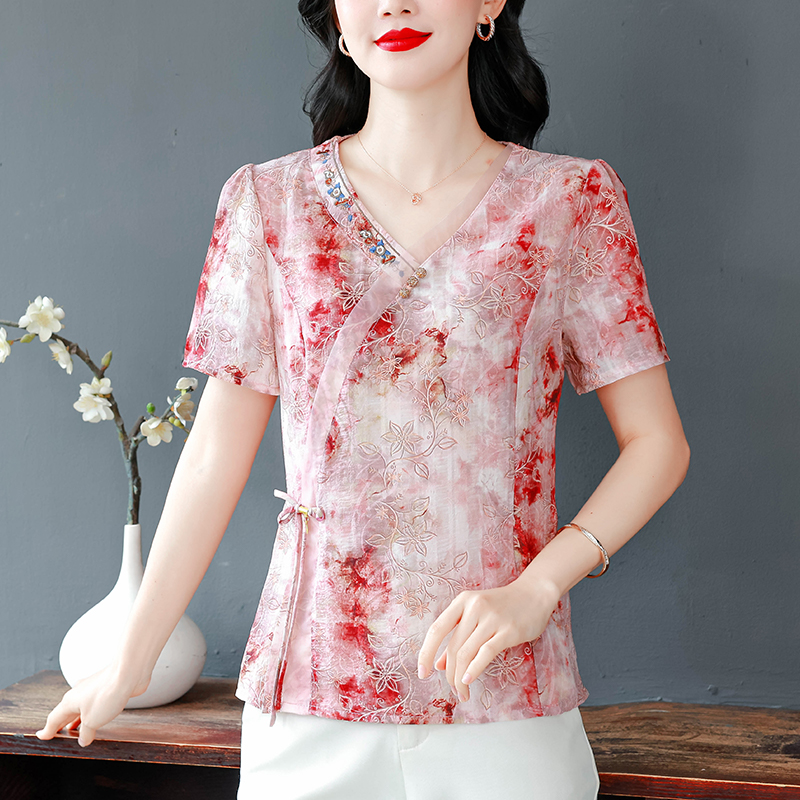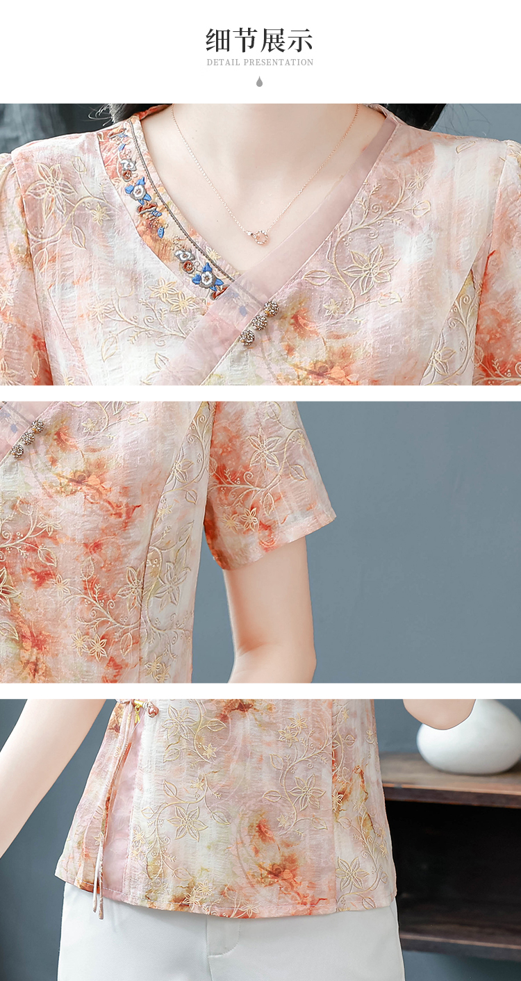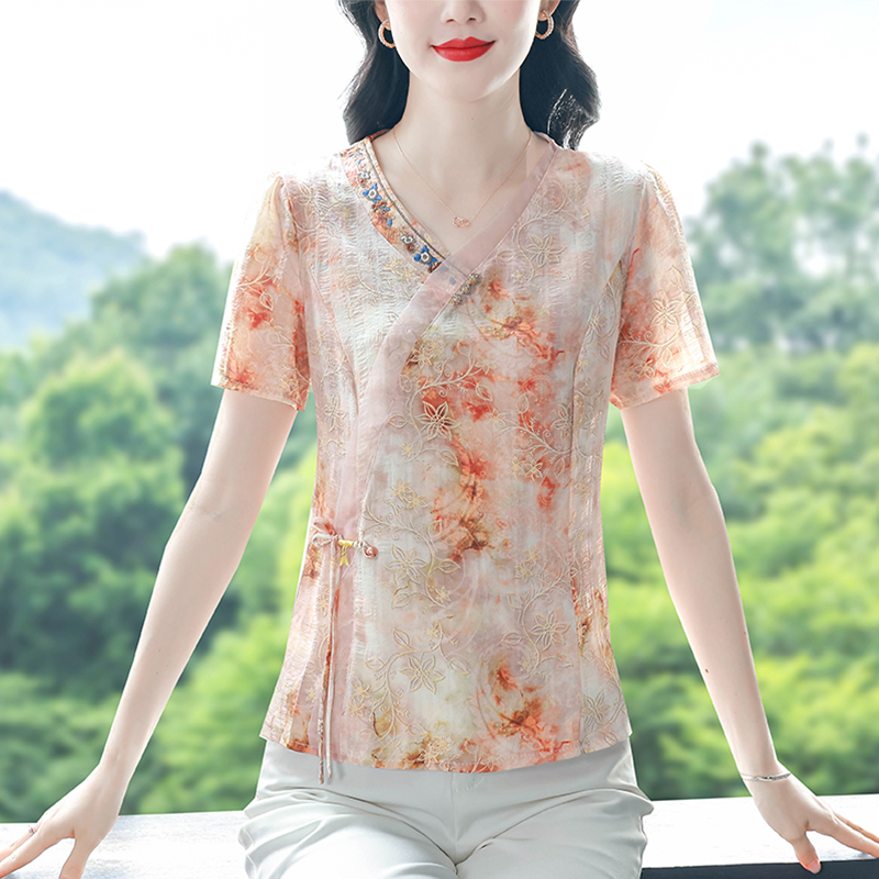 RY669# 国风复古短袖雪纺衫新中式刺绣V领显瘦上衣夏装新款女士百搭小衫
