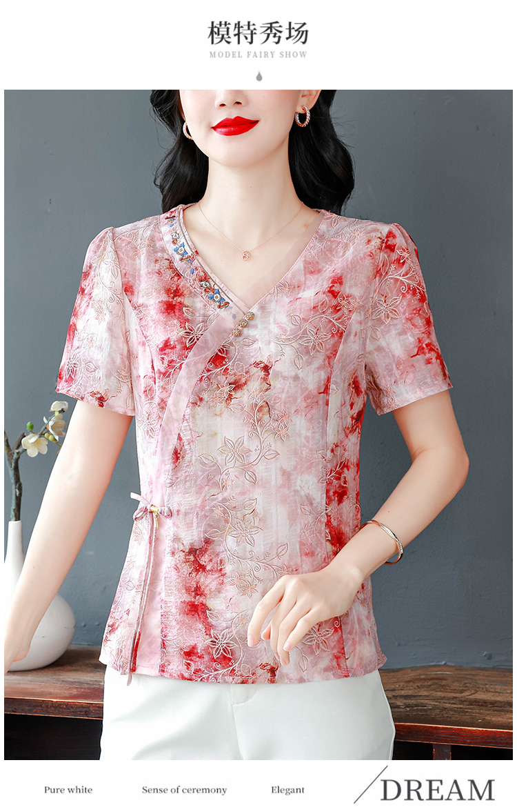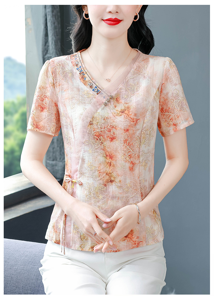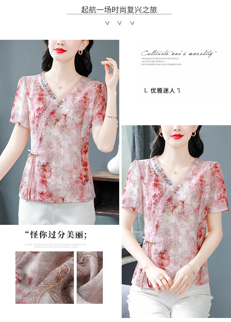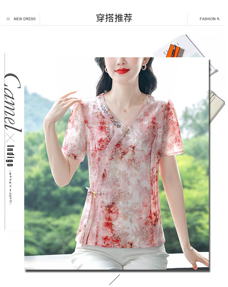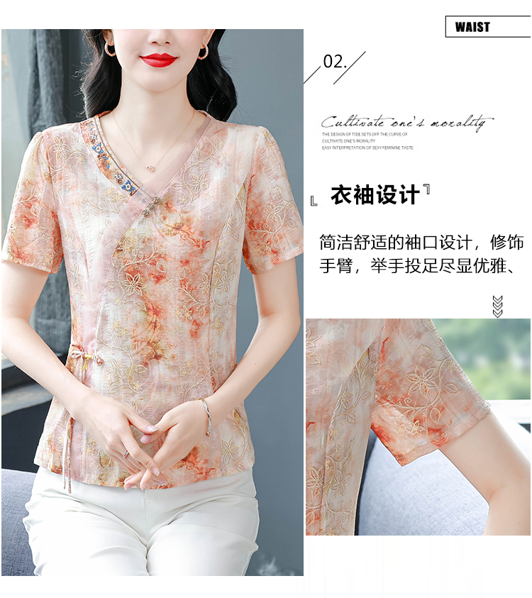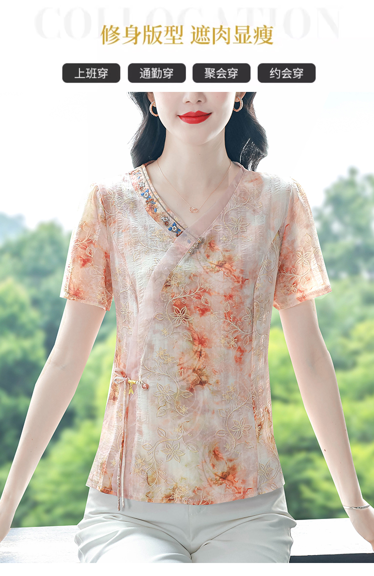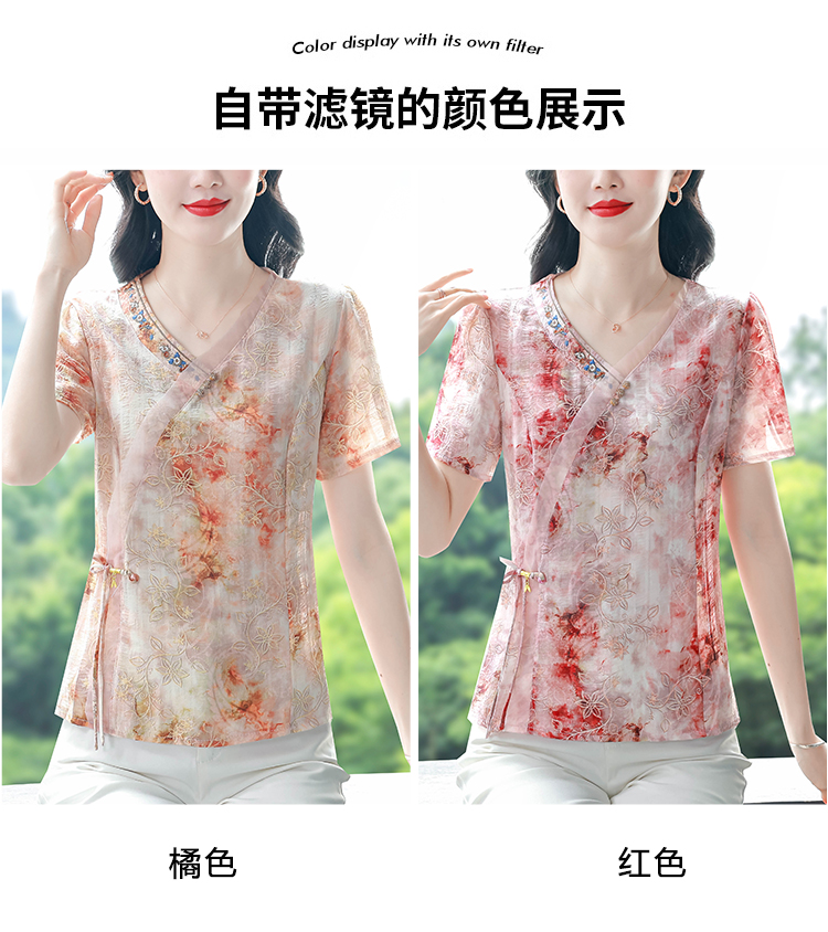 RY669# 国风复古短袖雪纺衫新中式刺绣V领显瘦上衣夏装新款女士百搭小衫