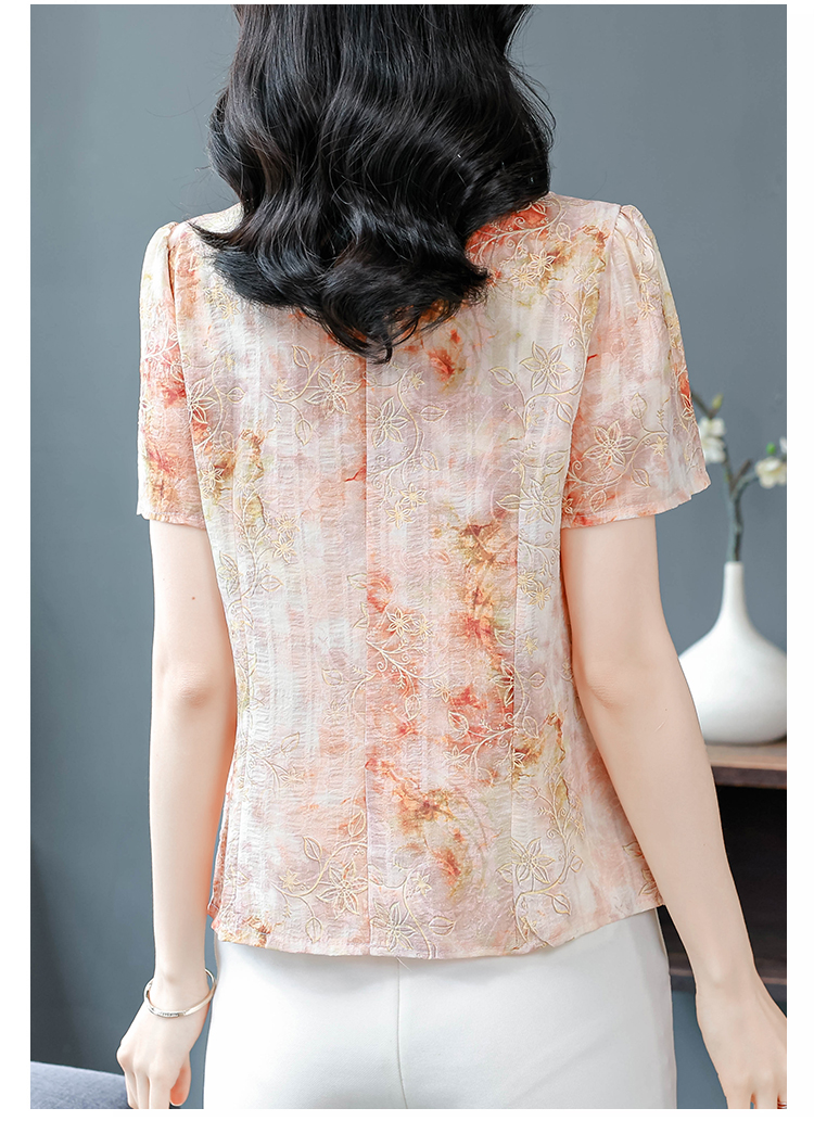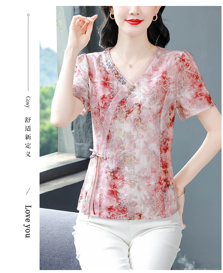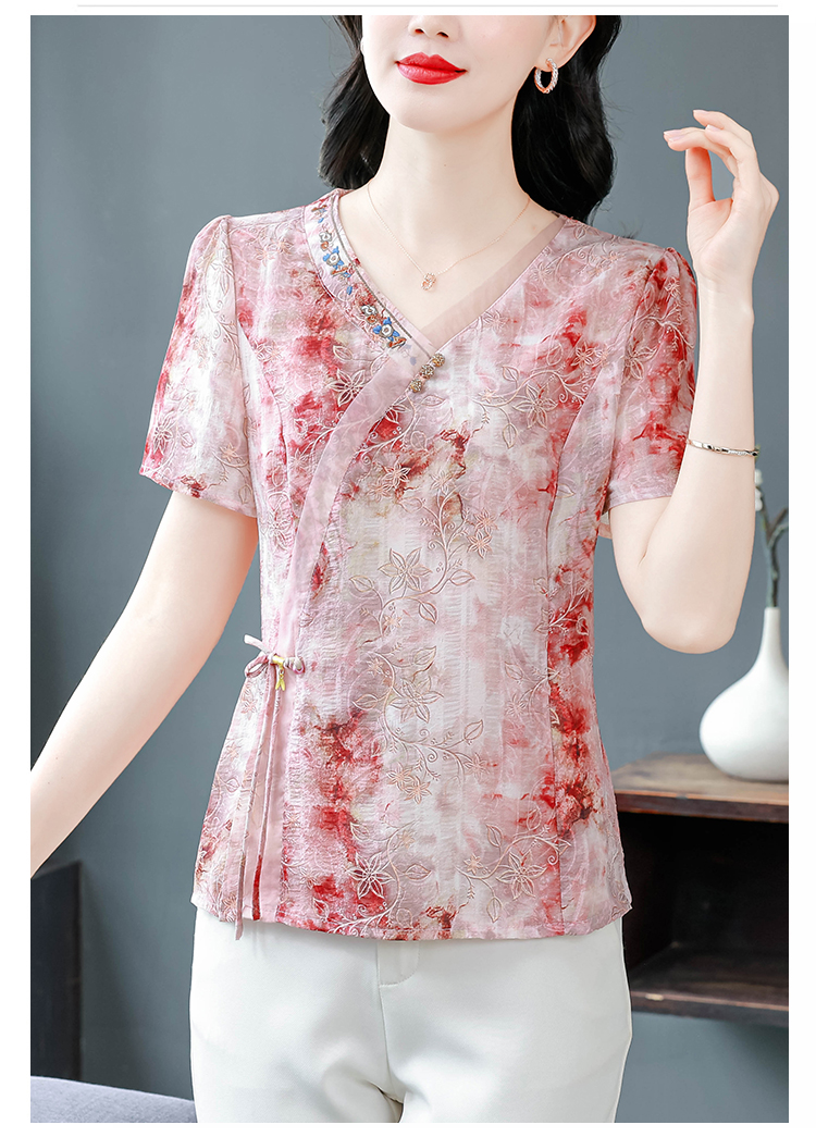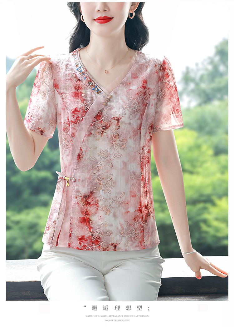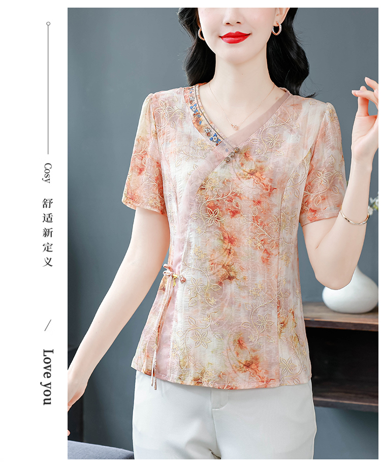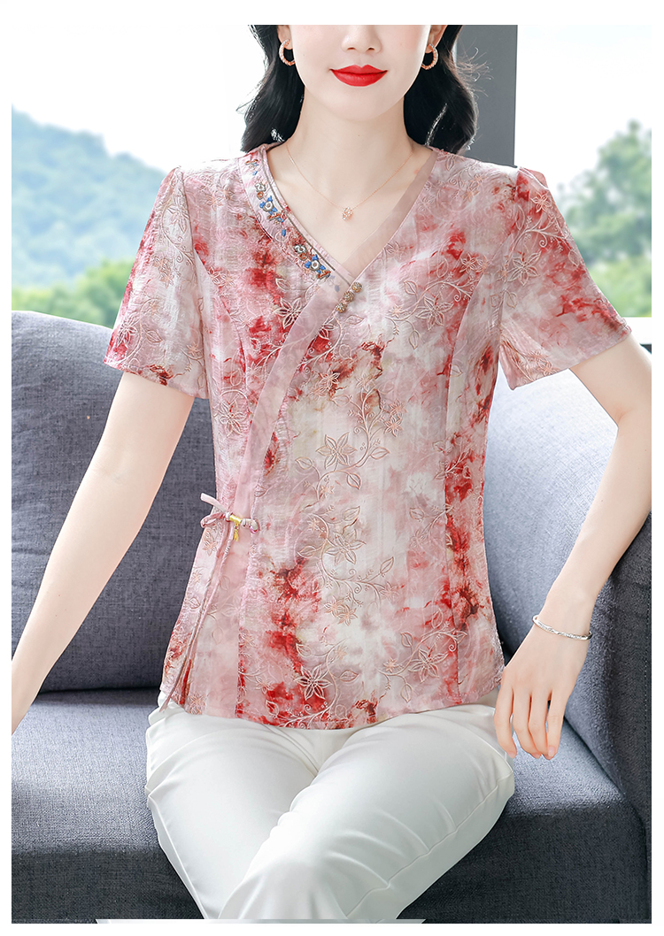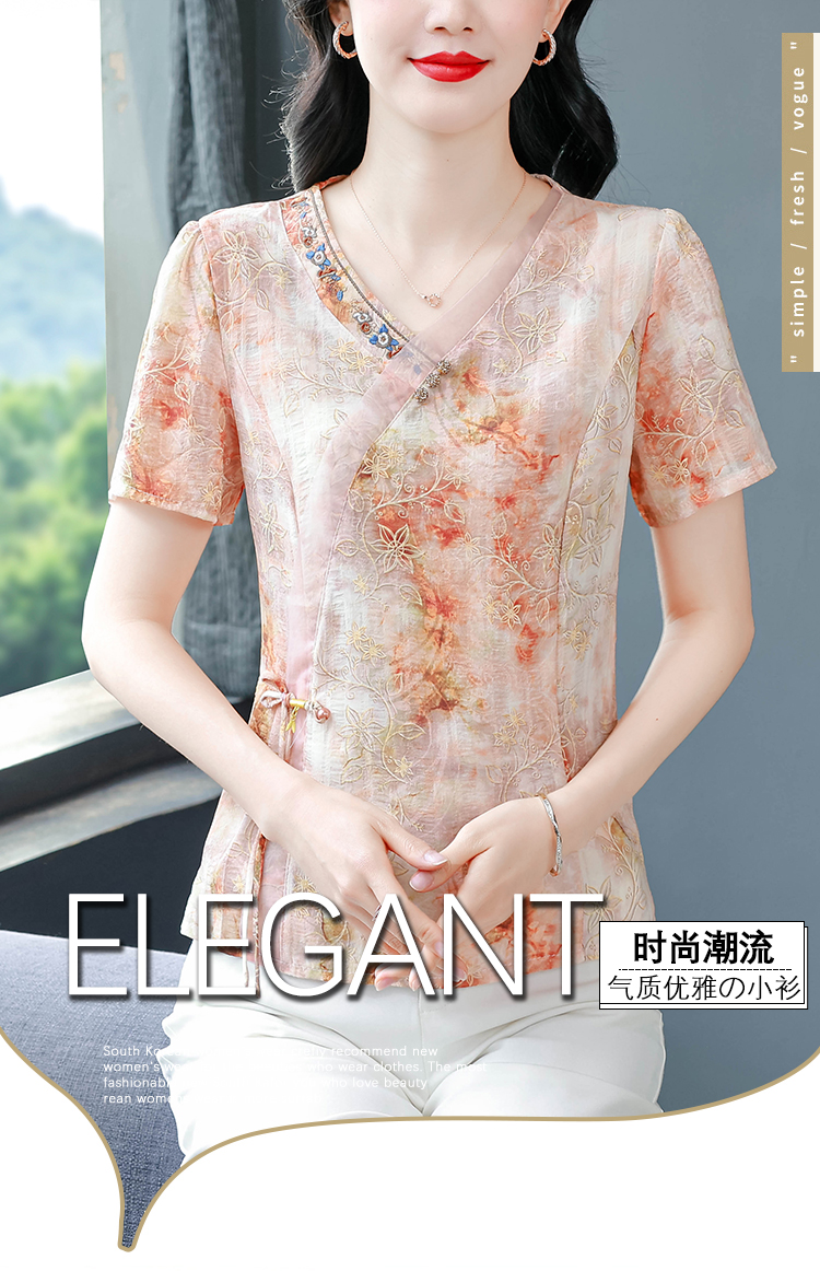 RY669# 国风复古短袖雪纺衫新中式刺绣V领显瘦上衣夏装新款女士百搭小衫