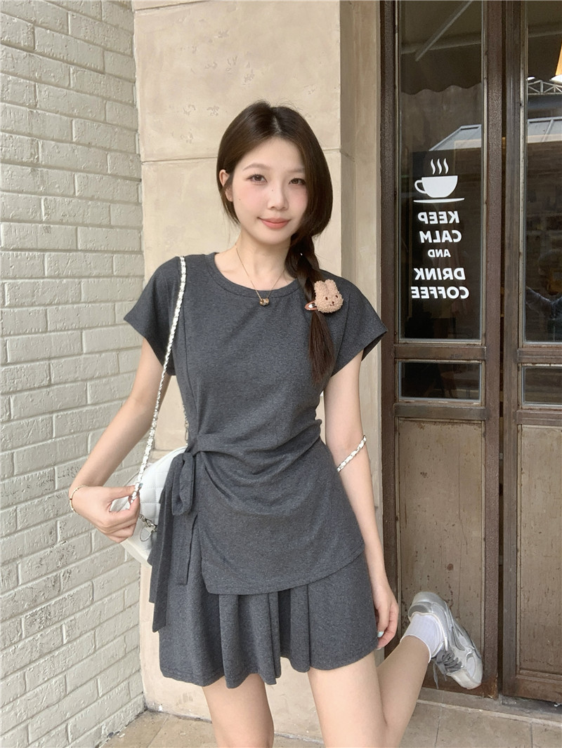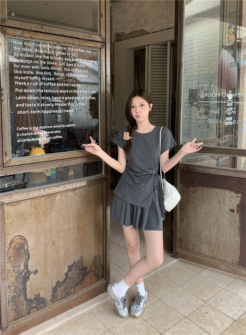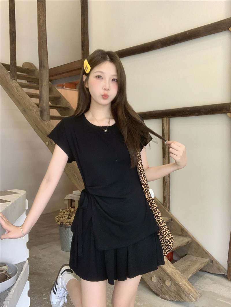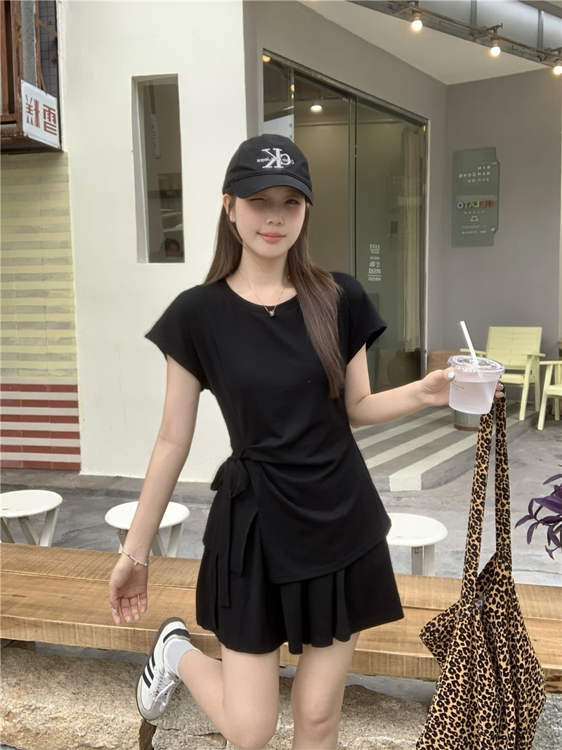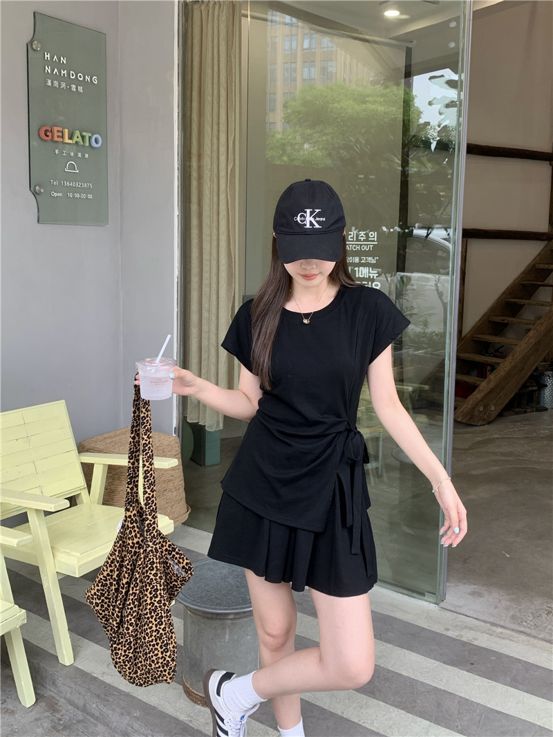 RY867# 实拍~大码女装韩系简约休闲绑带收腰T恤上衣+松紧腰宽松裙裤套装
