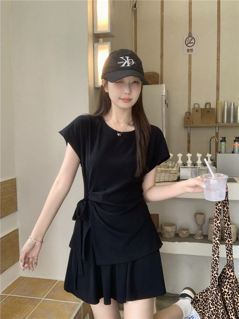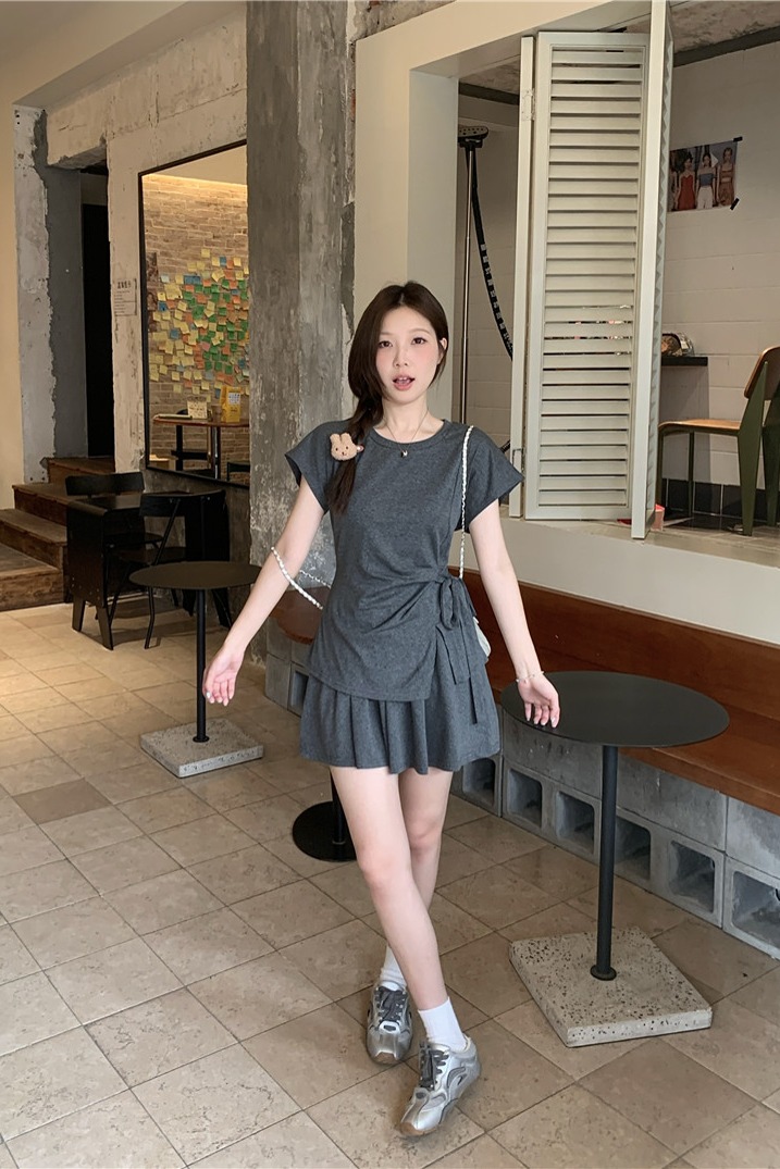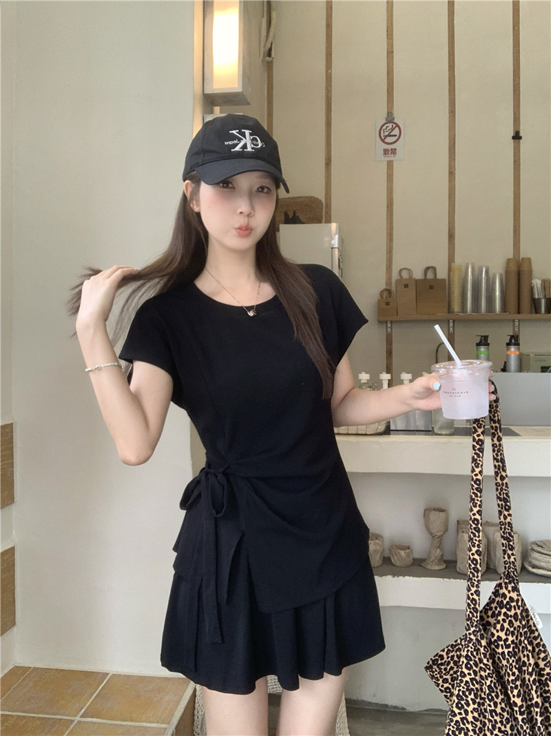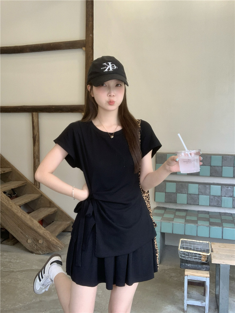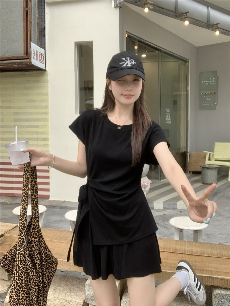 RY867# 实拍~大码女装韩系简约休闲绑带收腰T恤上衣+松紧腰宽松裙裤套装