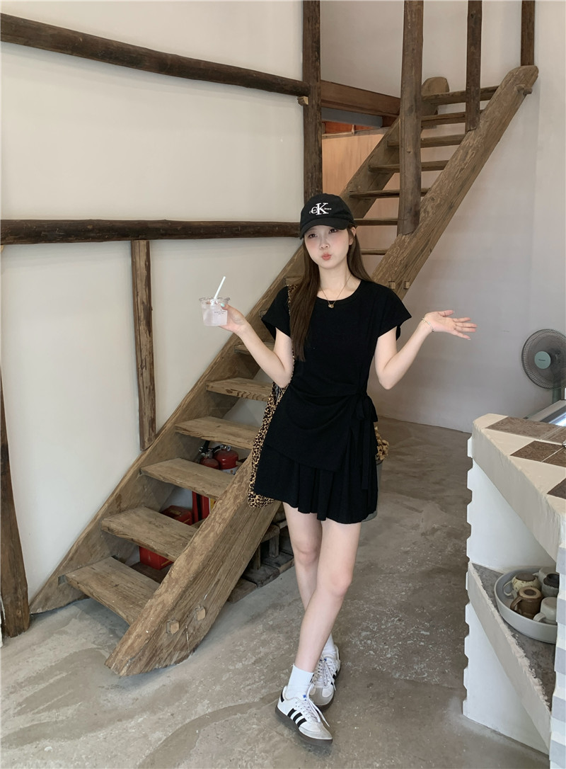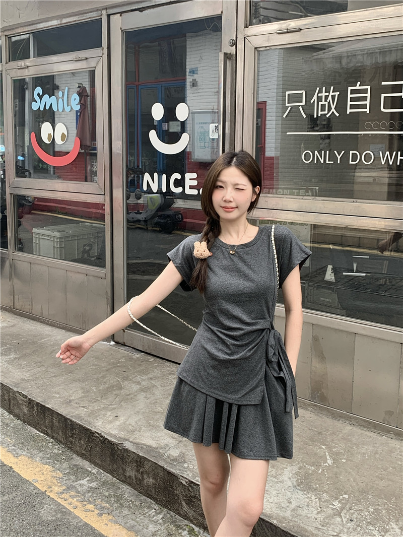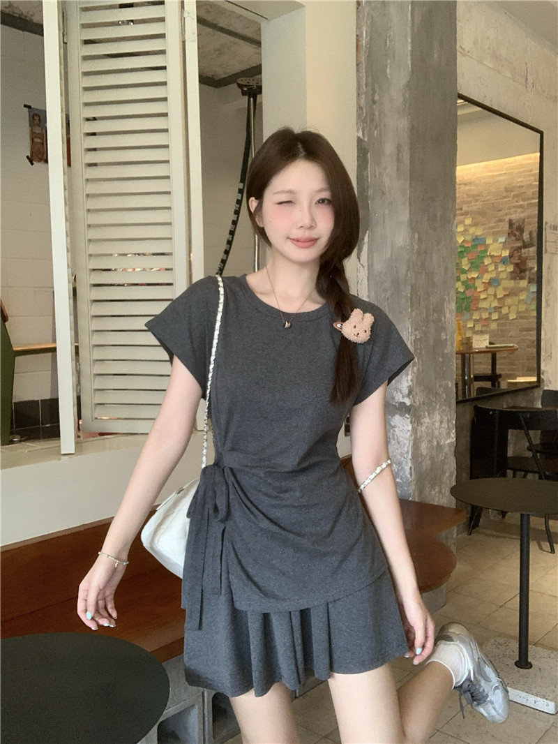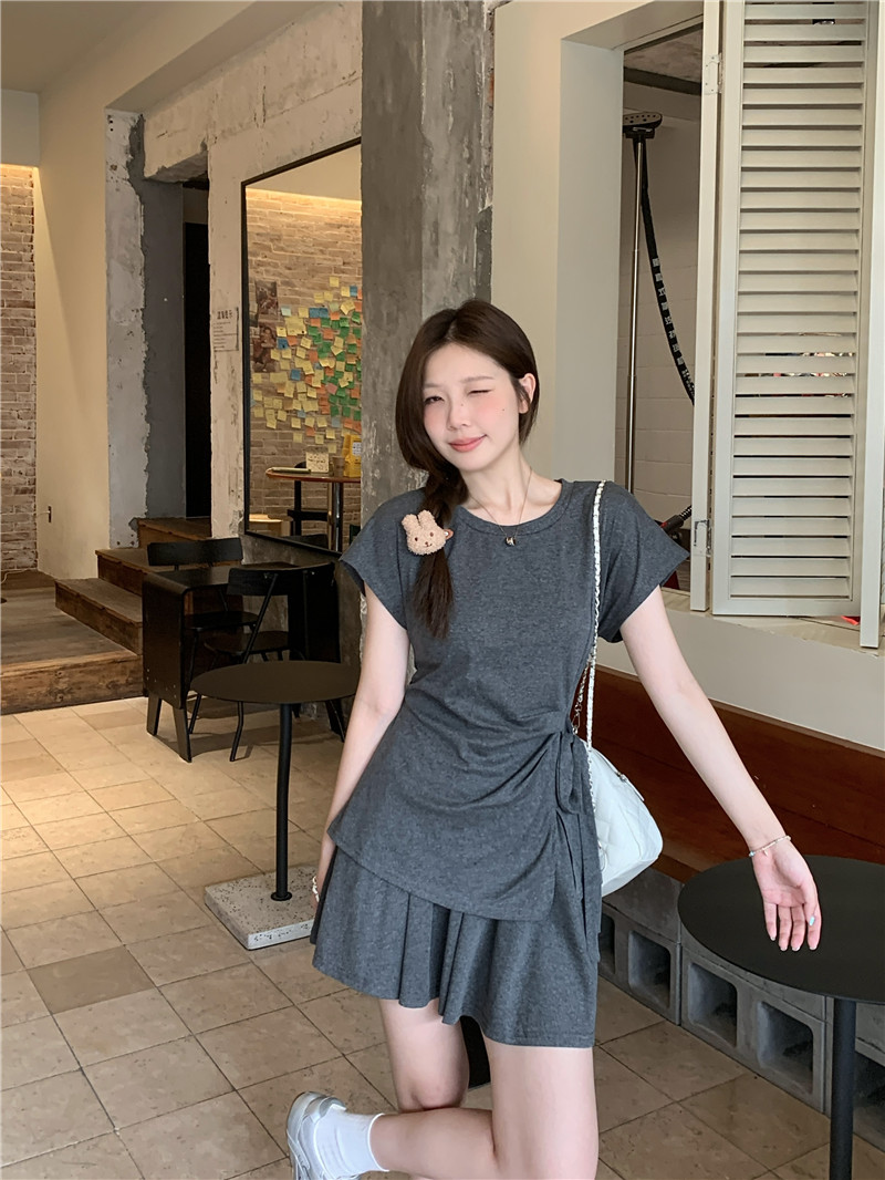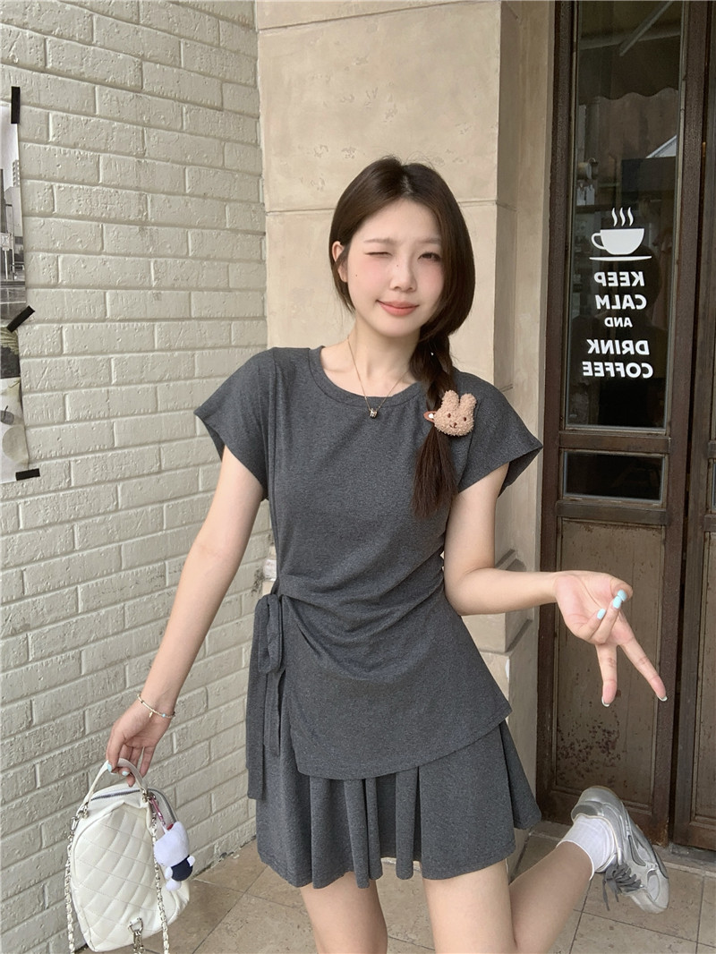 RY867# 实拍~大码女装韩系简约休闲绑带收腰T恤上衣+松紧腰宽松裙裤套装