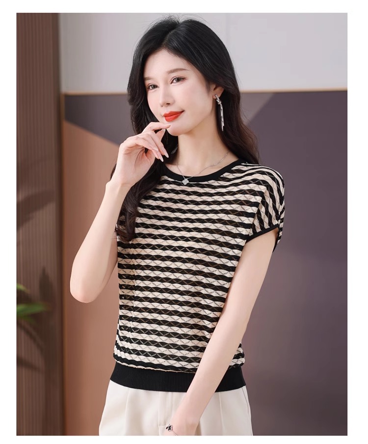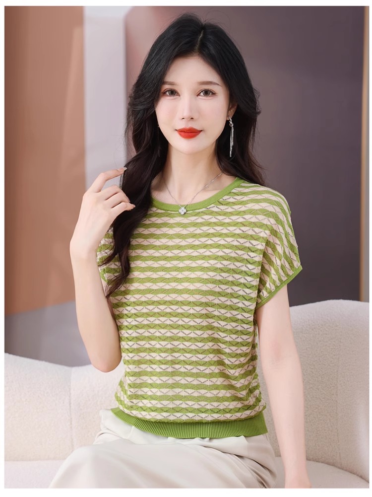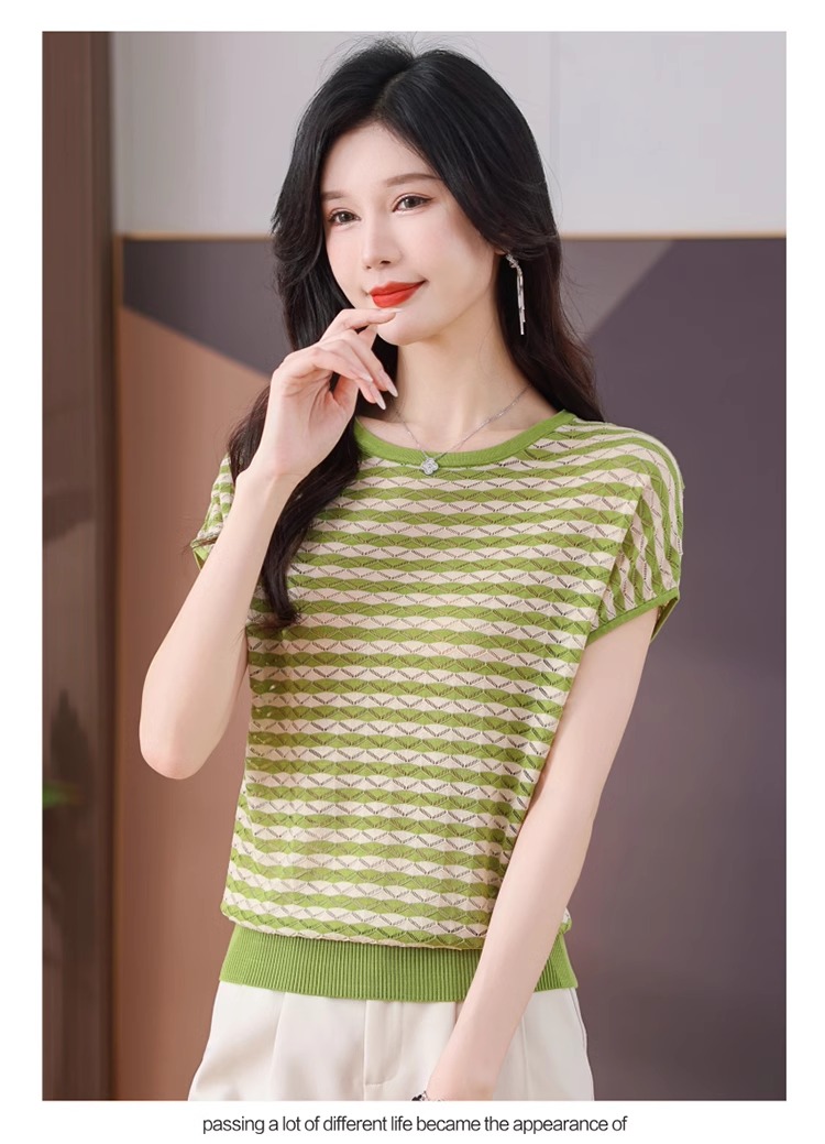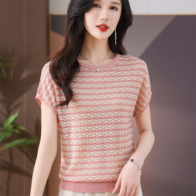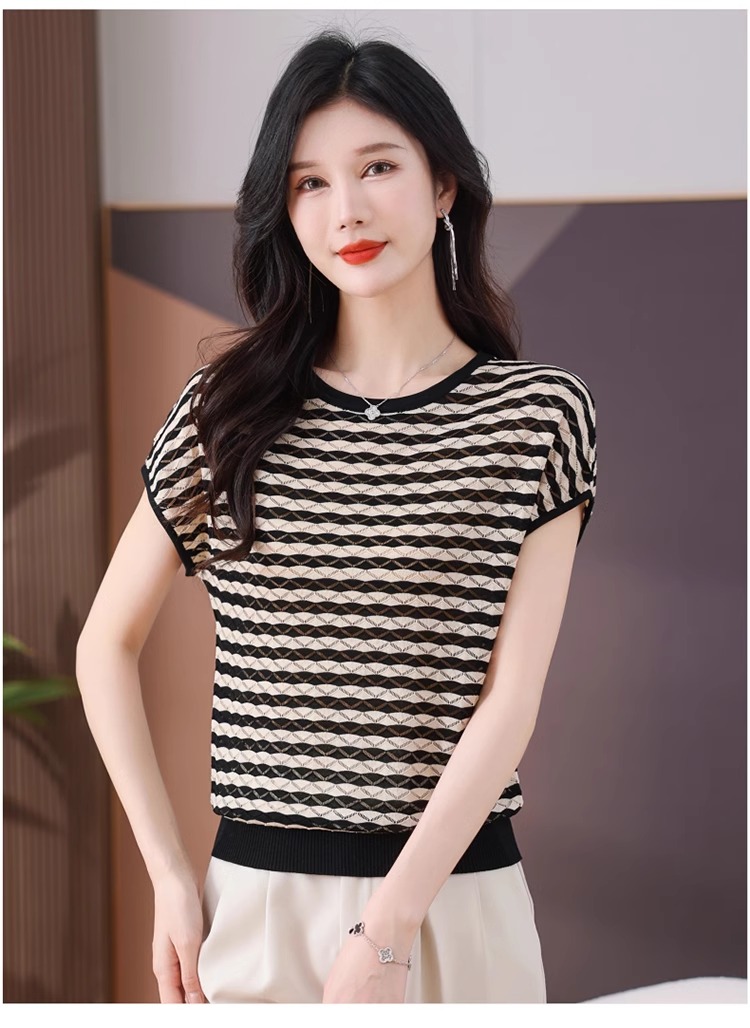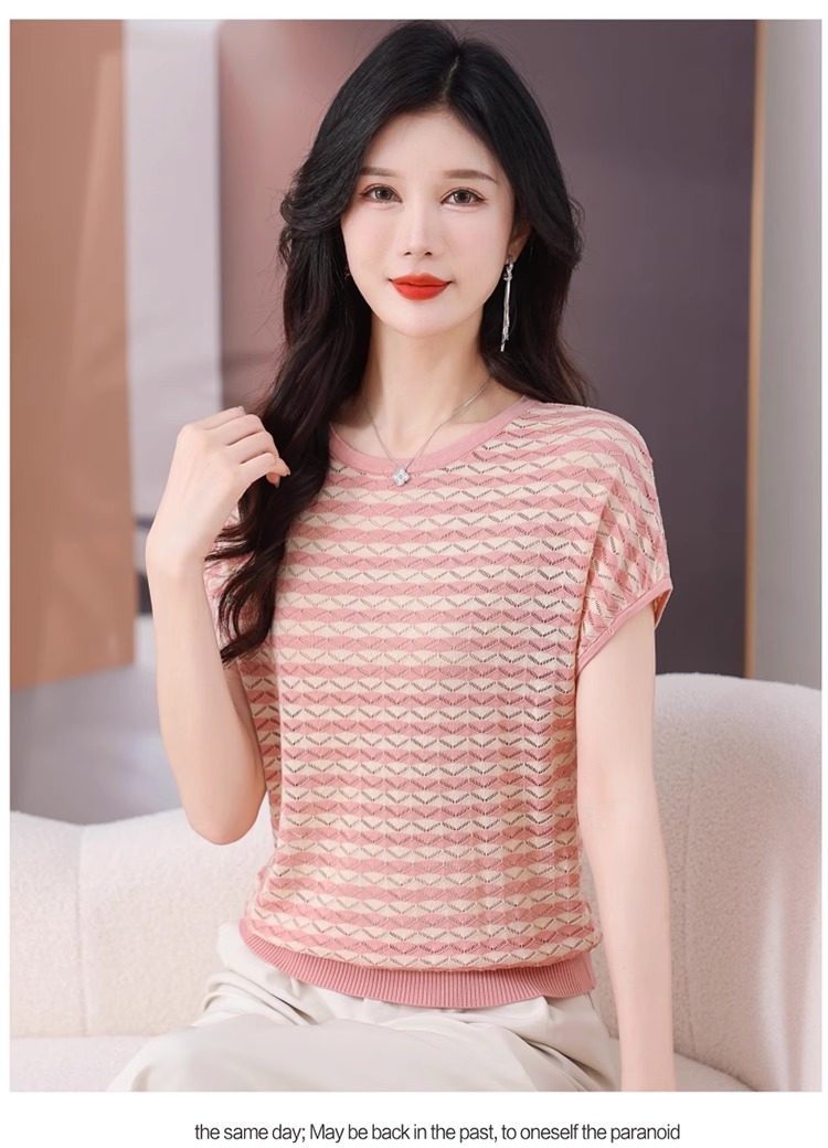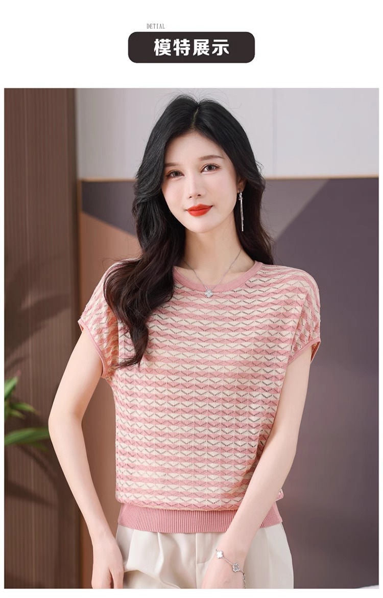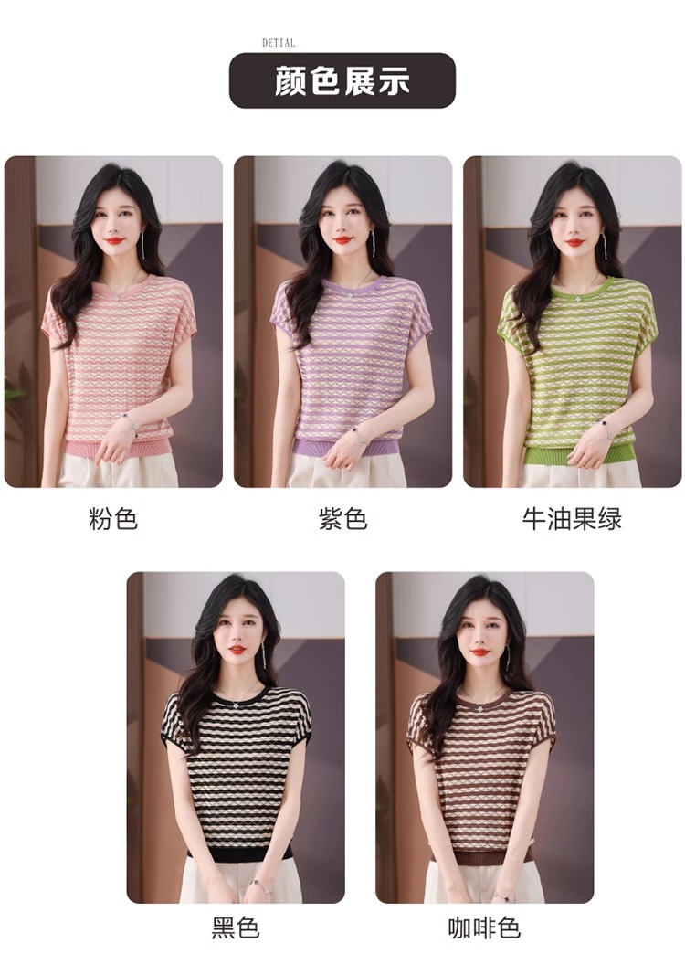 RY1081# 桑蚕丝短袖T恤女装镂空罩衫条纹冰丝针织衫正肩上衣