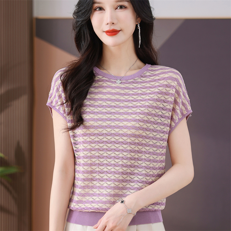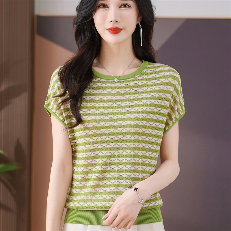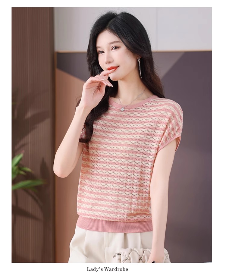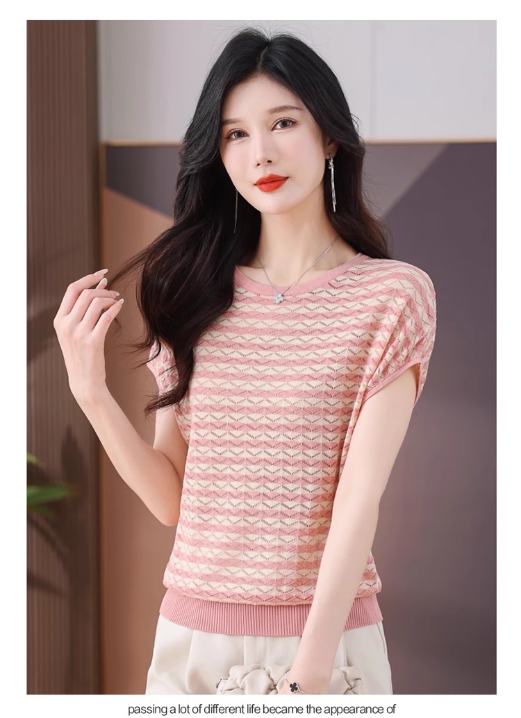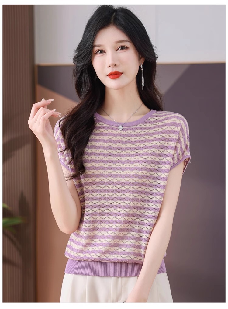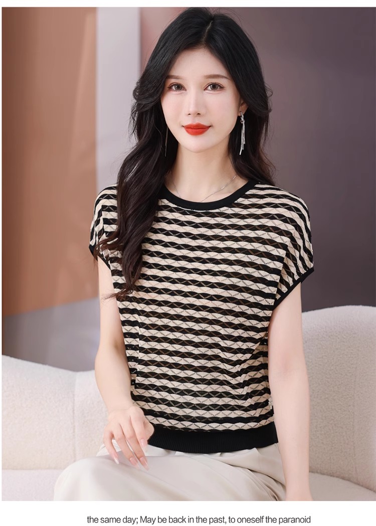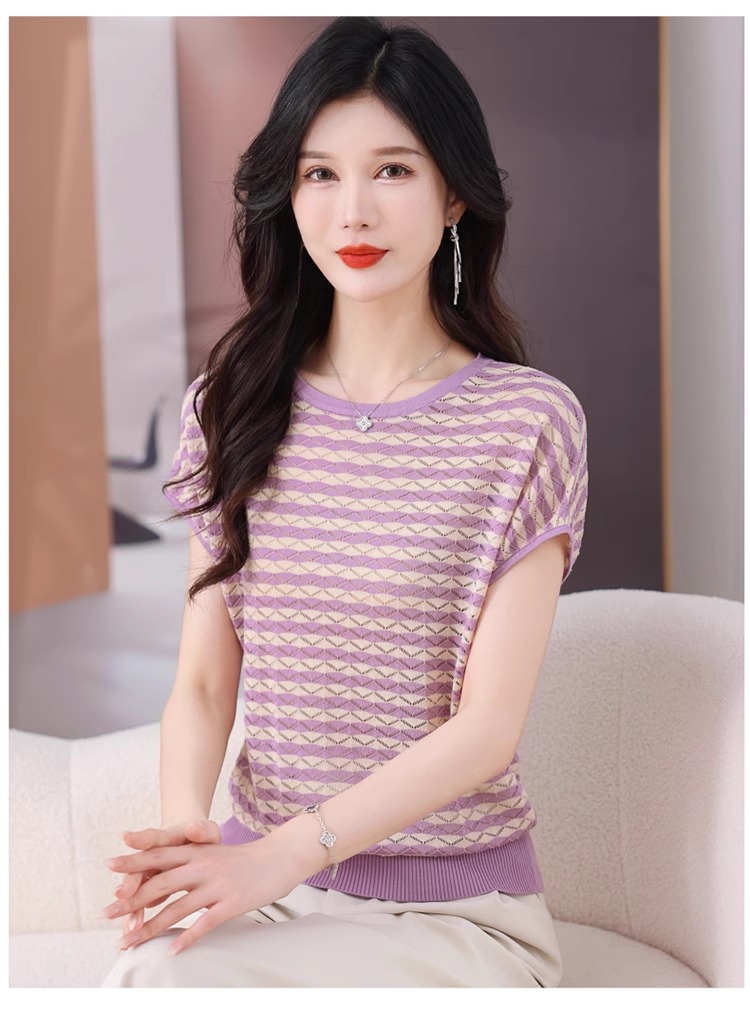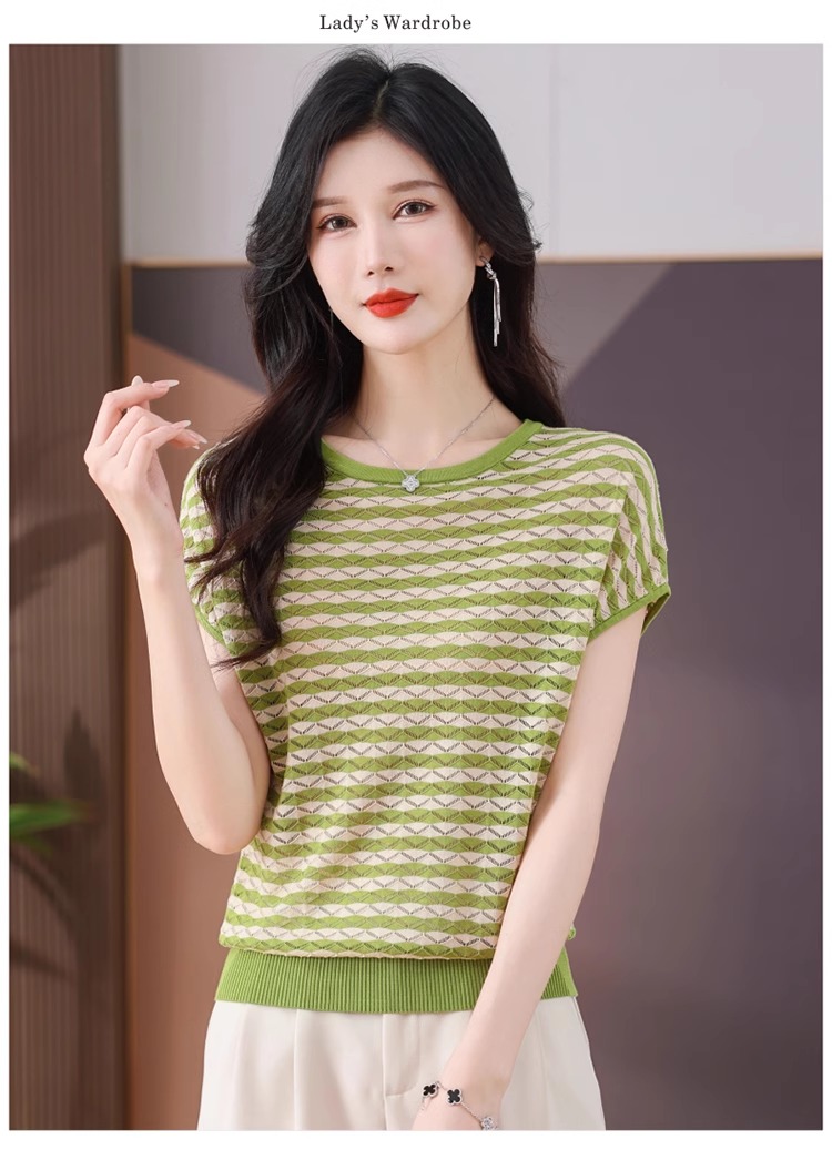 RY1081# 桑蚕丝短袖T恤女装镂空罩衫条纹冰丝针织衫正肩上衣