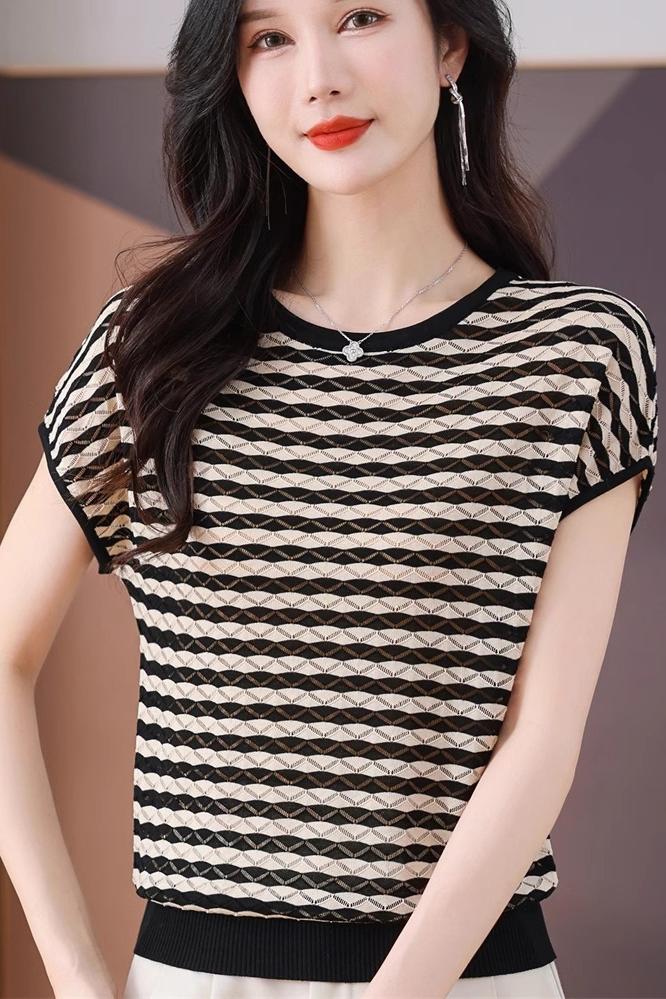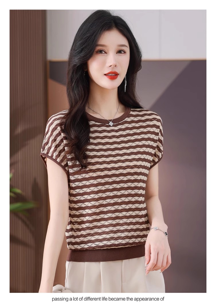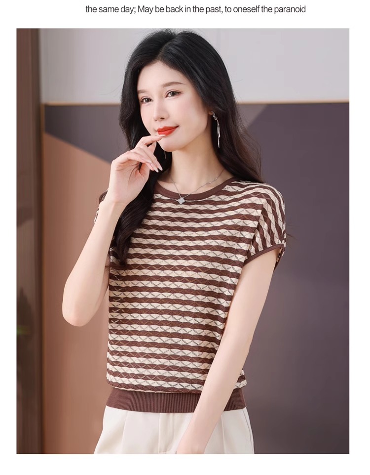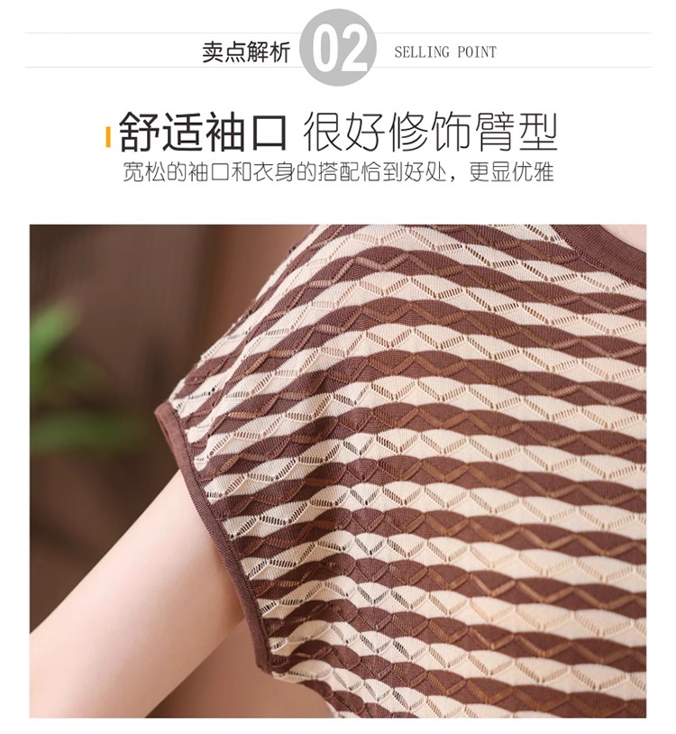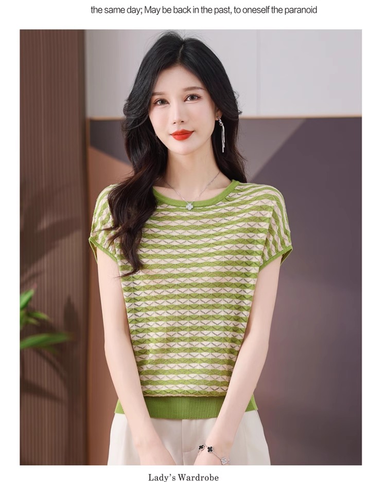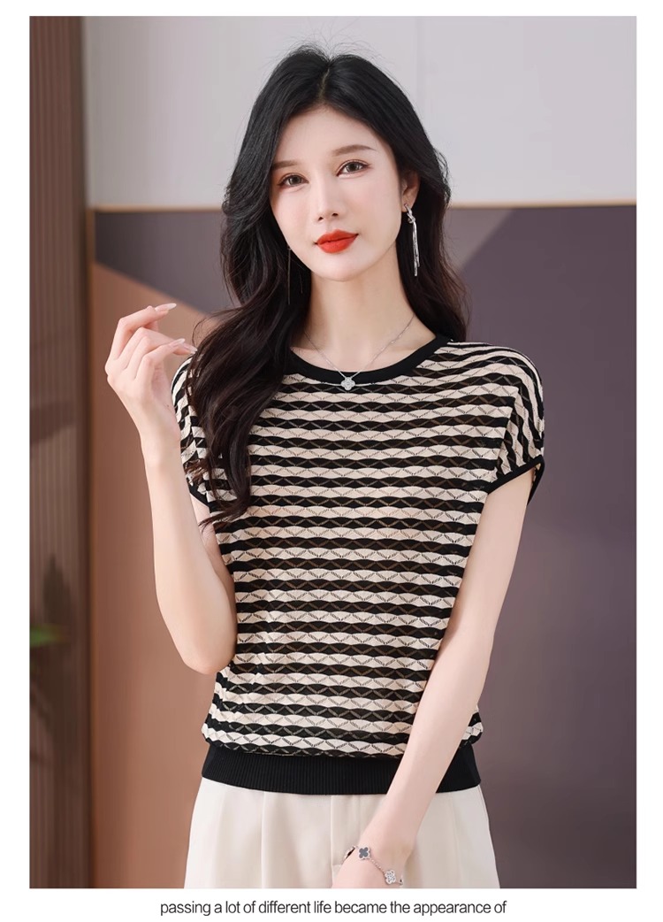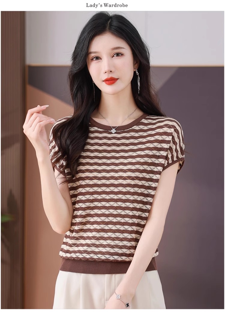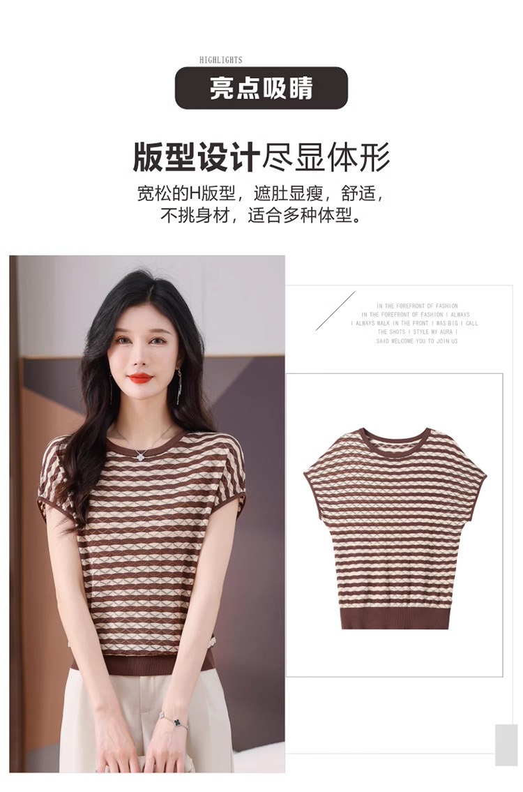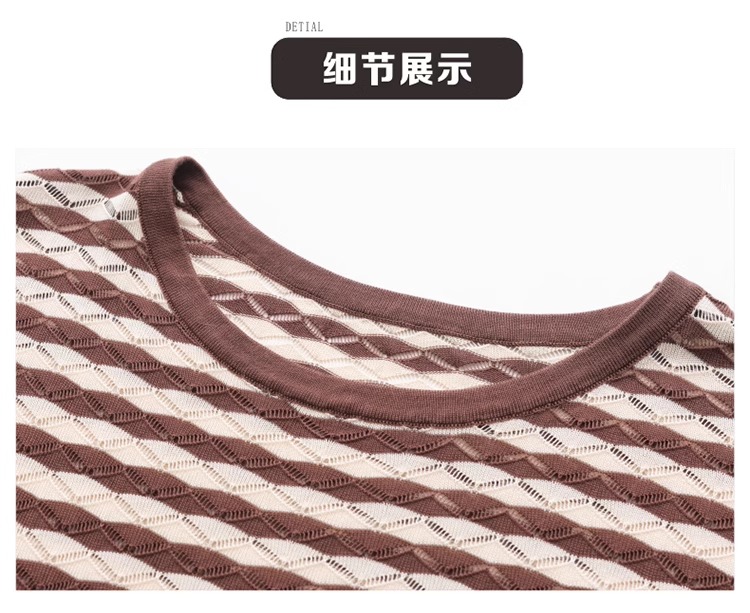 RY1081# 桑蚕丝短袖T恤女装镂空罩衫条纹冰丝针织衫正肩上衣