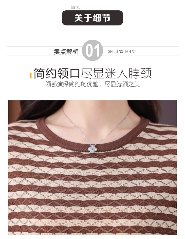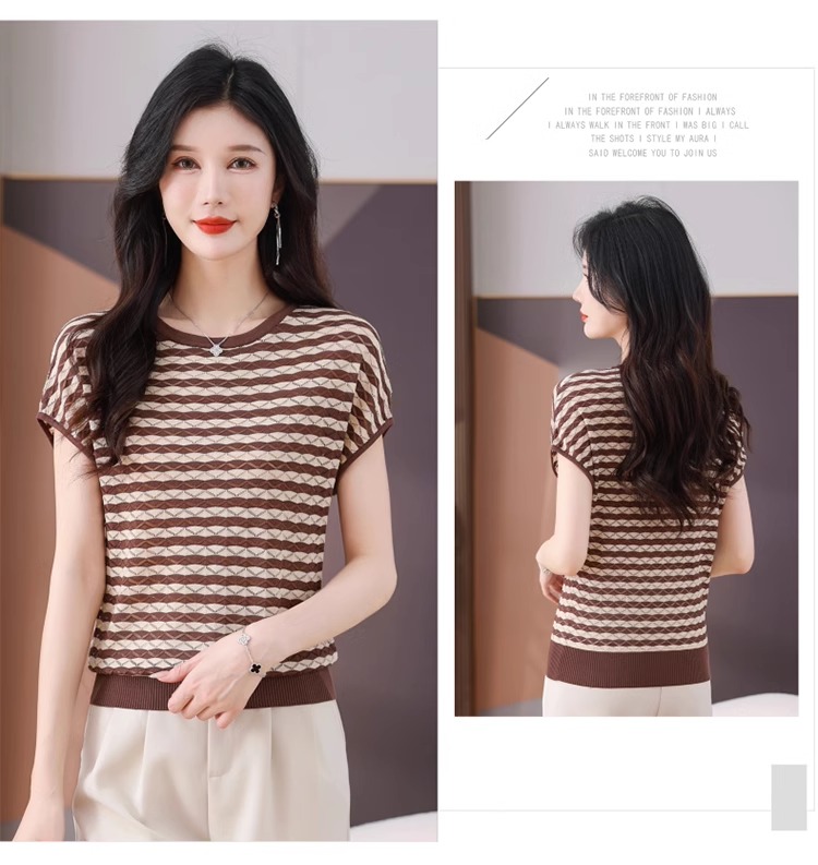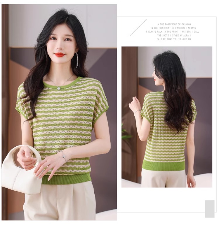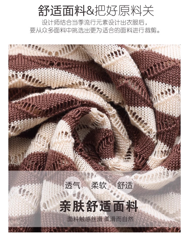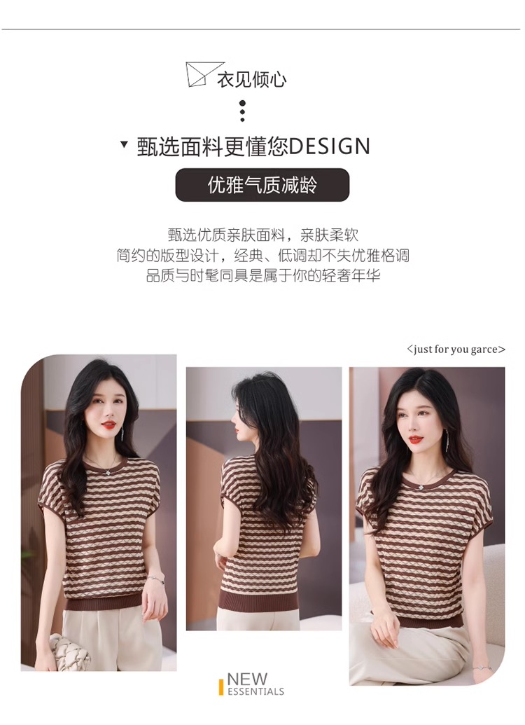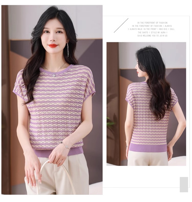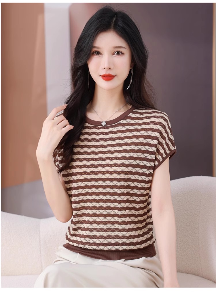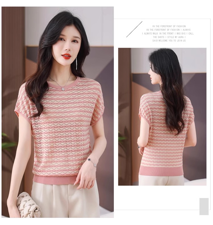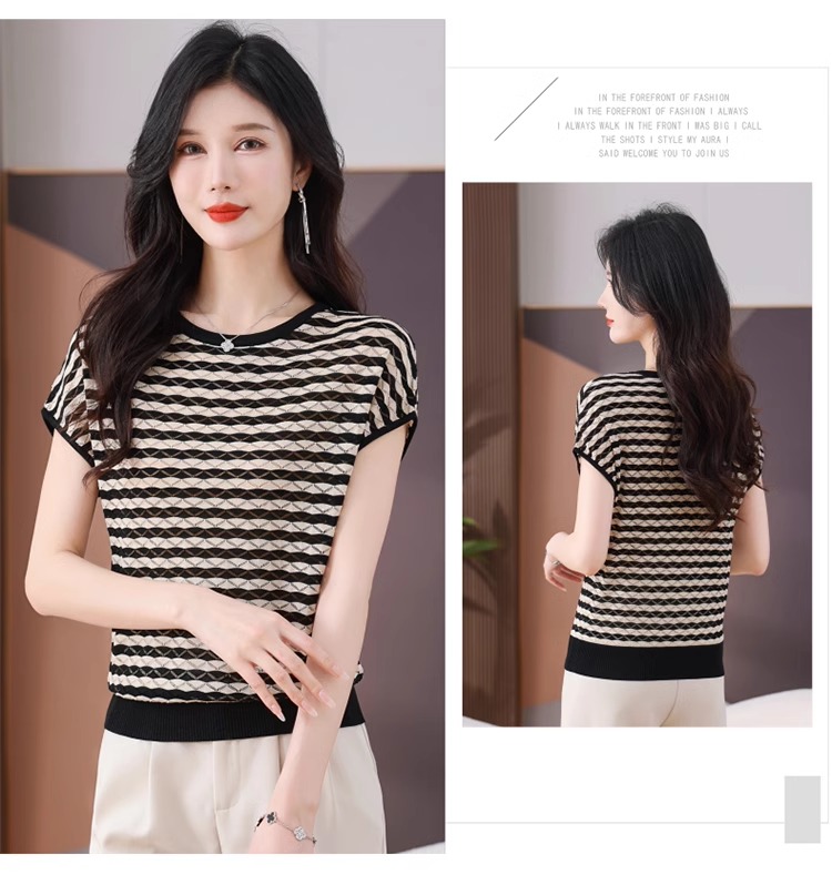 RY1081# 桑蚕丝短袖T恤女装镂空罩衫条纹冰丝针织衫正肩上衣