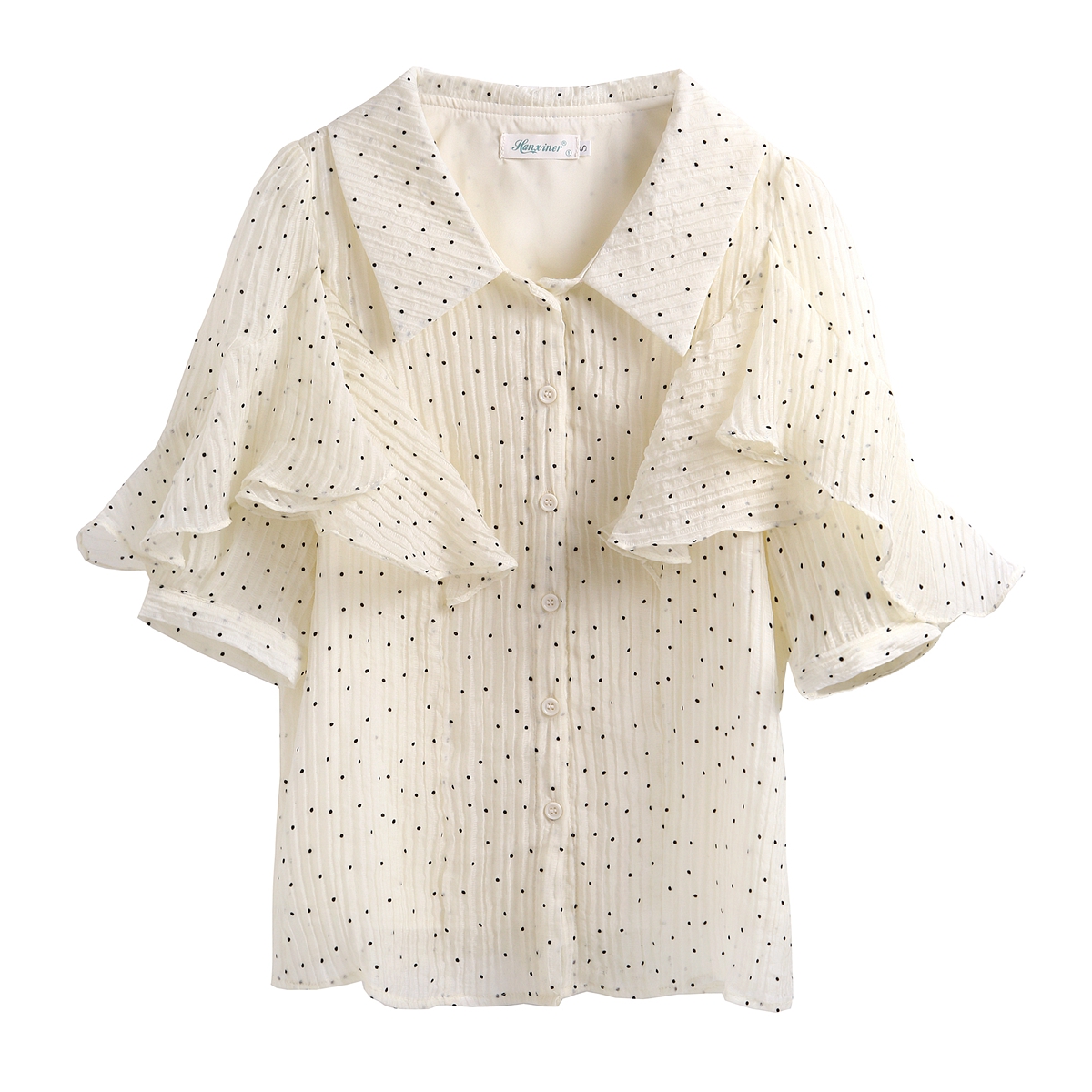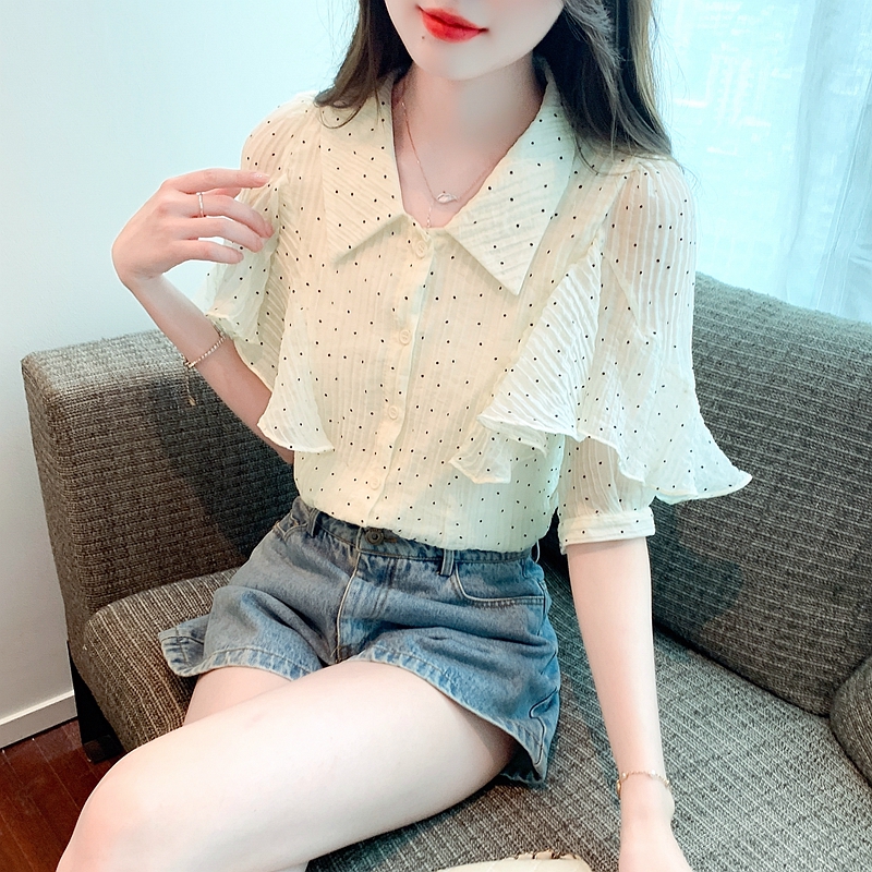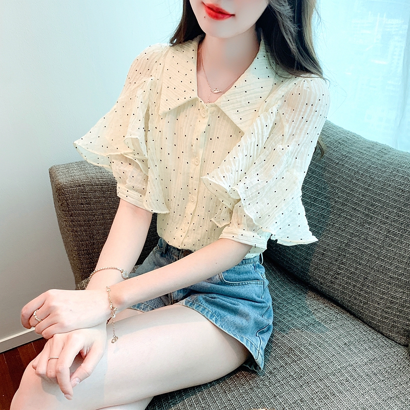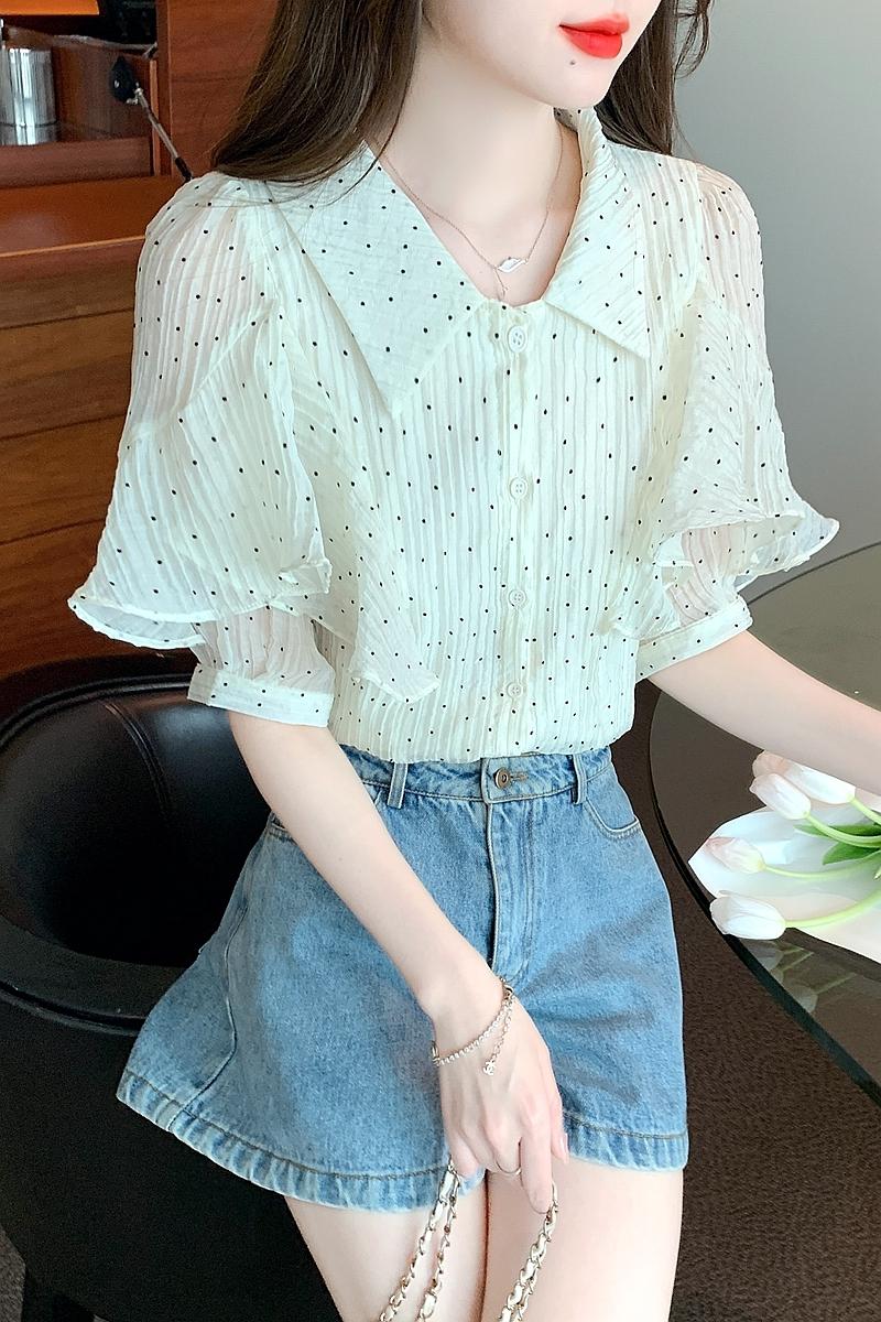 RY1084# 雪纺短袖衬衫女夏2026新款法式波点上衣设计感小众翻领荷叶袖衬衣