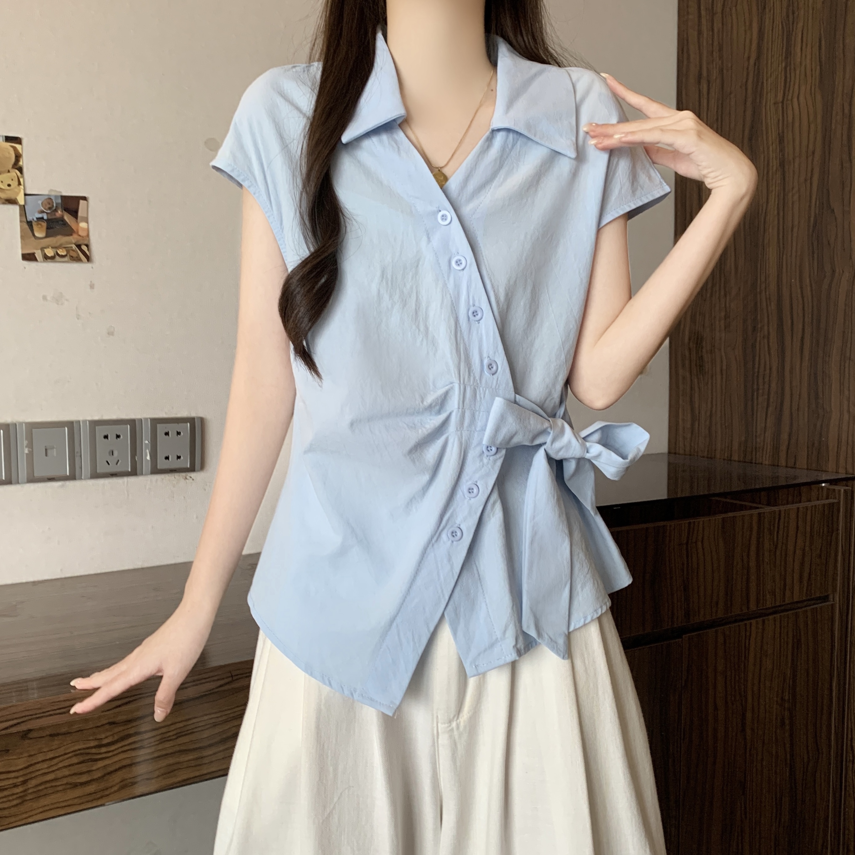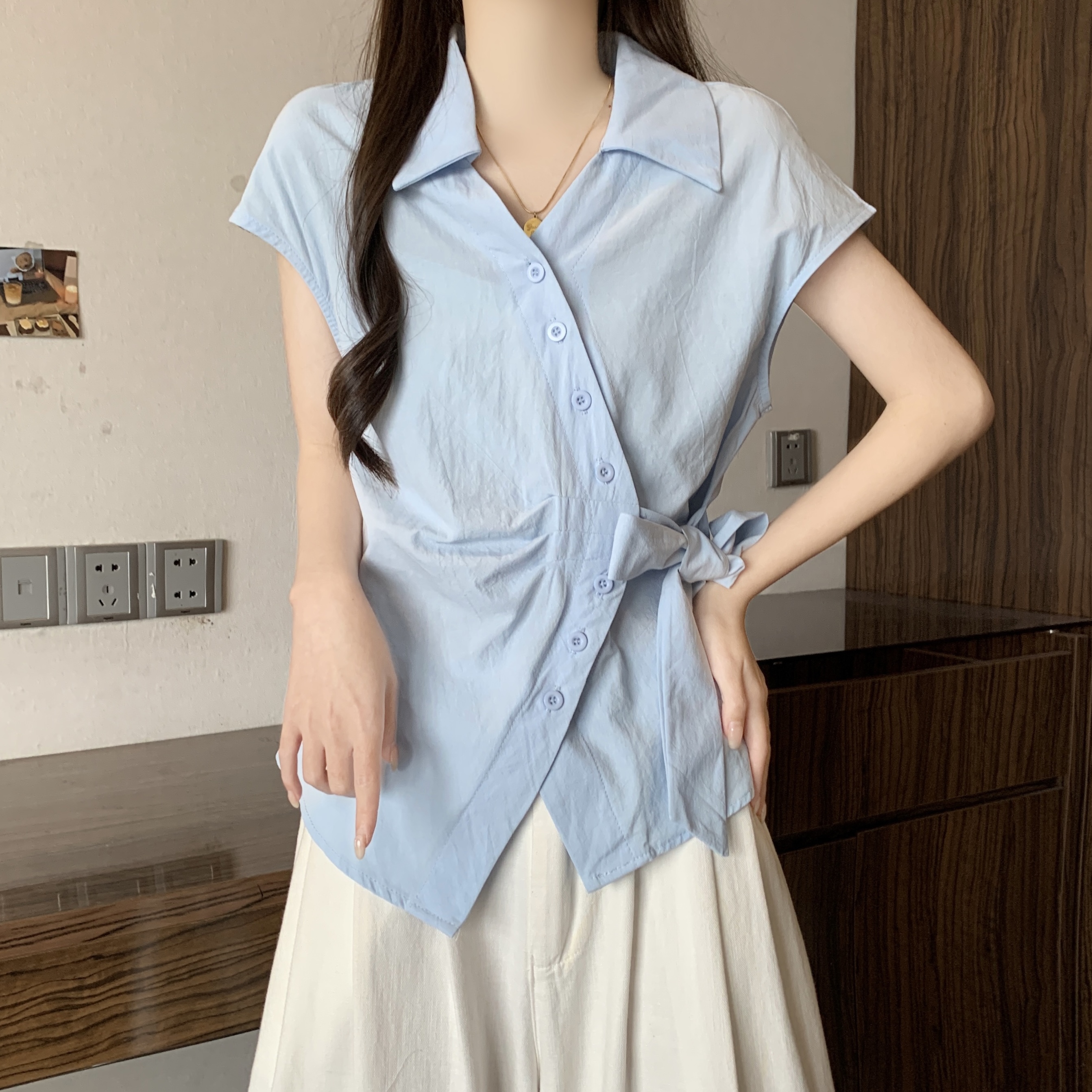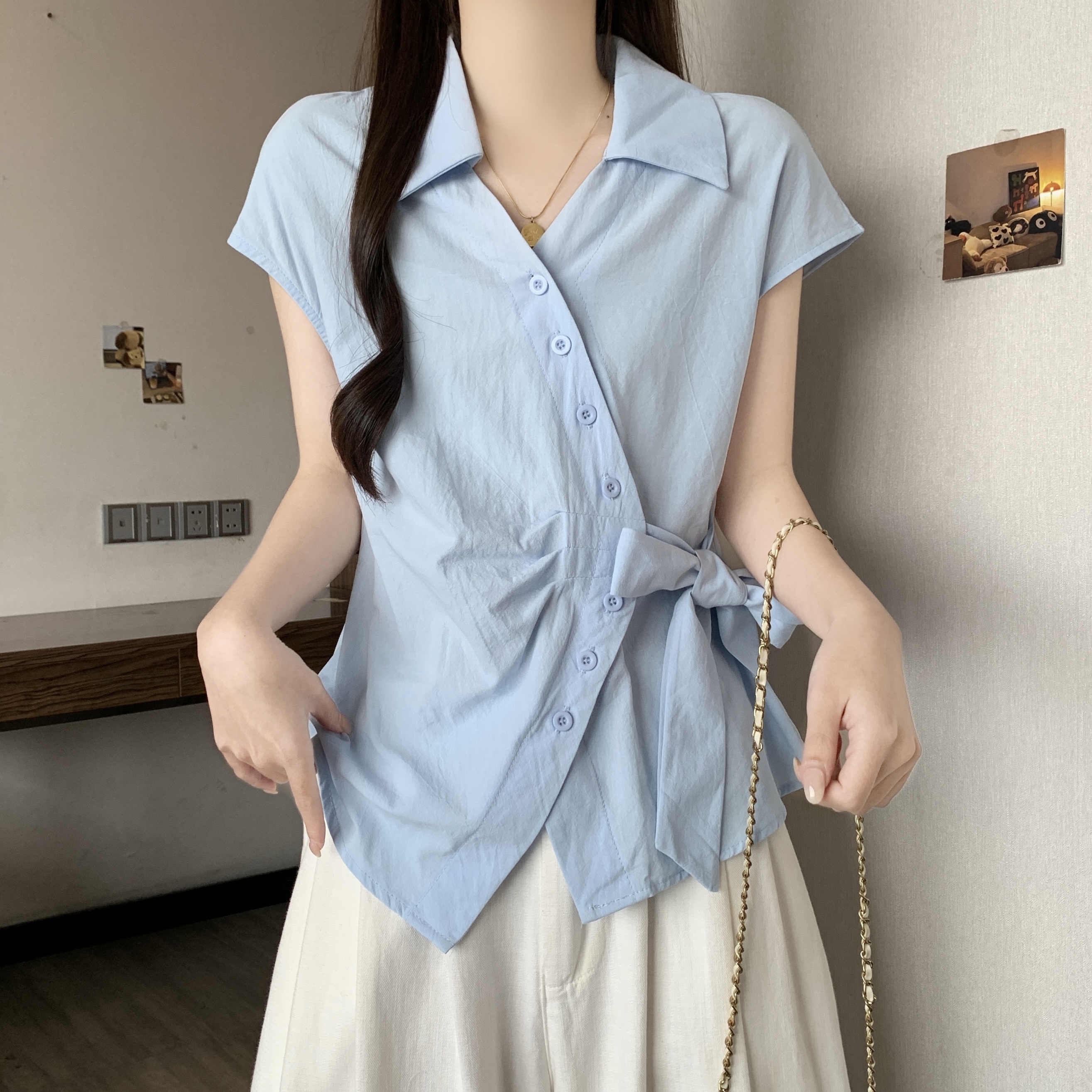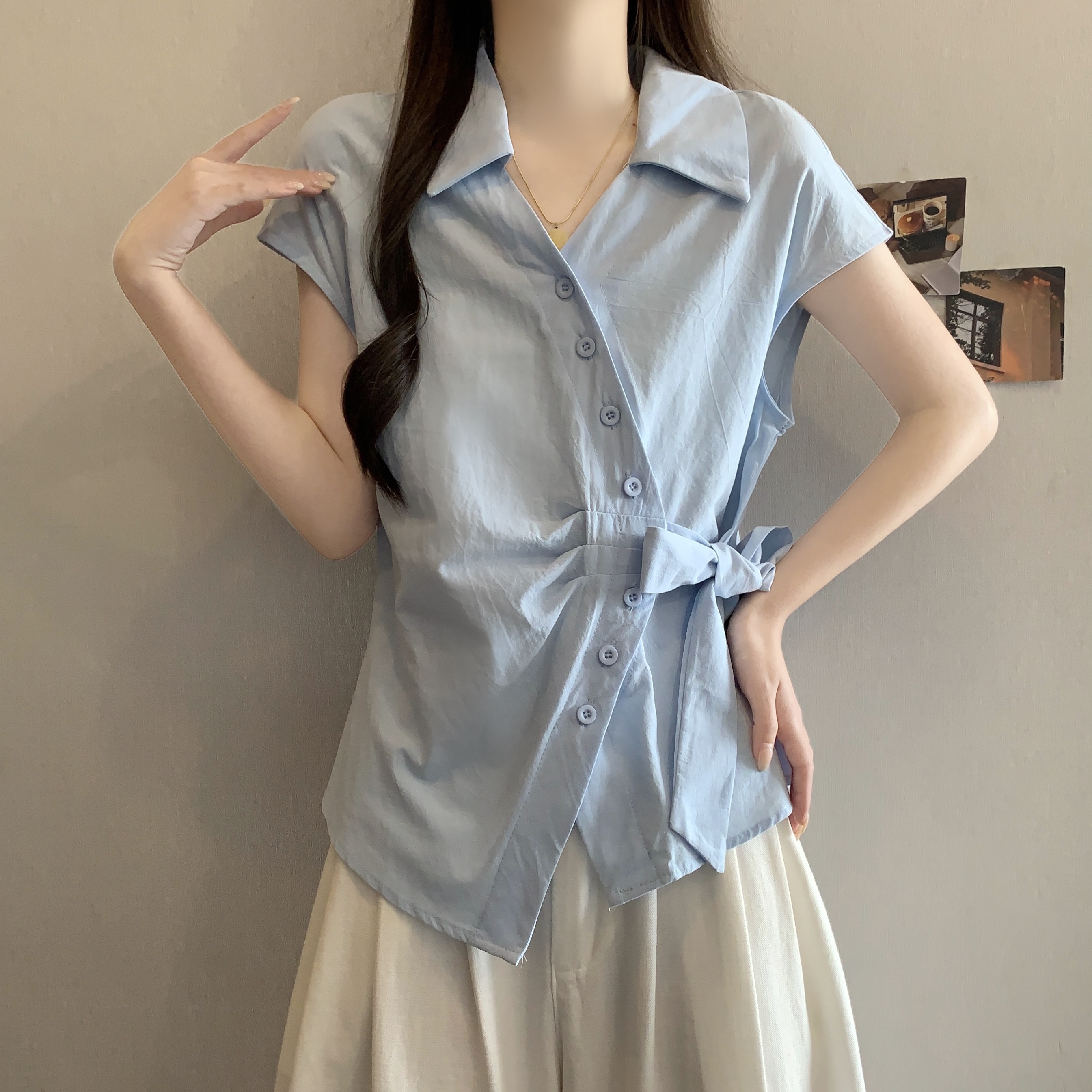 RY1116# 不规则交叉V领短袖外穿衬衫女春夏大码胖mm显瘦系带收腰遮肚上衣
