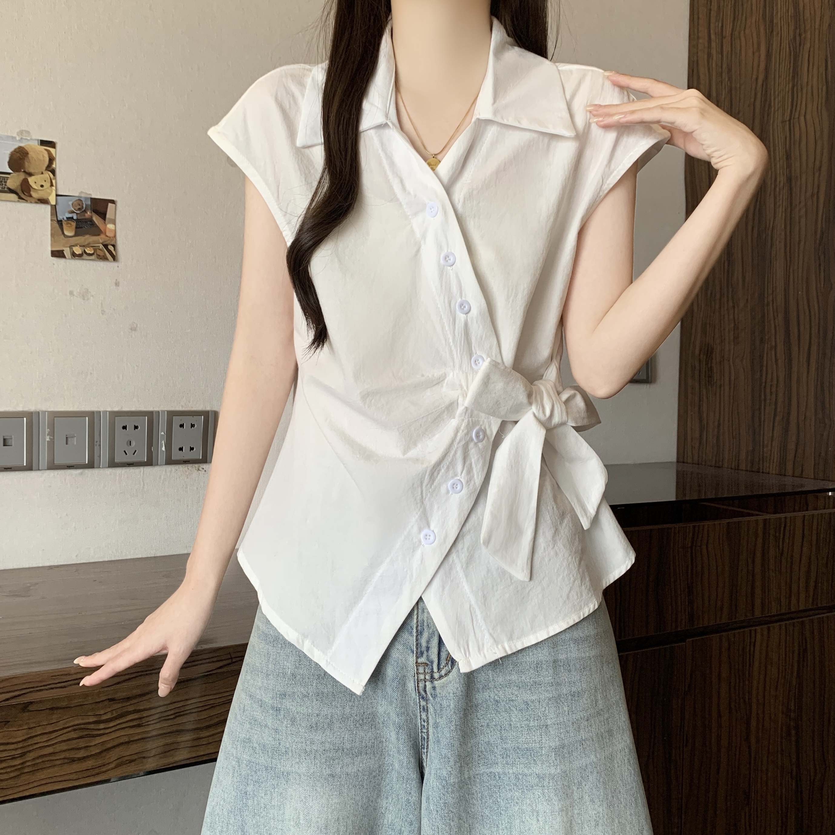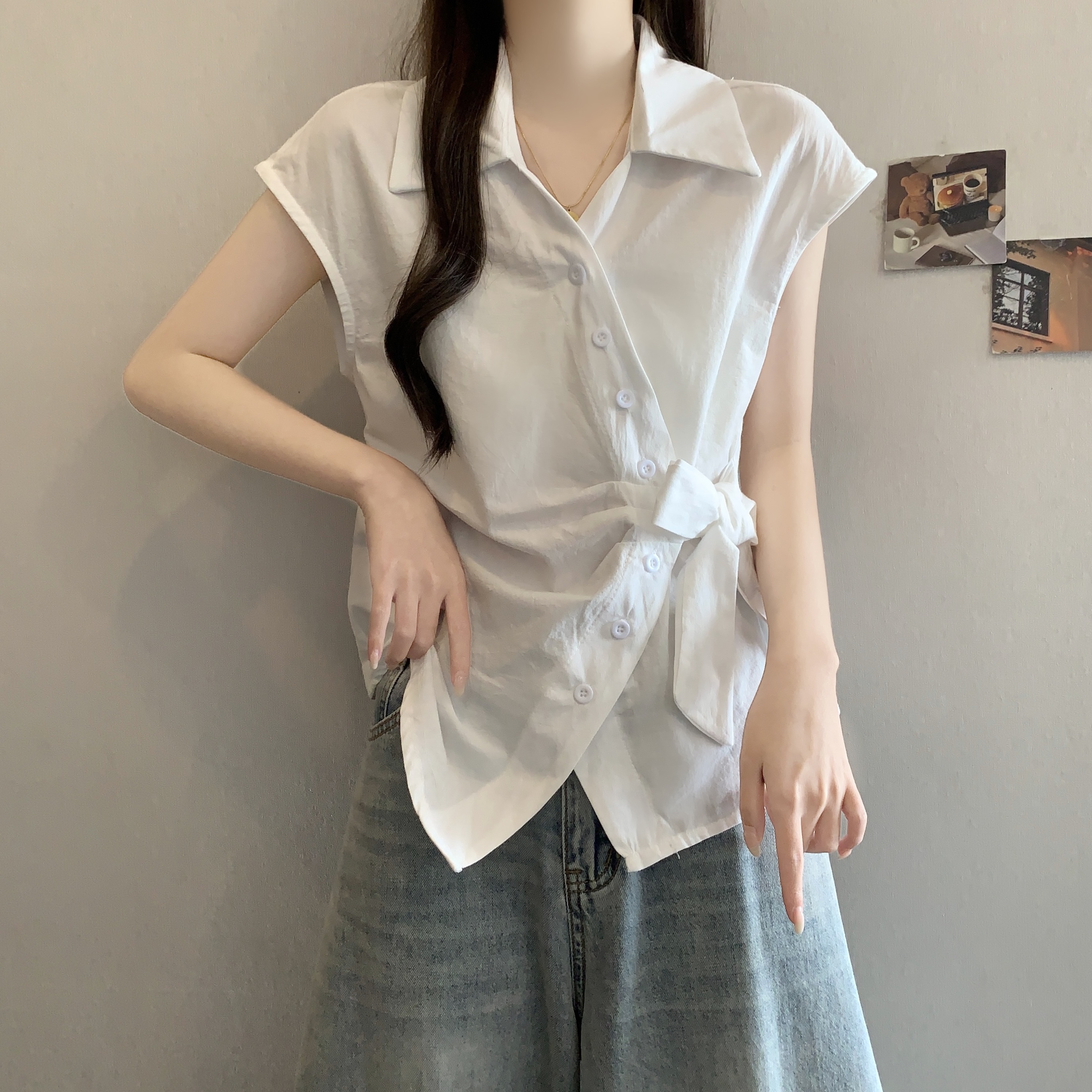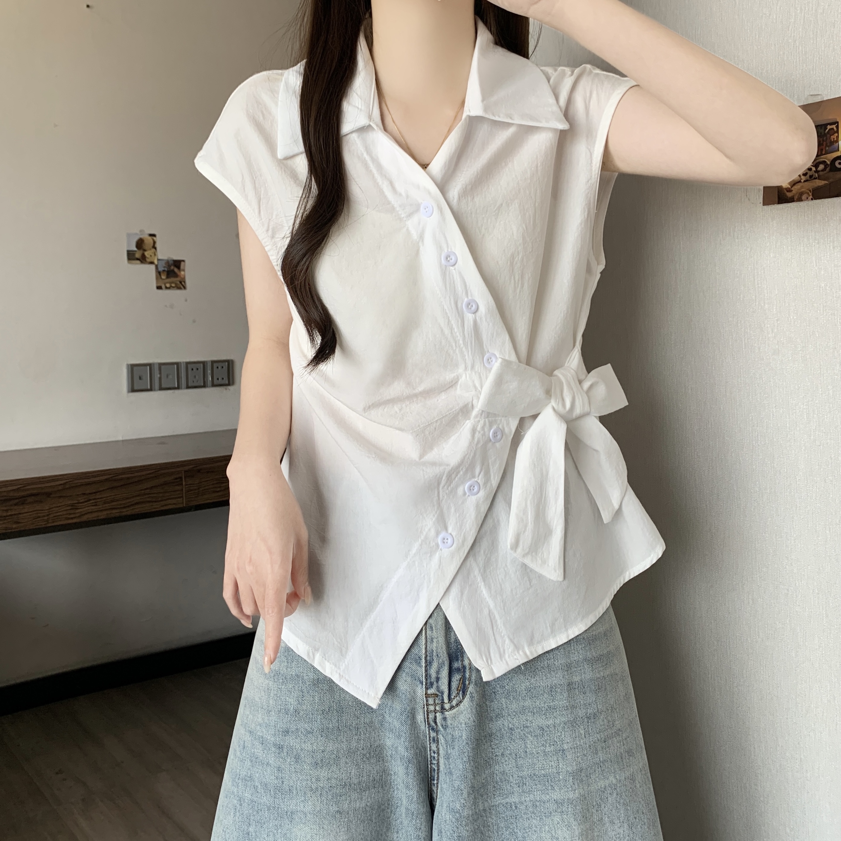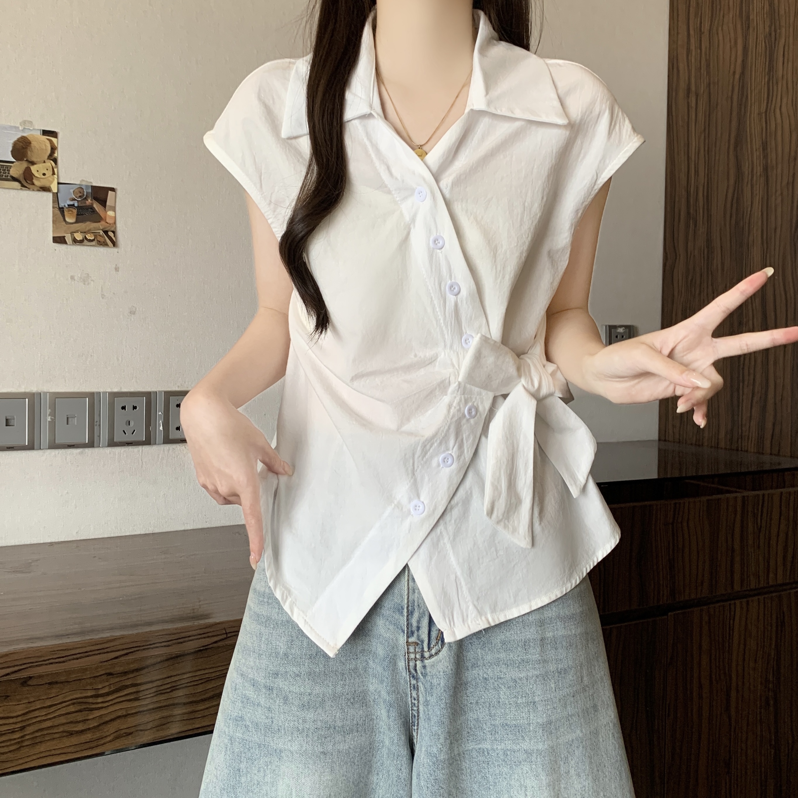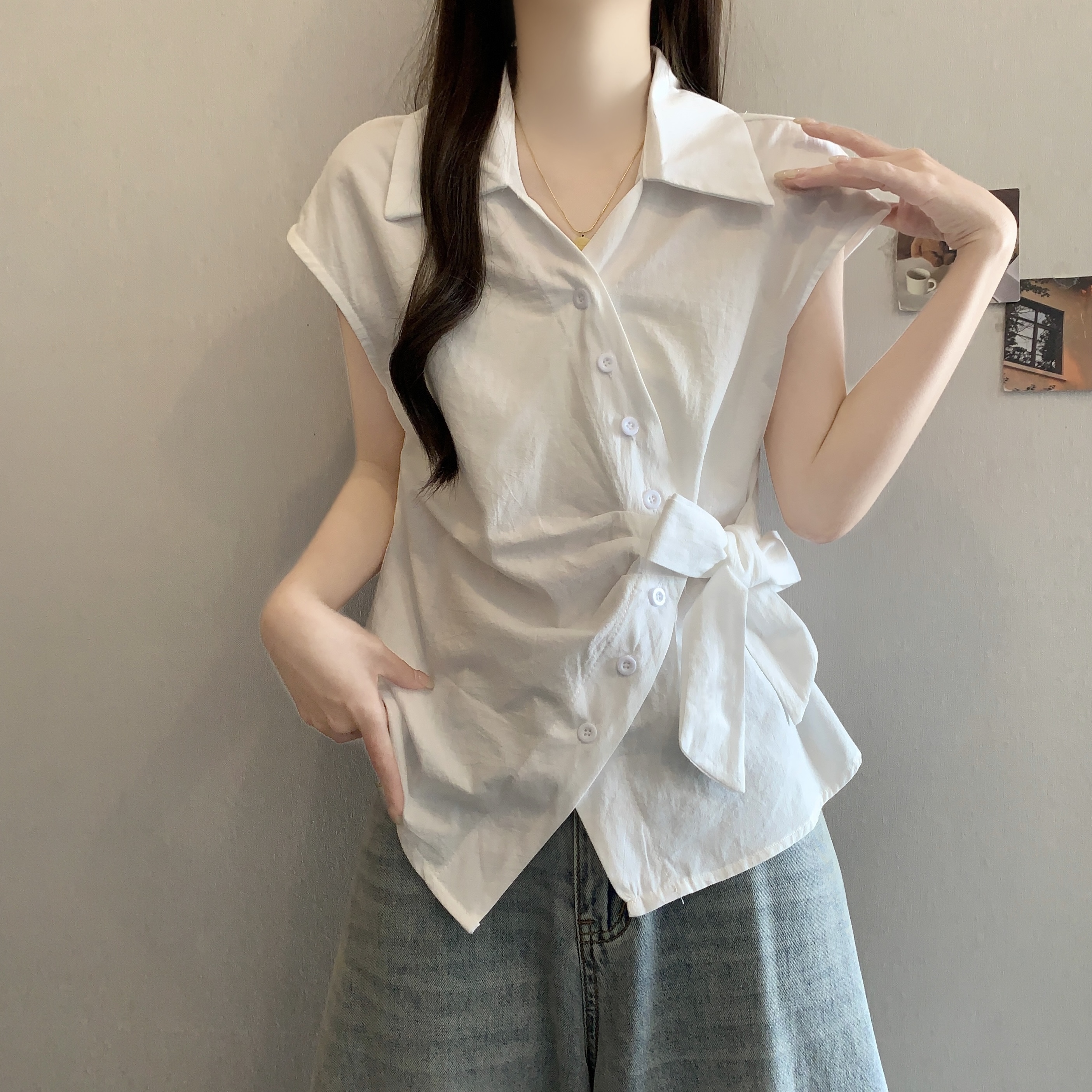 RY1116# 不规则交叉V领短袖外穿衬衫女春夏大码胖mm显瘦系带收腰遮肚上衣