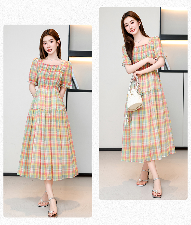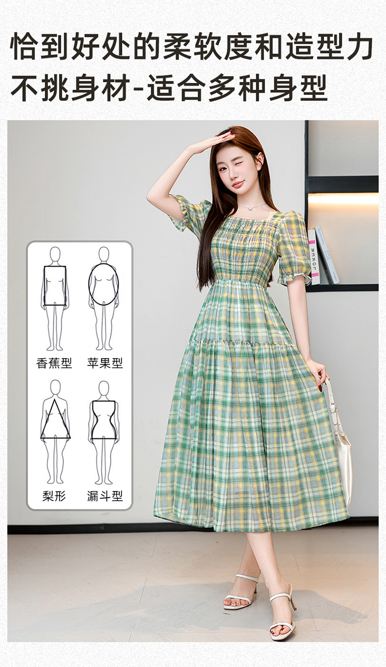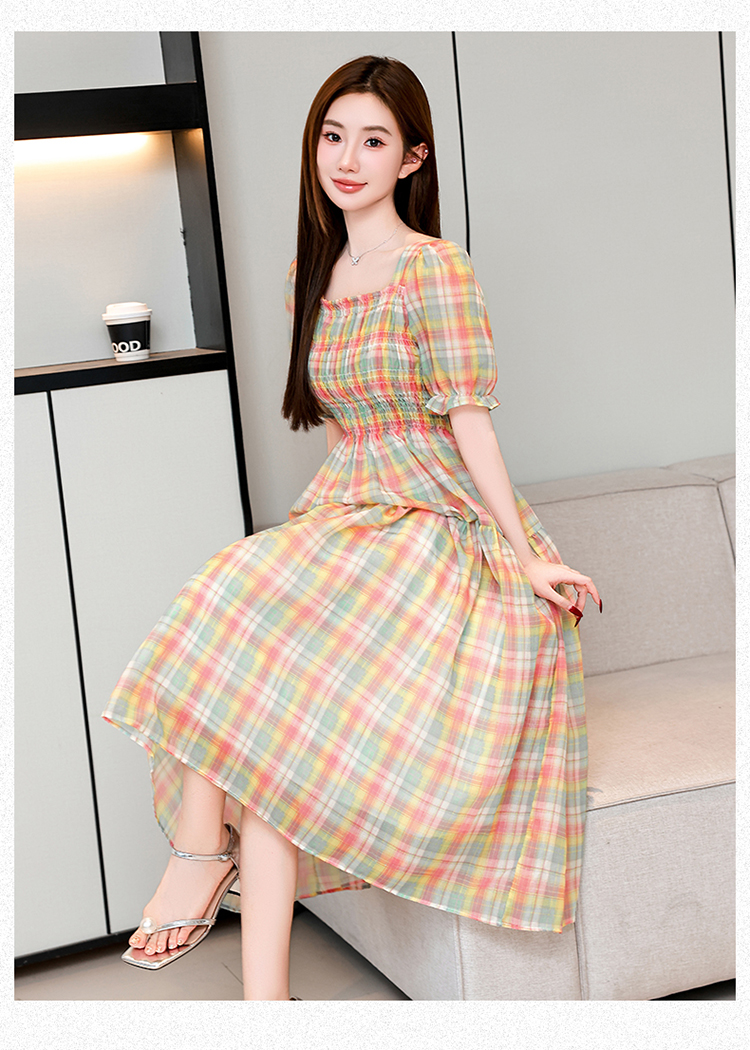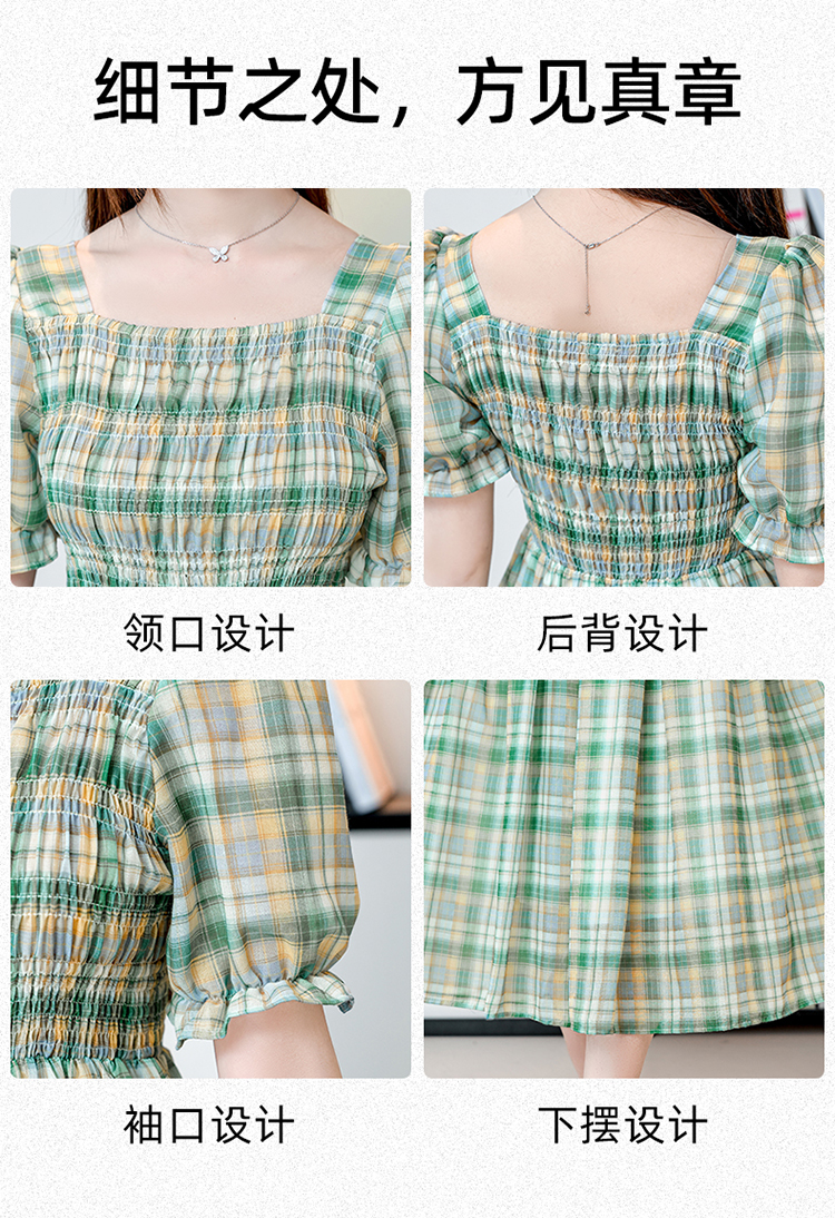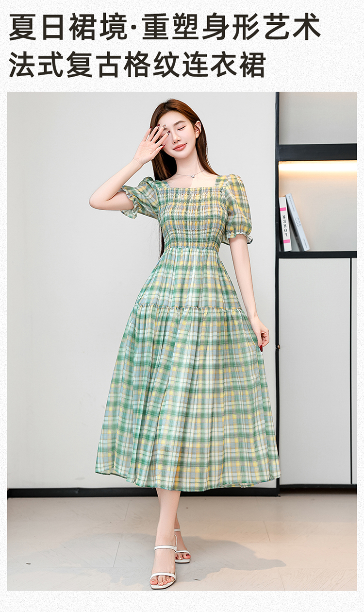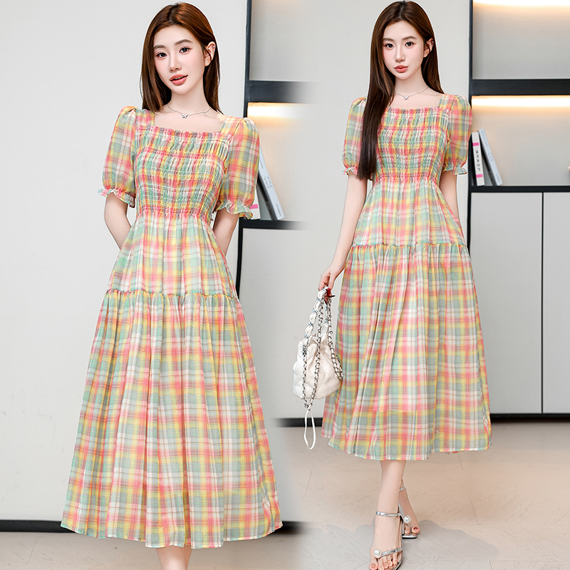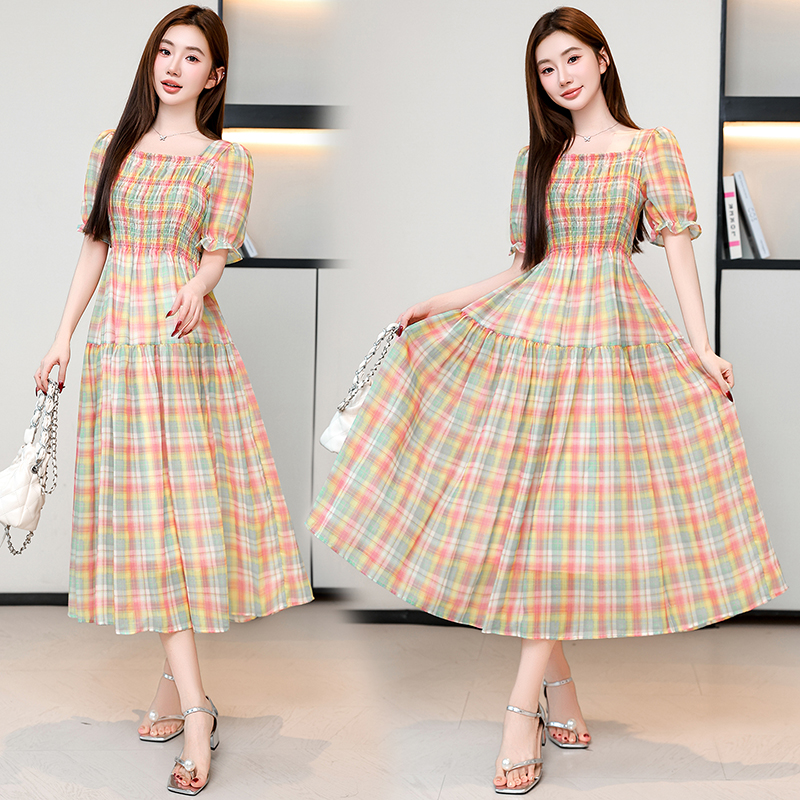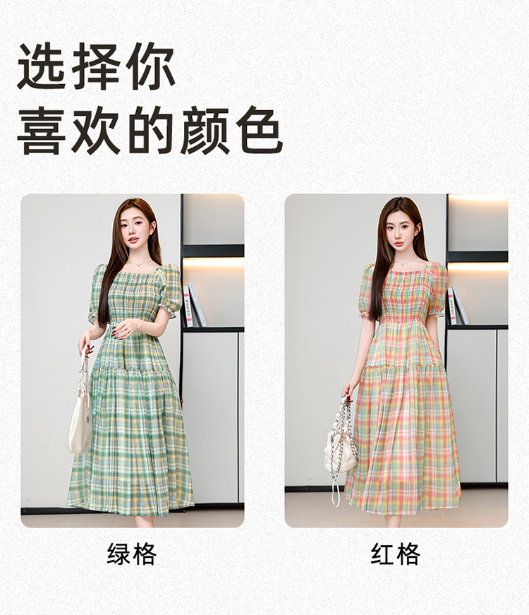 RY1143# 有口袋新款大码微胖泡泡袖格子连衣裙女夏季胖MM设计感方领收腰裙