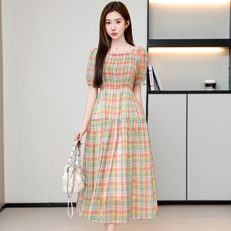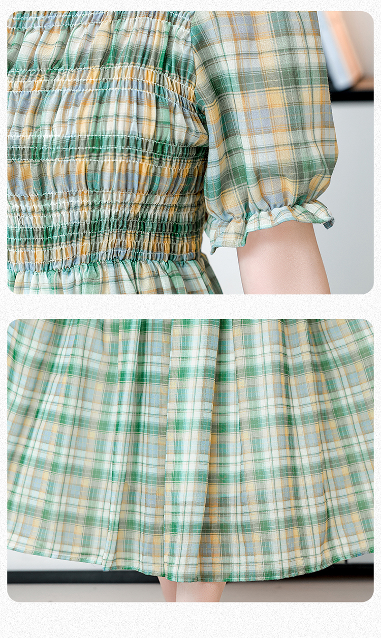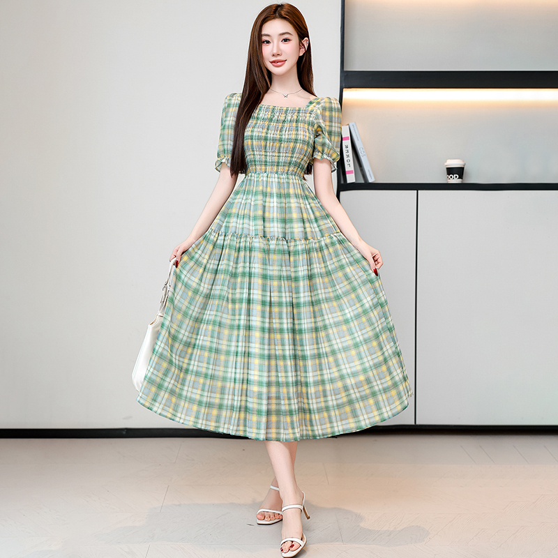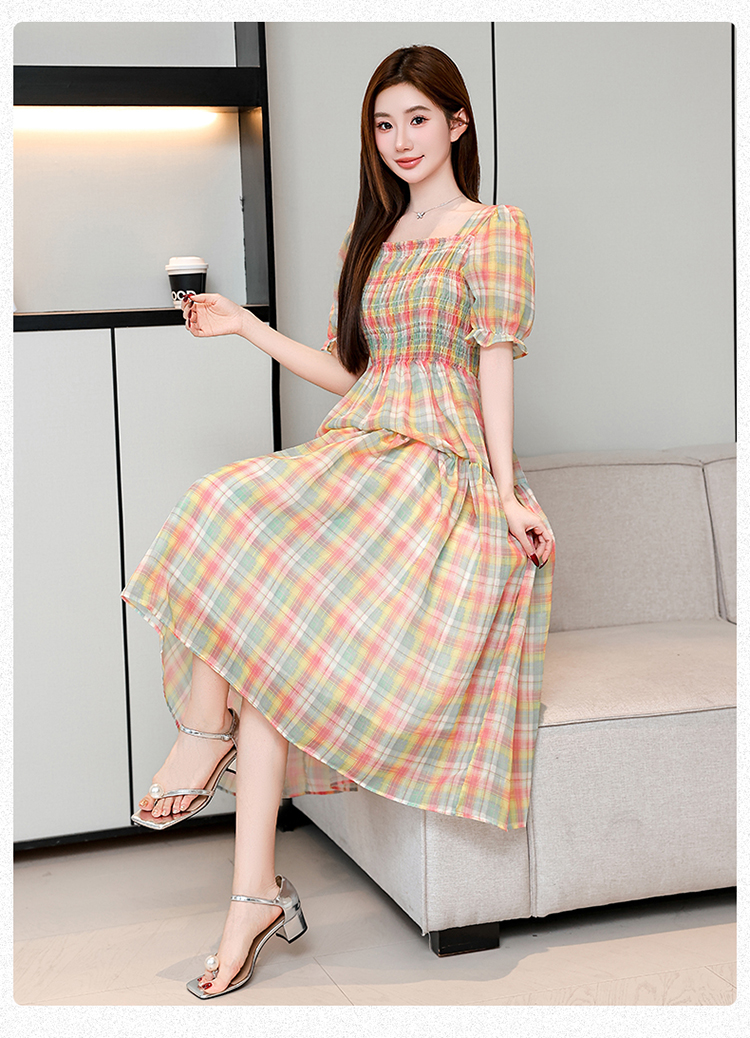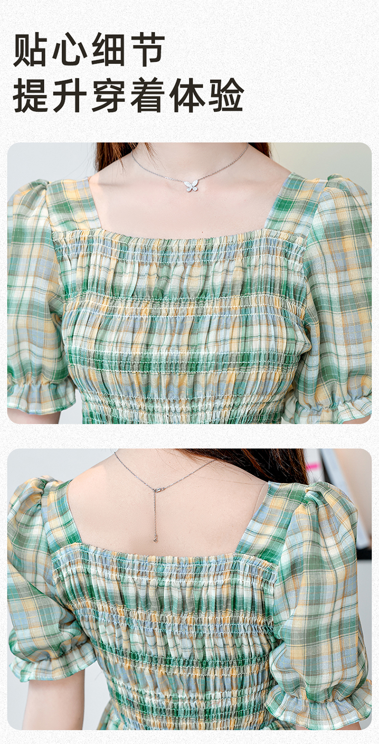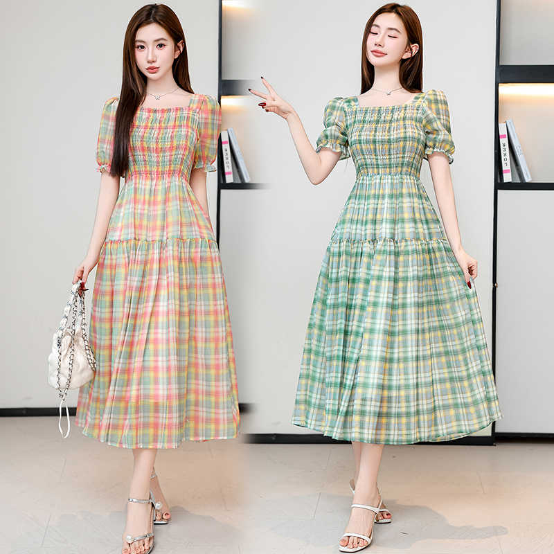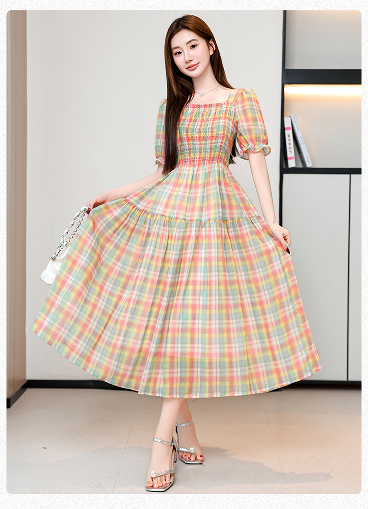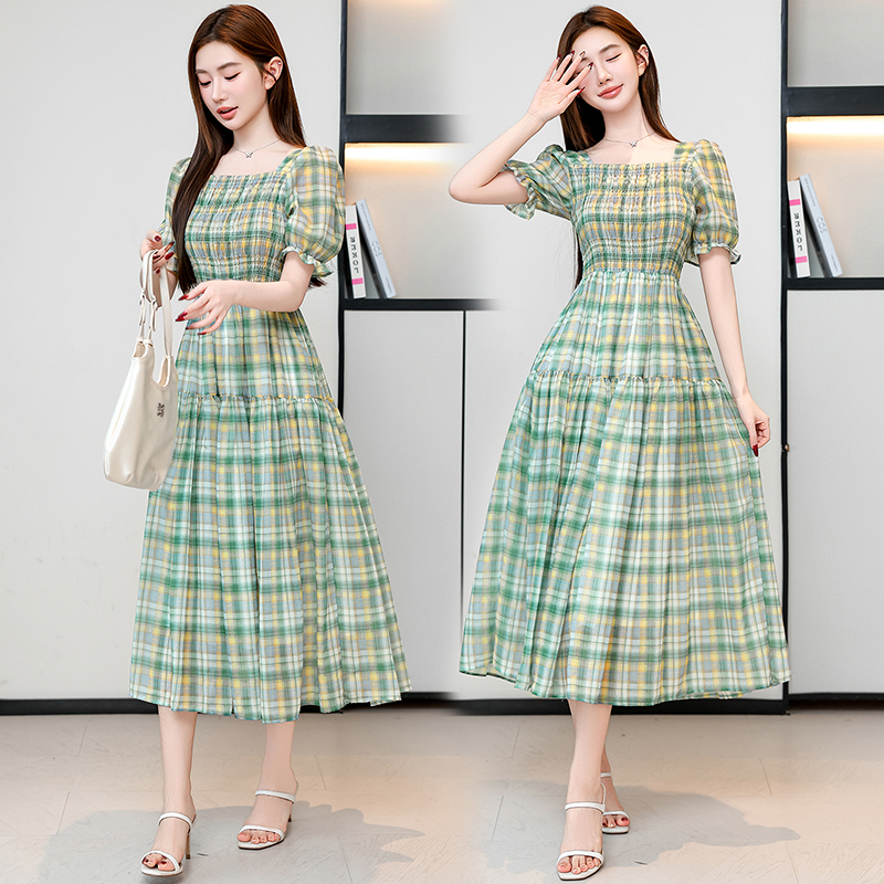 RY1143# 有口袋新款大码微胖泡泡袖格子连衣裙女夏季胖MM设计感方领收腰裙