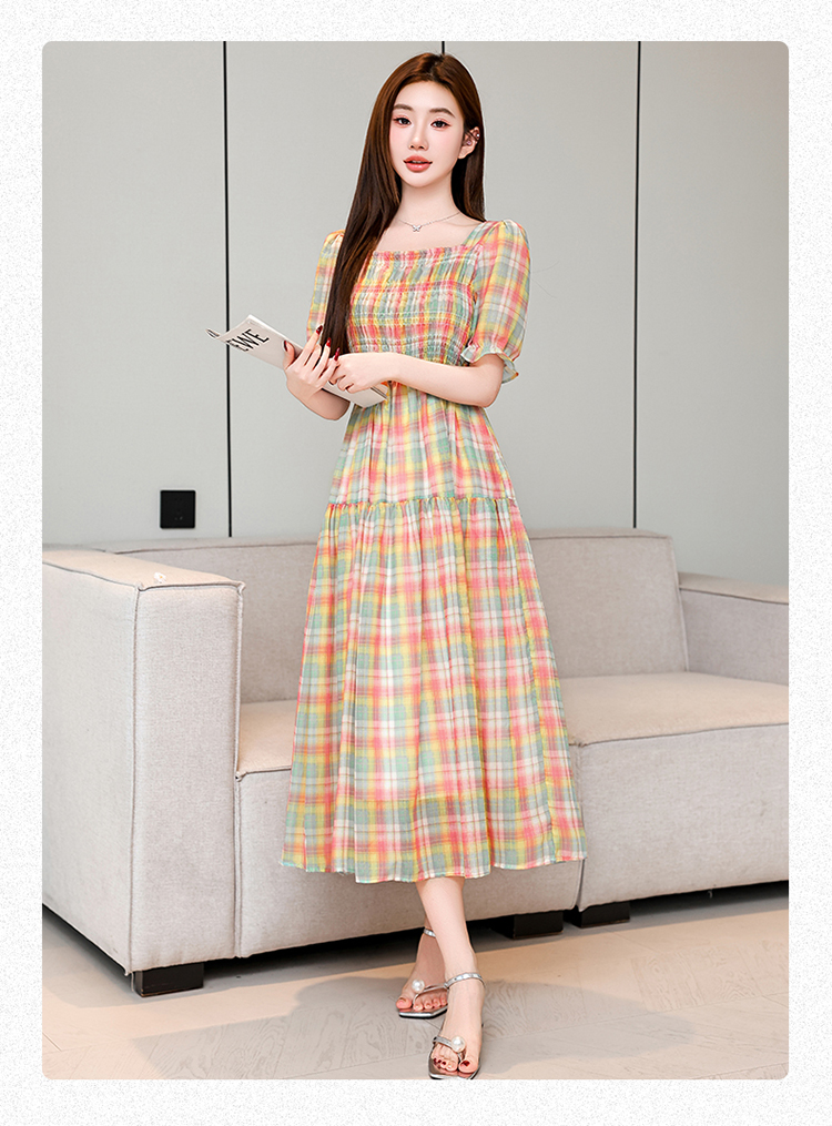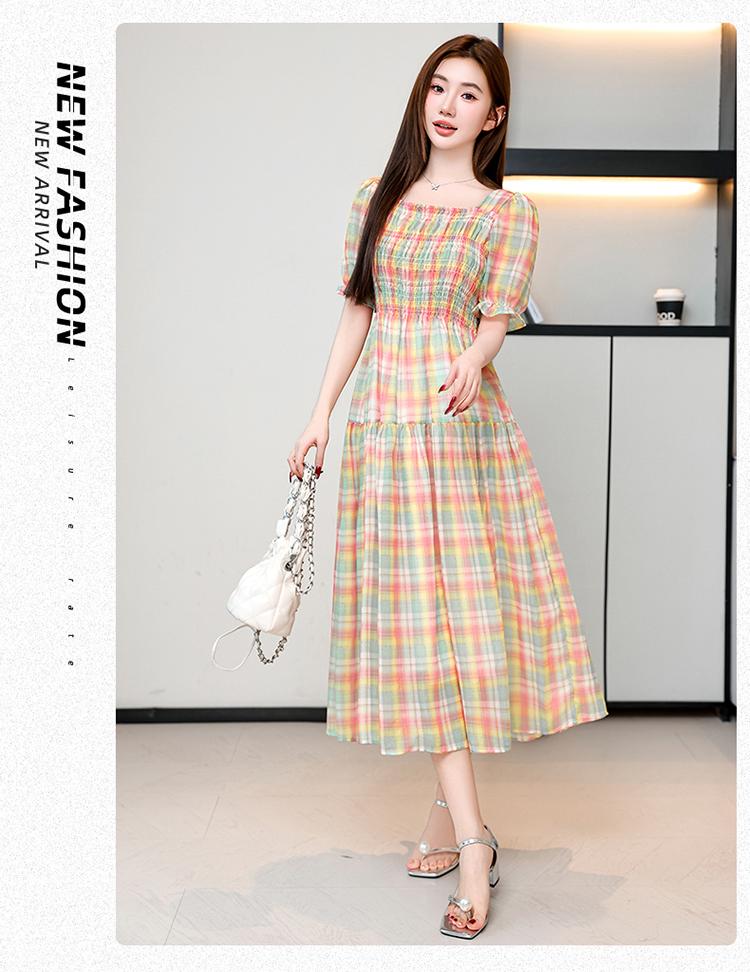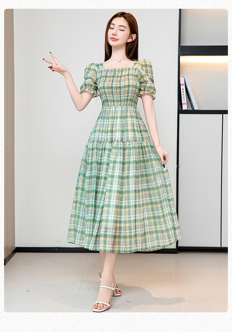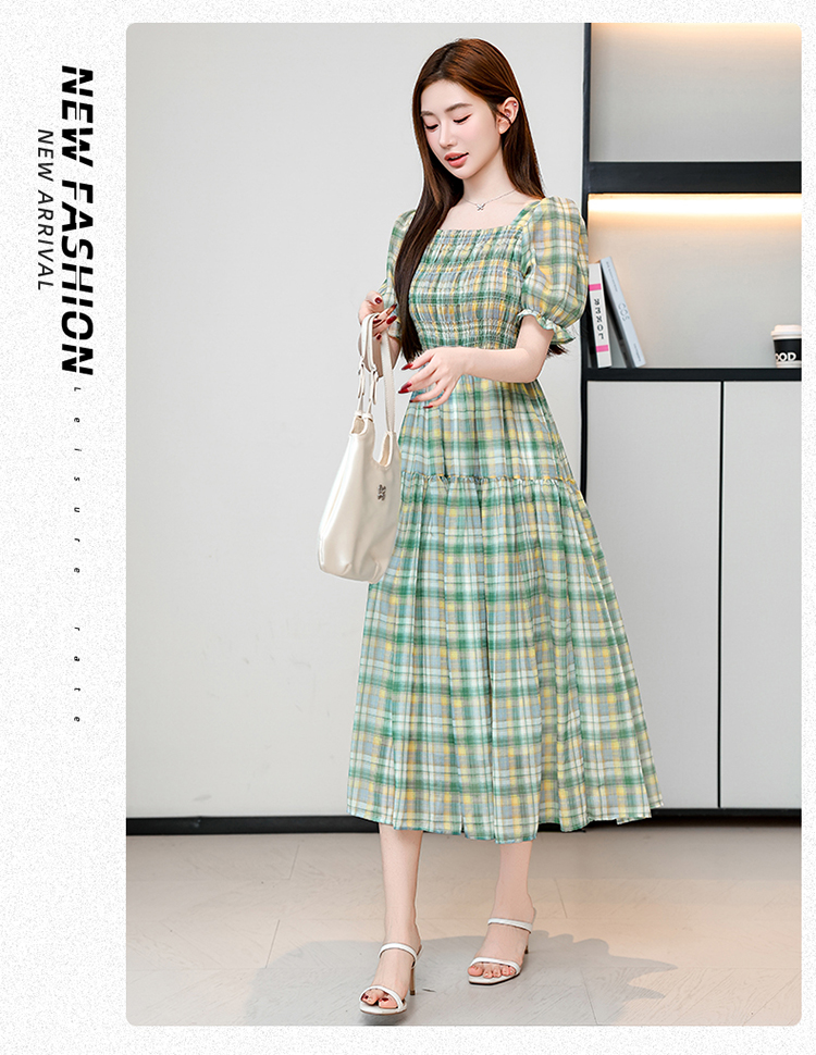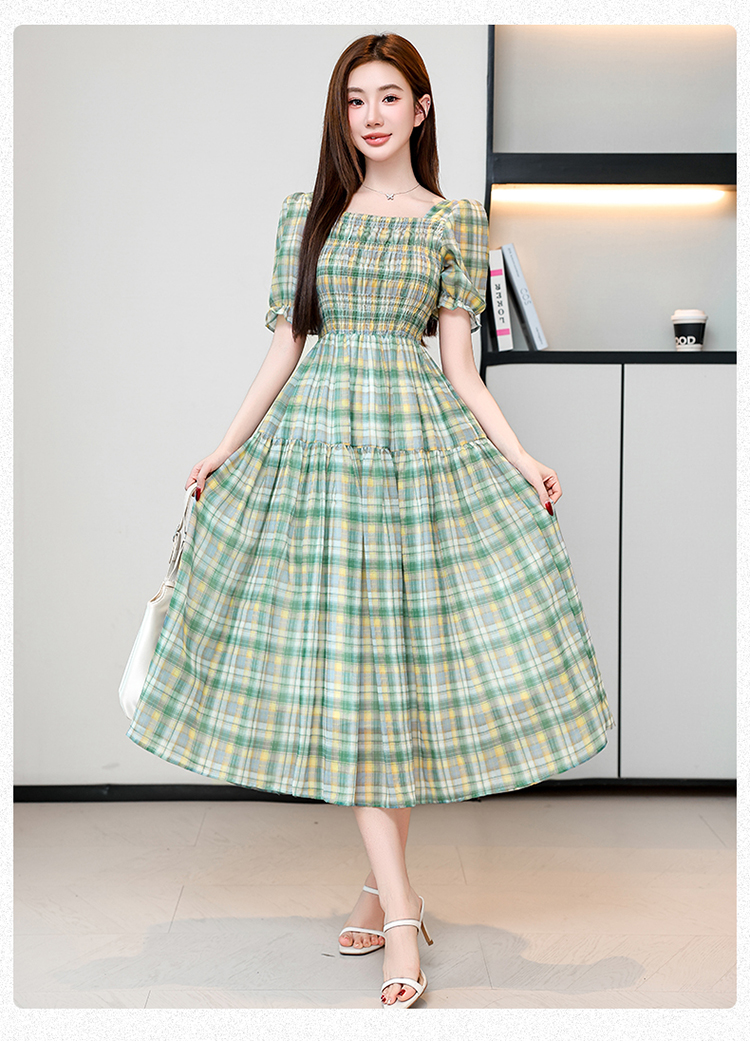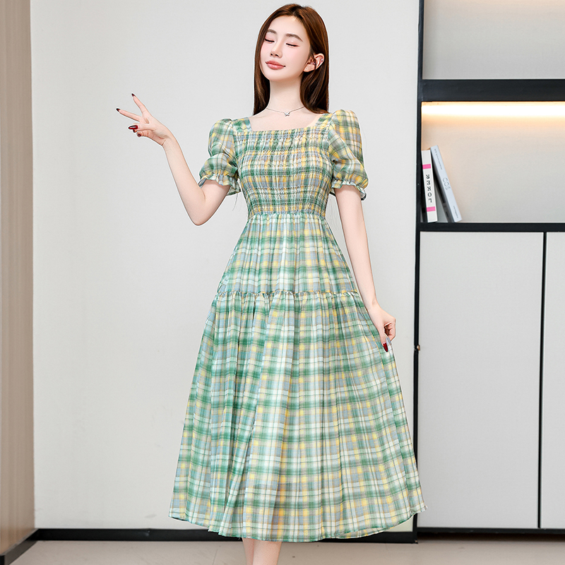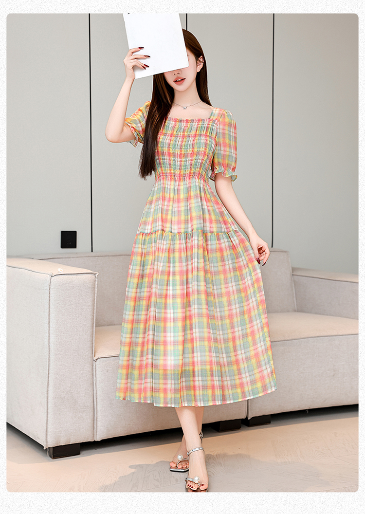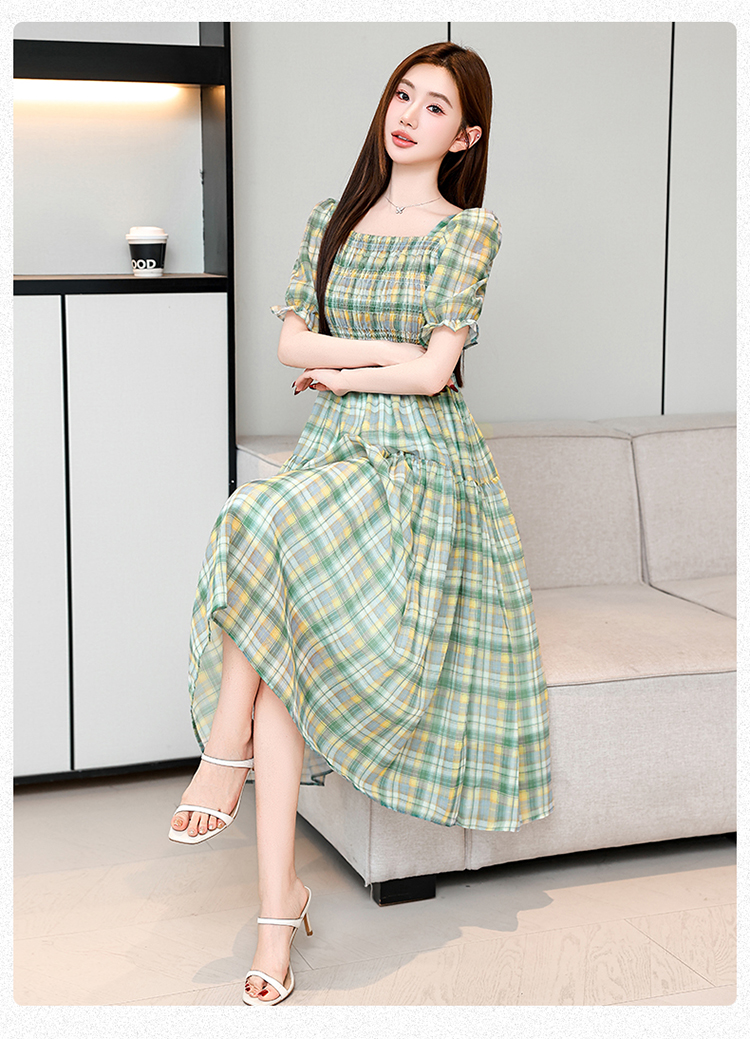 RY1143# 有口袋新款大码微胖泡泡袖格子连衣裙女夏季胖MM设计感方领收腰裙
