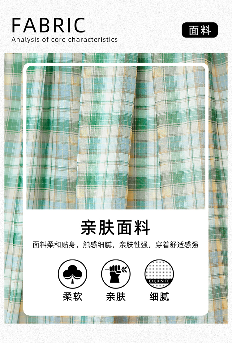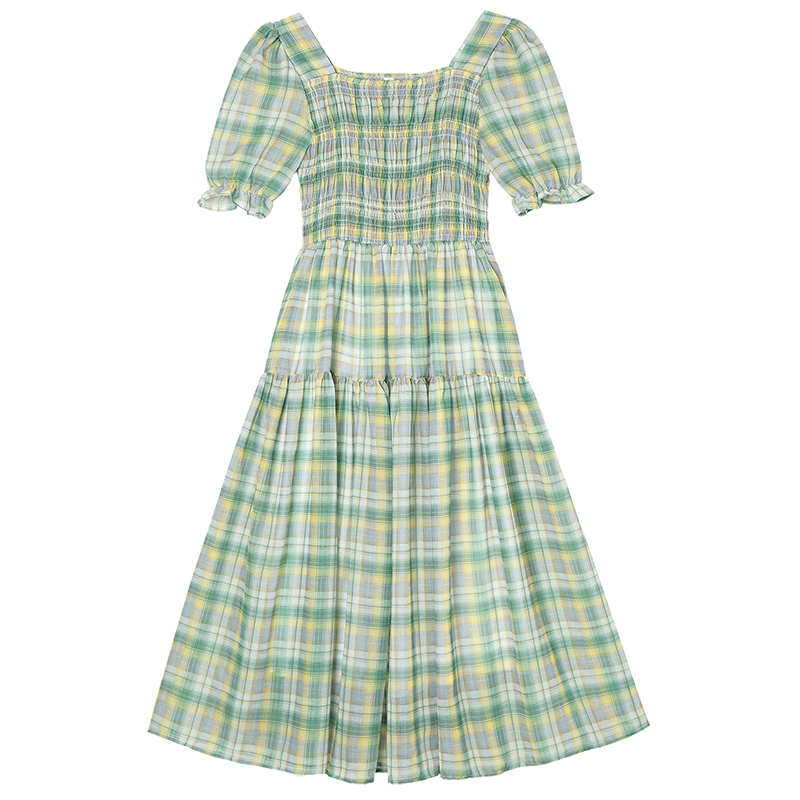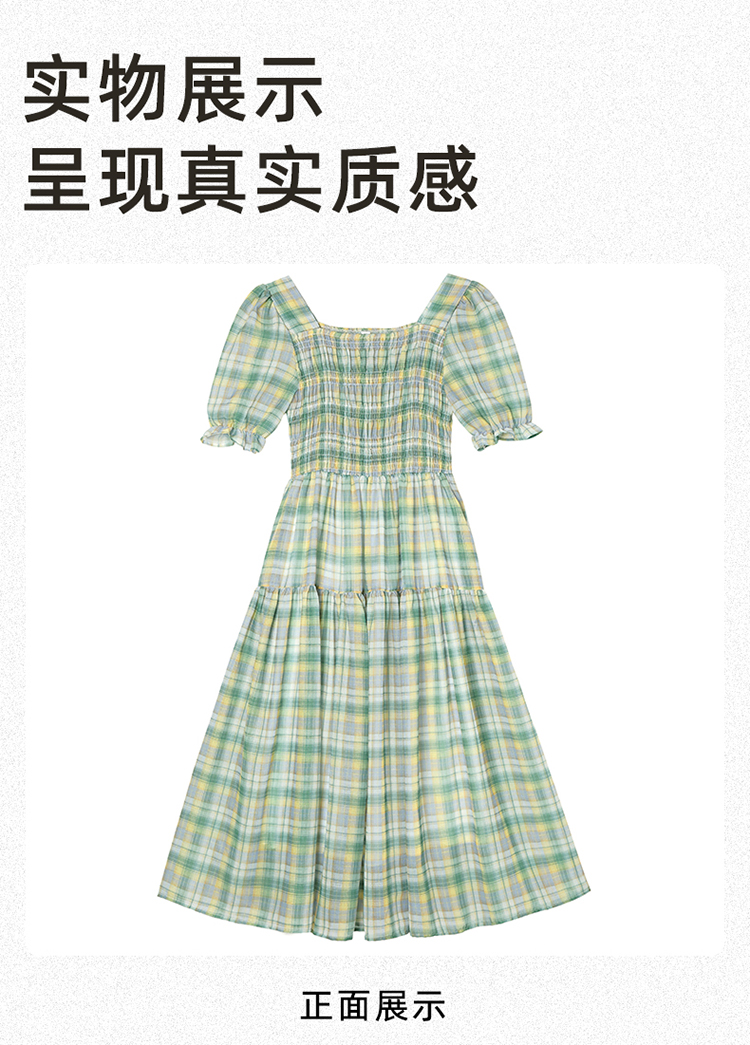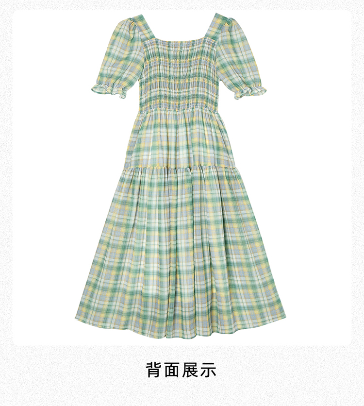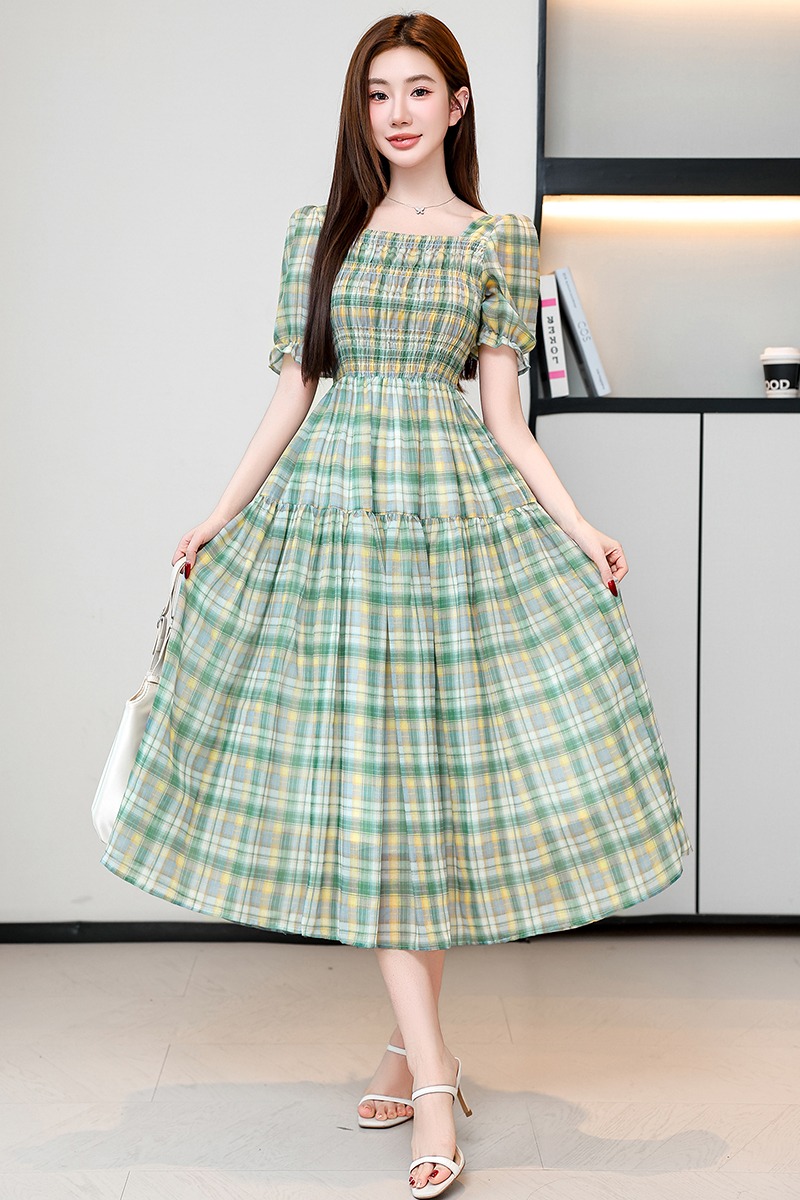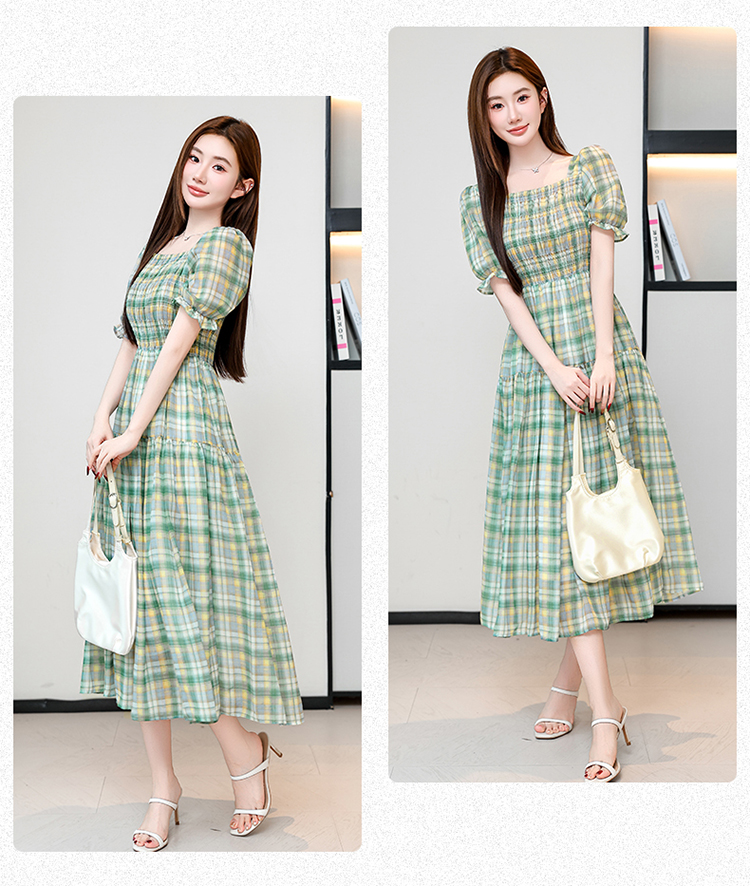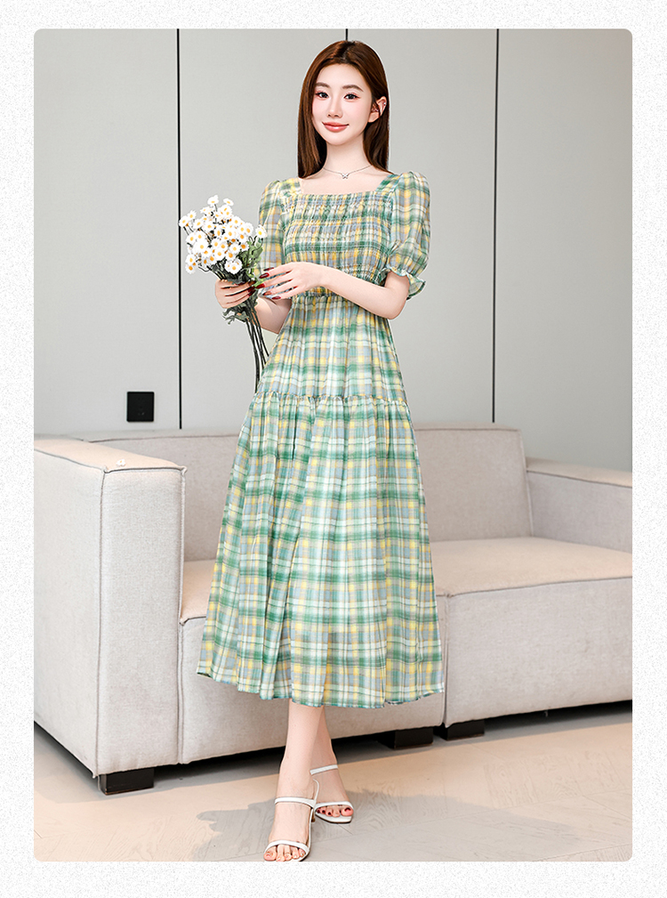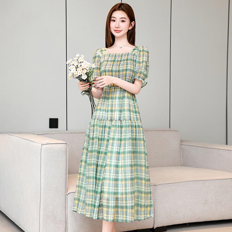 RY1143# 有口袋新款大码微胖泡泡袖格子连衣裙女夏季胖MM设计感方领收腰裙