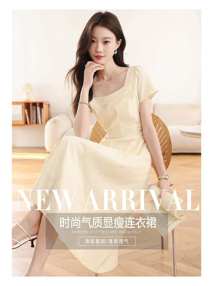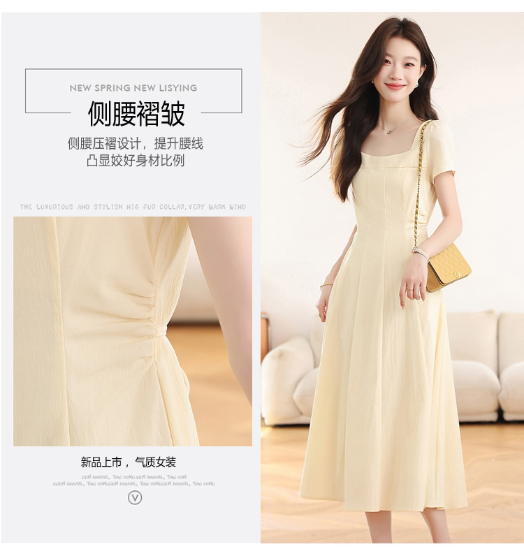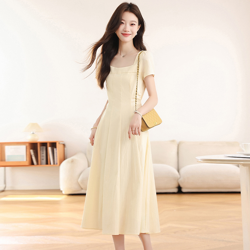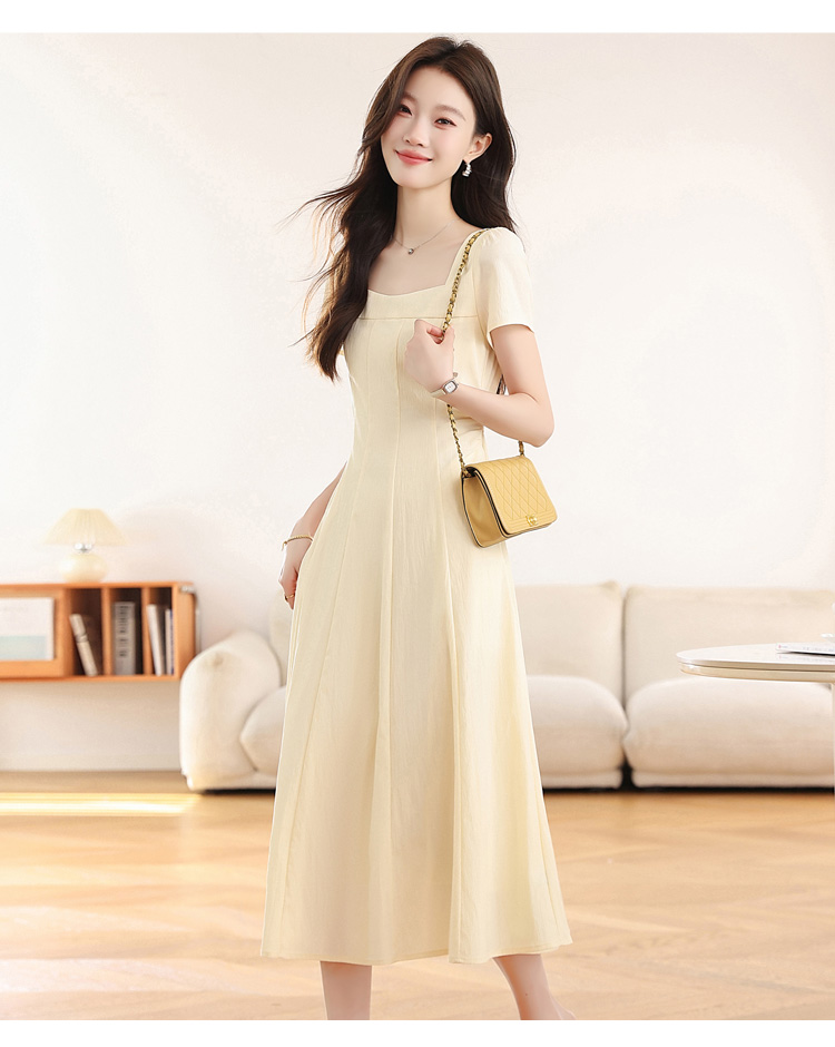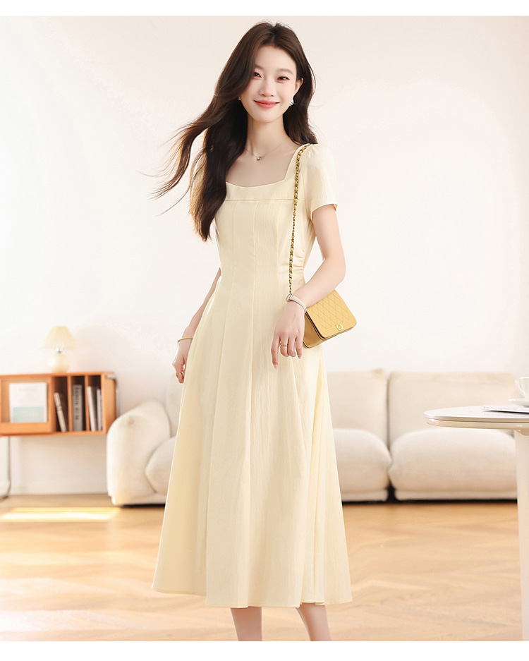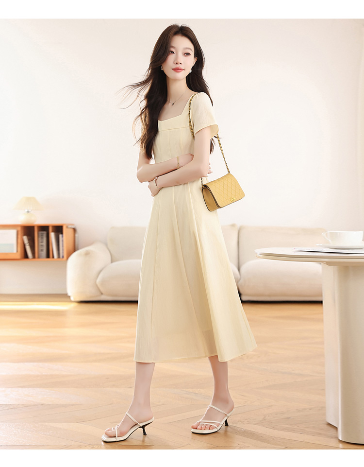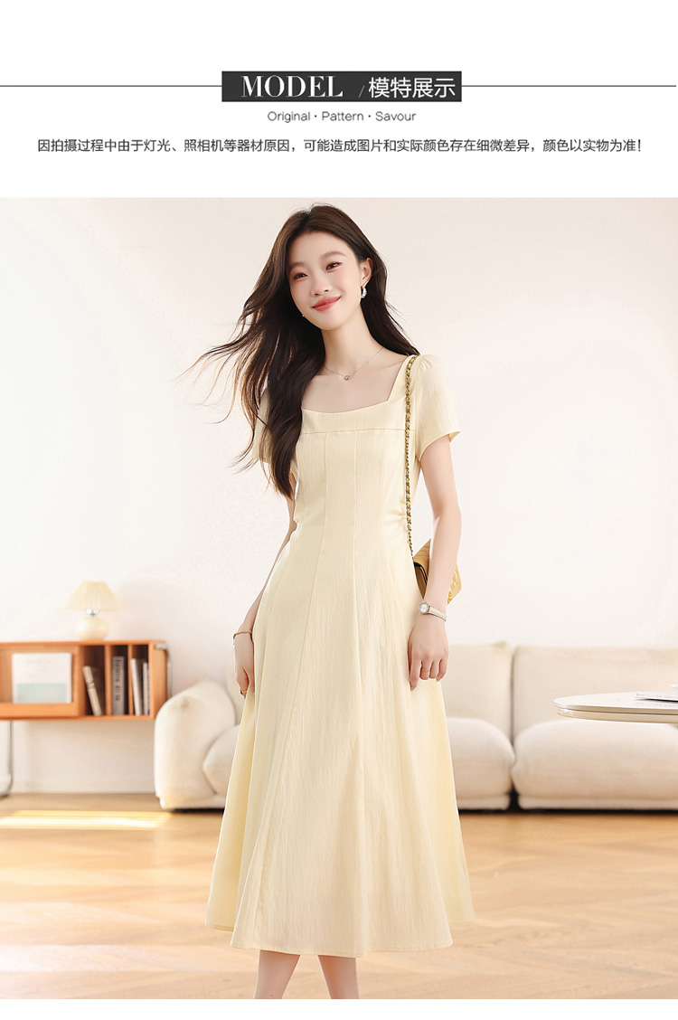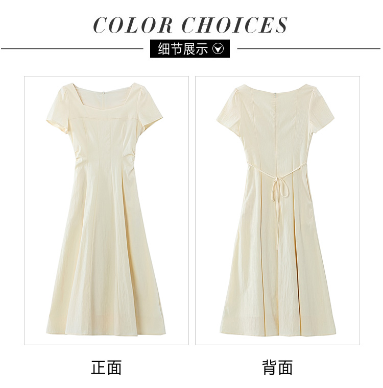 RY1156# 实拍匿名月光法式方领气质浅色短袖连衣裙女夏季收腰长裙子