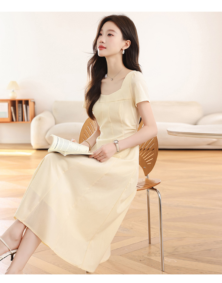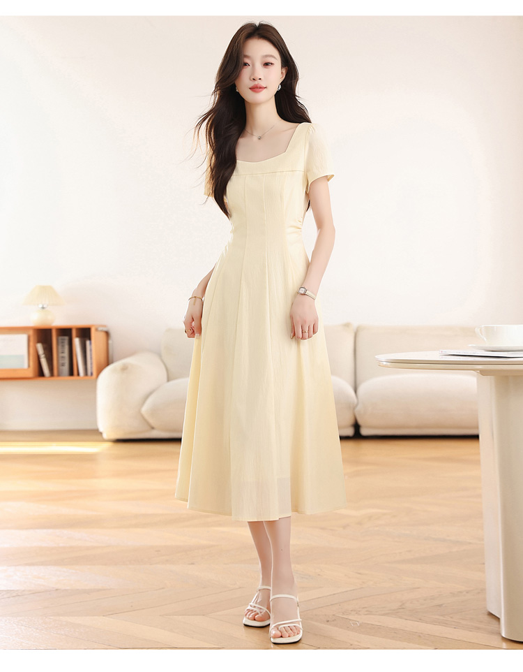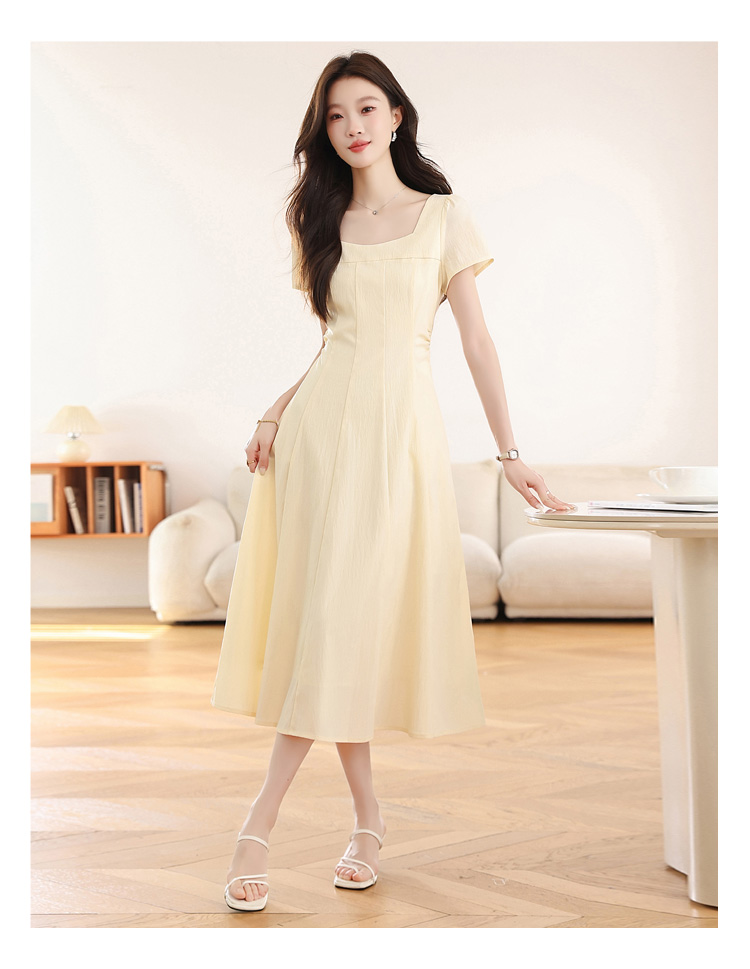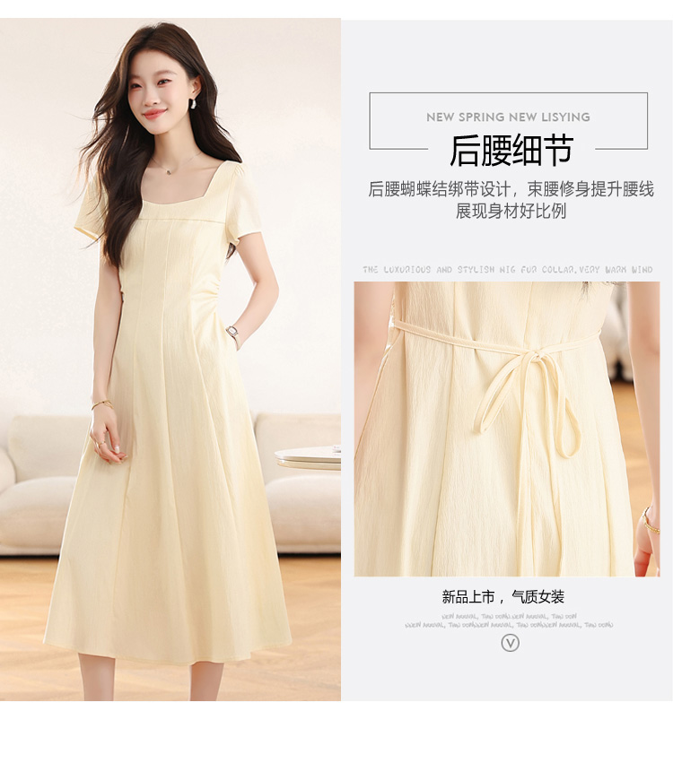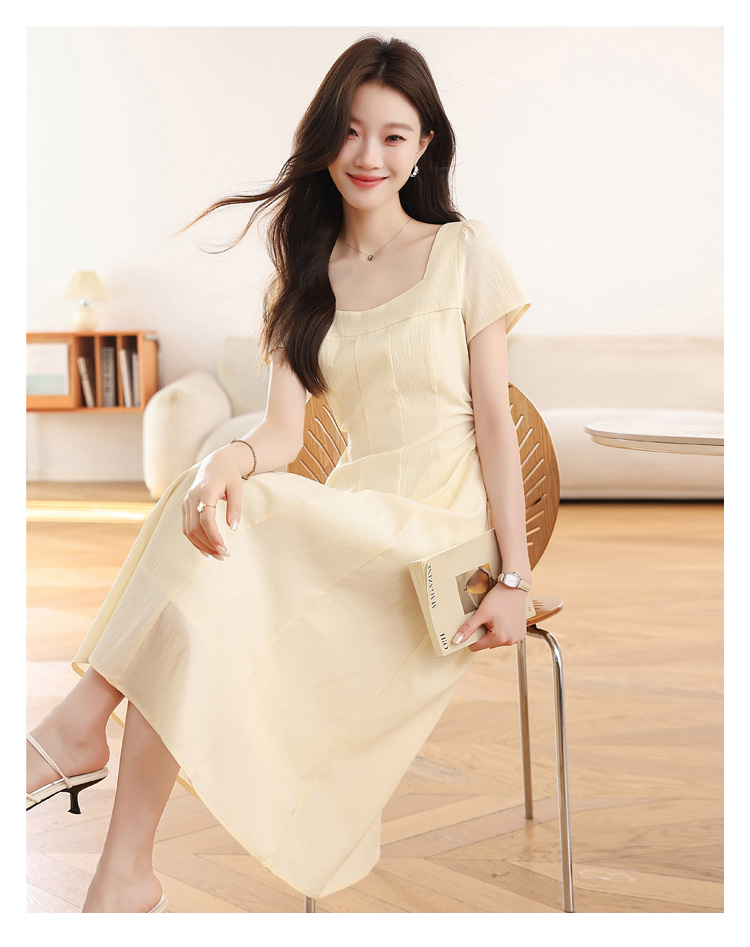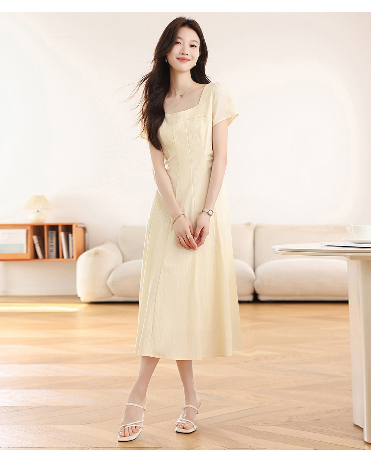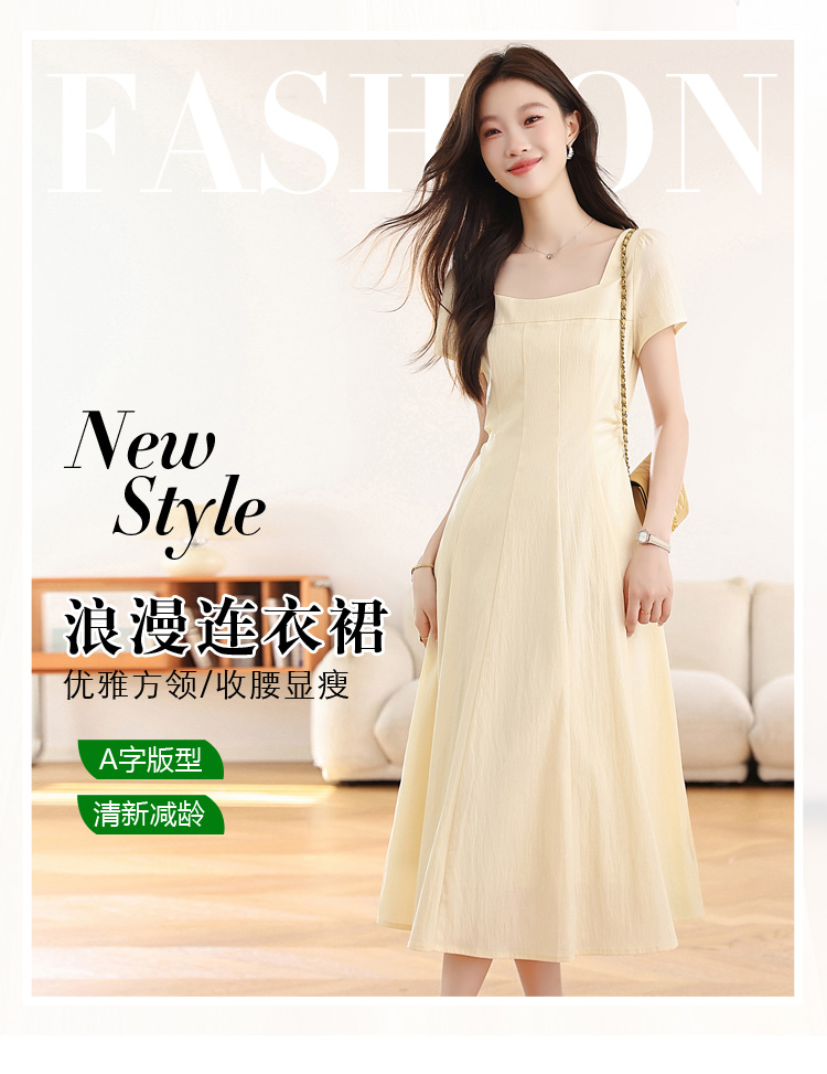 RY1156# 实拍匿名月光法式方领气质浅色短袖连衣裙女夏季收腰长裙子