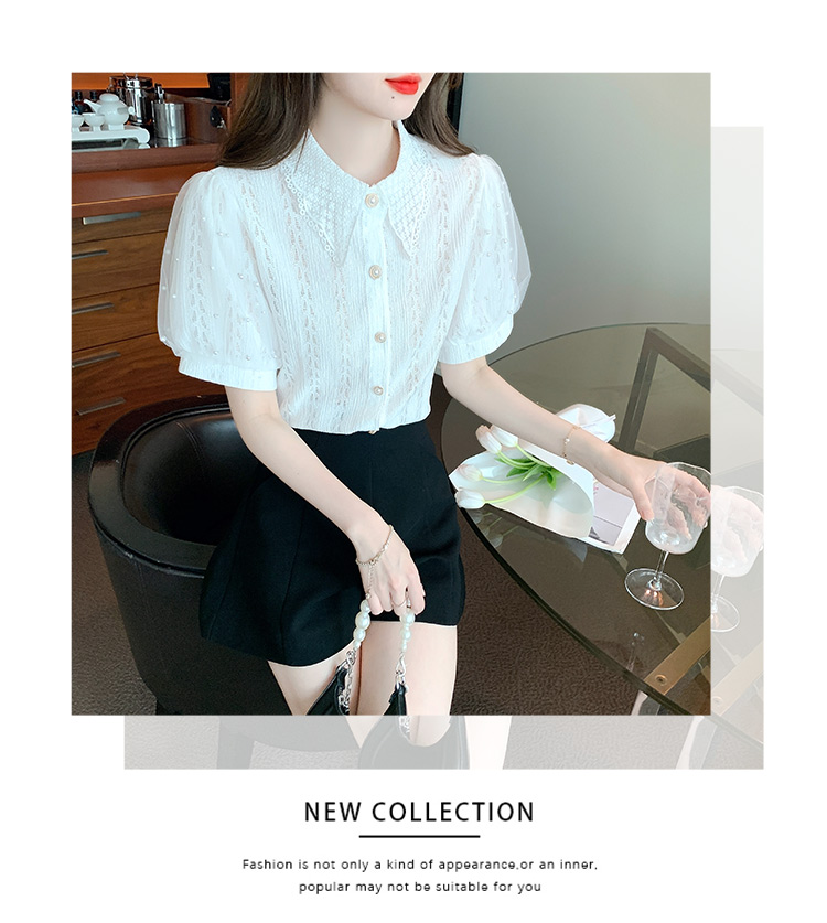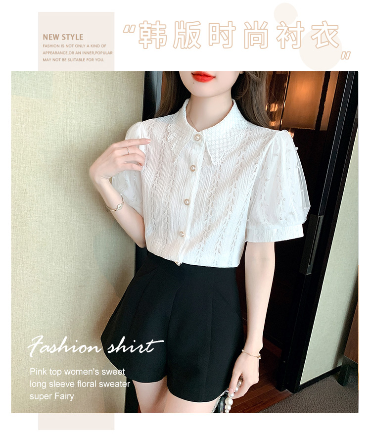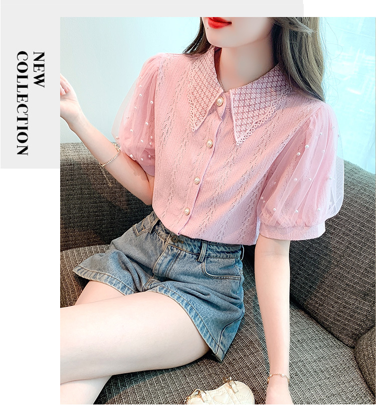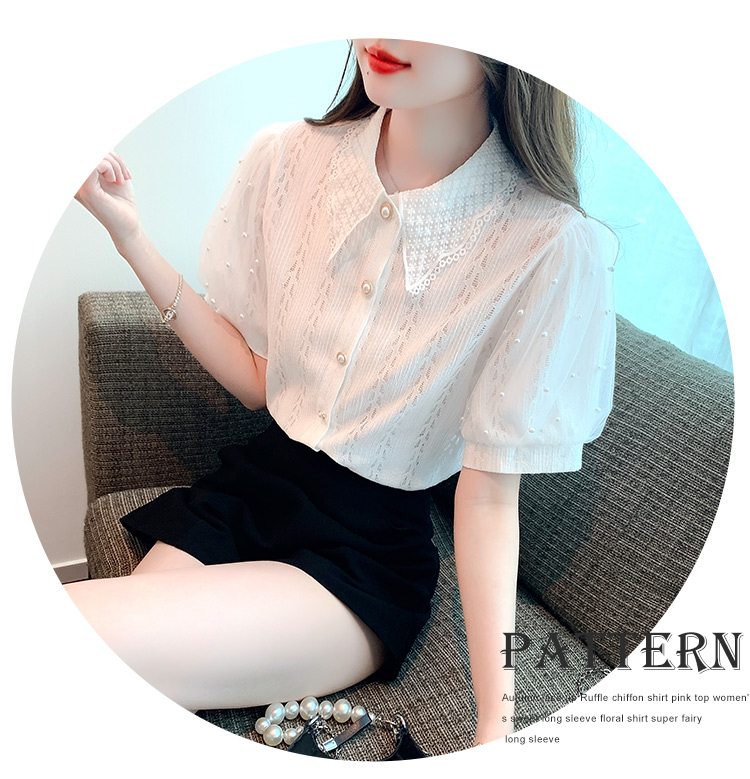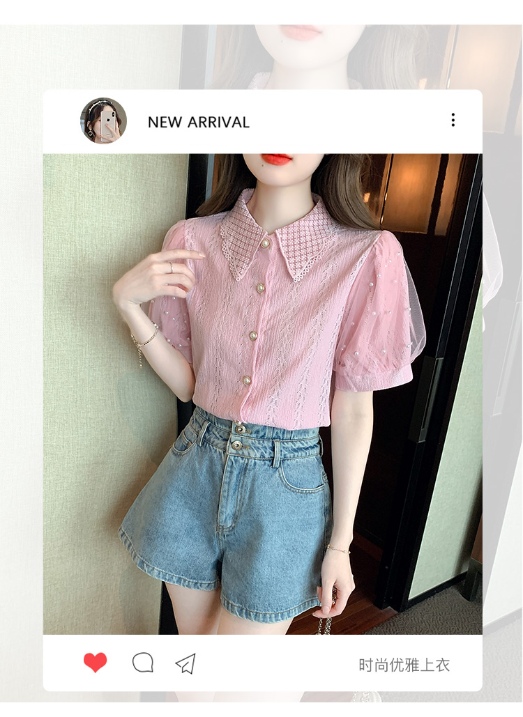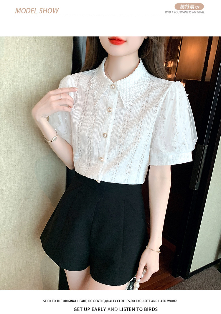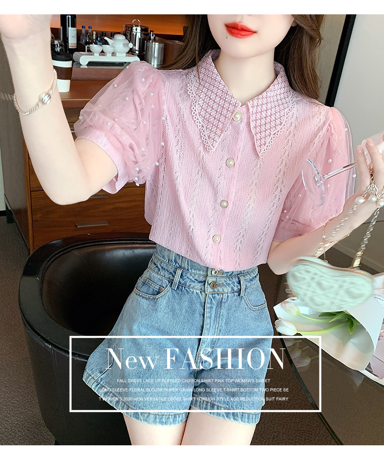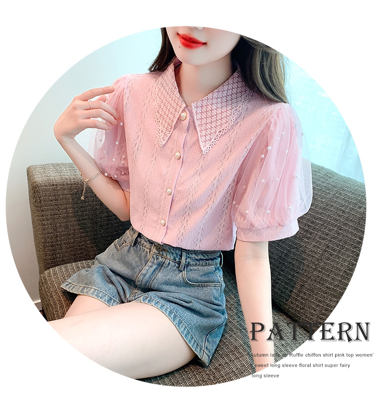 RY1168# 网纱雪纺衬衣女夏季2026新款时尚甜美娃娃领镂空泡泡短袖蕾丝上衣