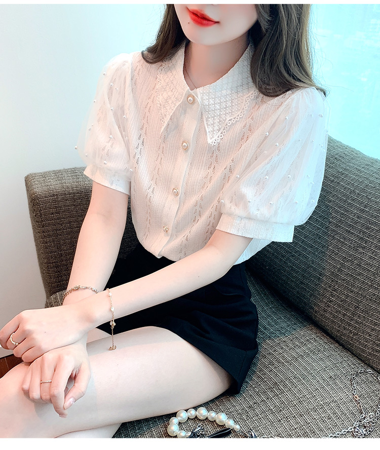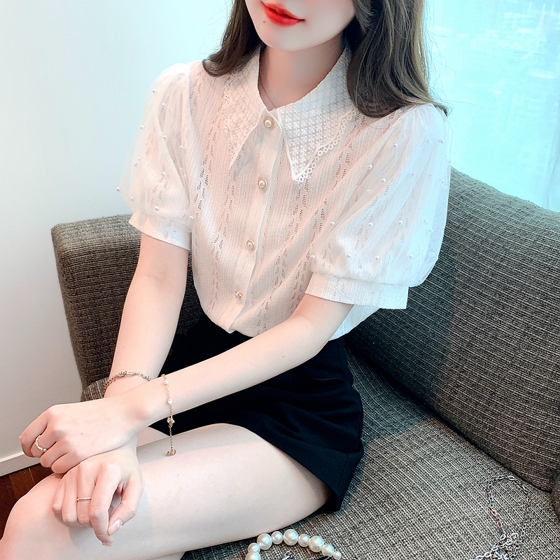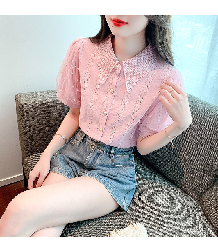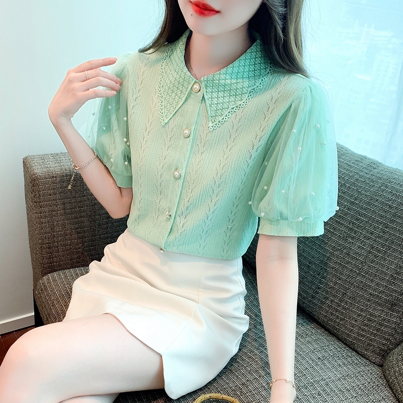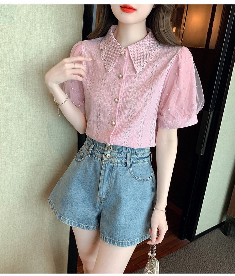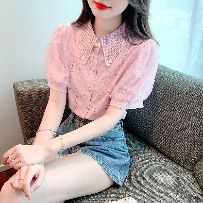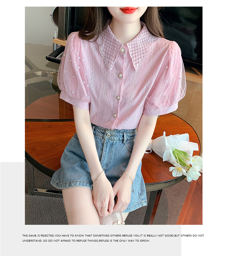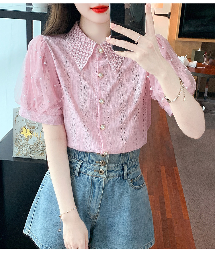 RY1168# 网纱雪纺衬衣女夏季2026新款时尚甜美娃娃领镂空泡泡短袖蕾丝上衣