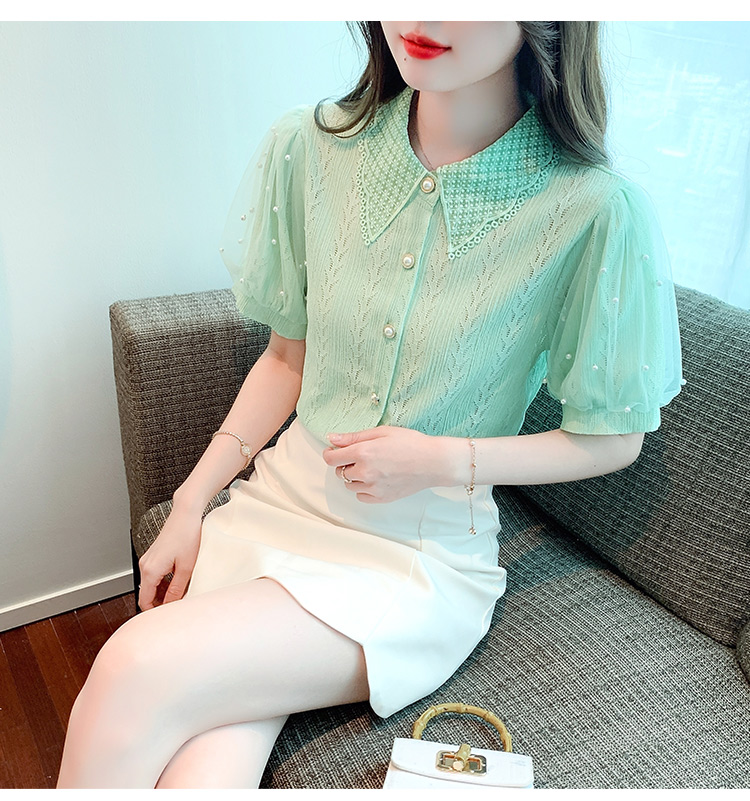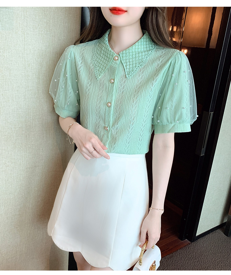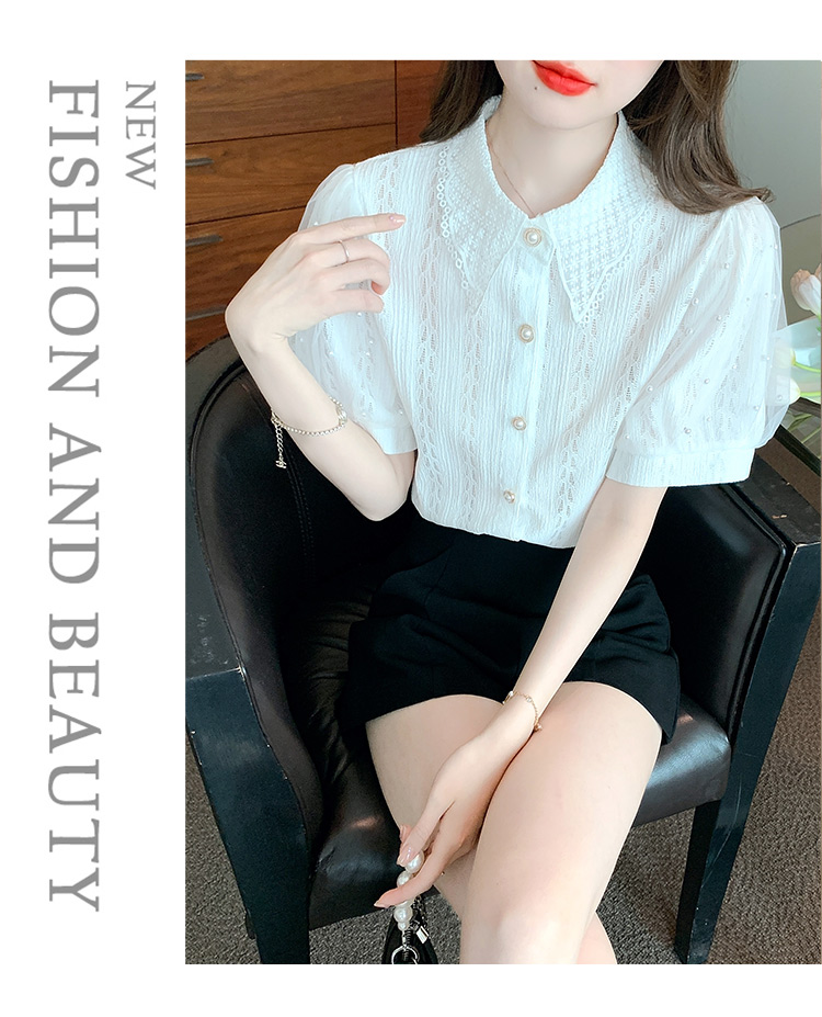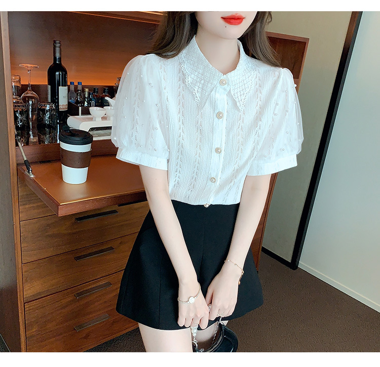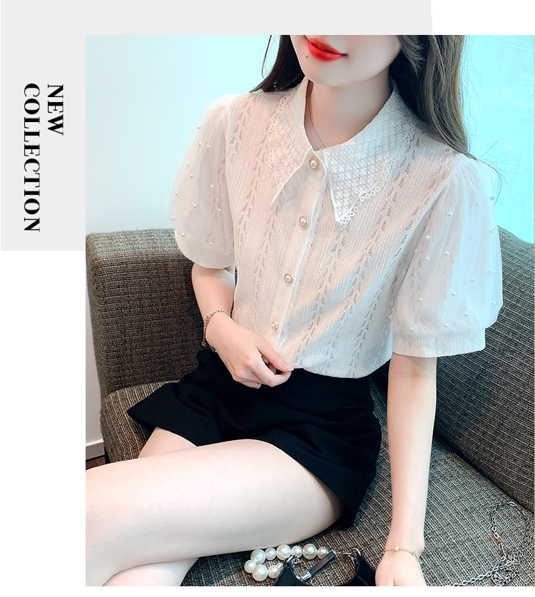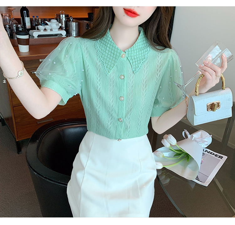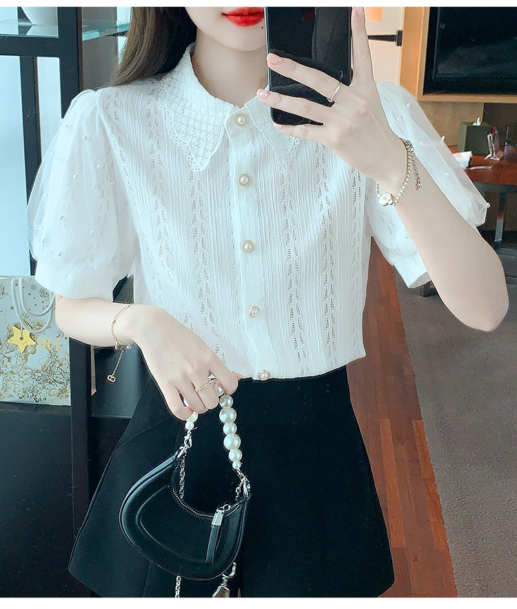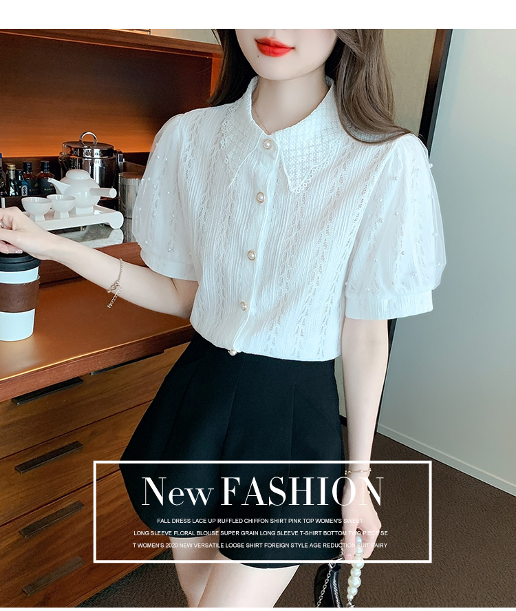 RY1168# 网纱雪纺衬衣女夏季2026新款时尚甜美娃娃领镂空泡泡短袖蕾丝上衣