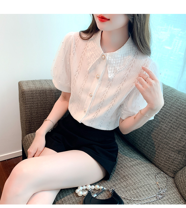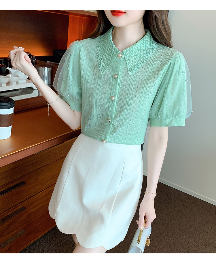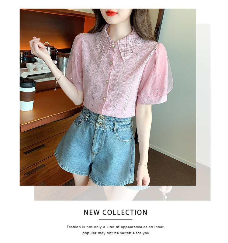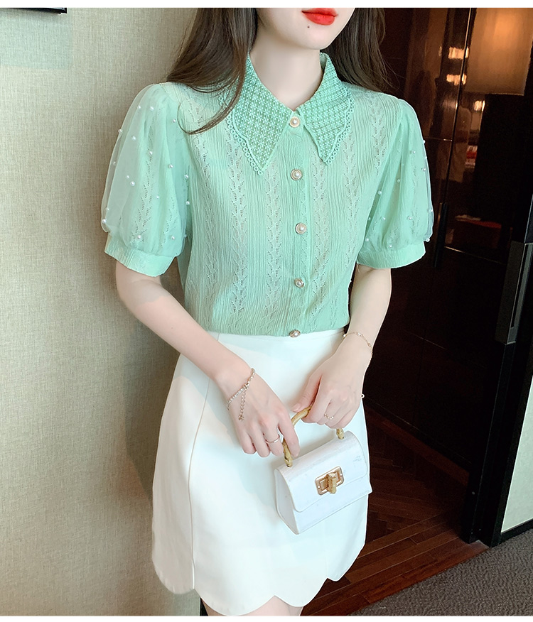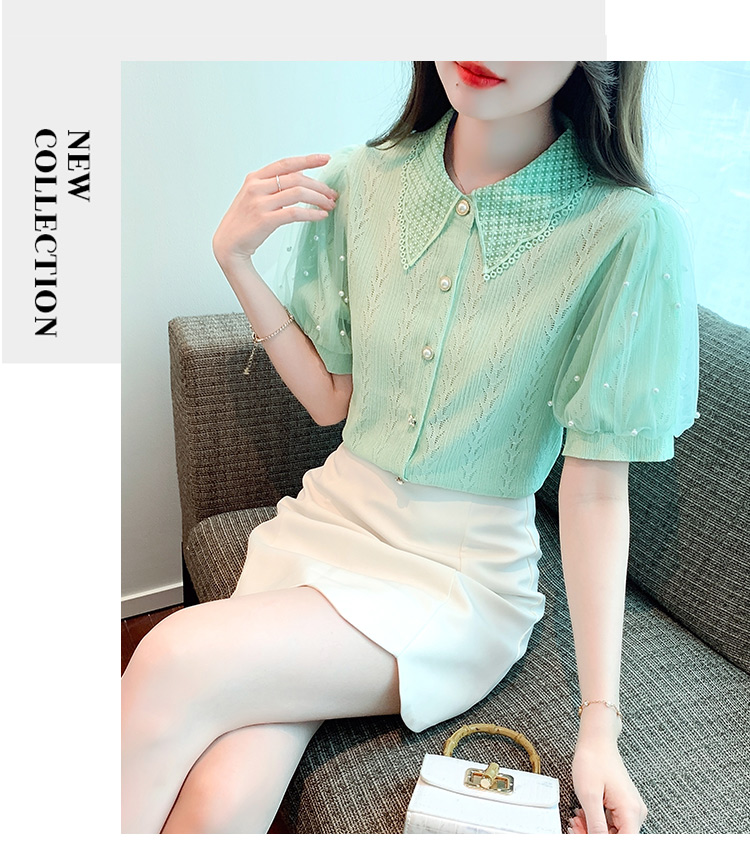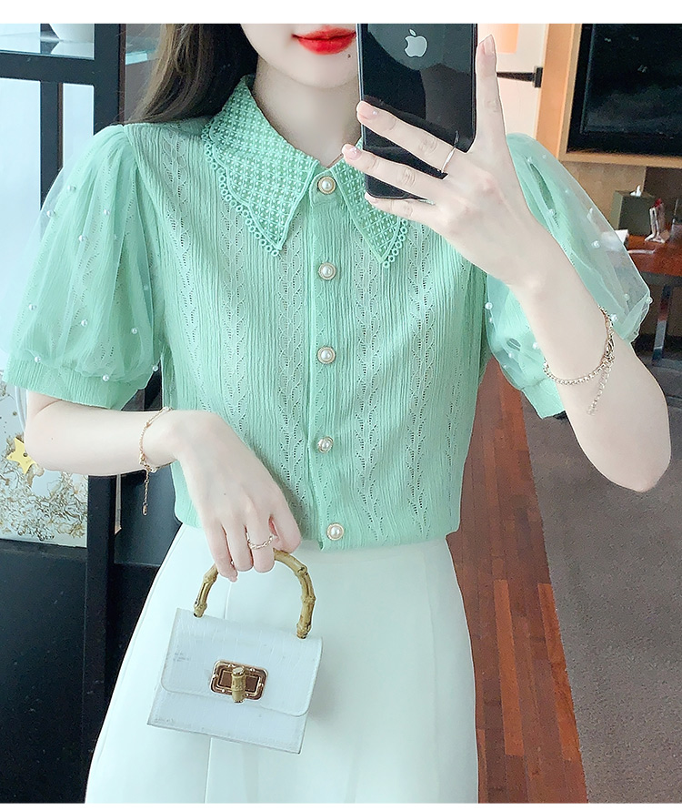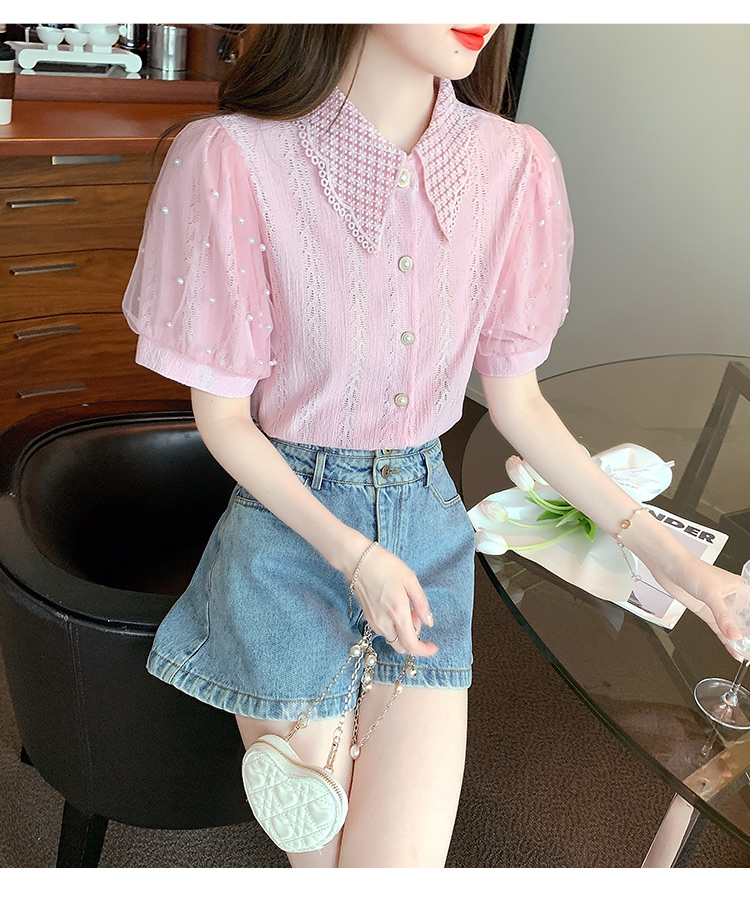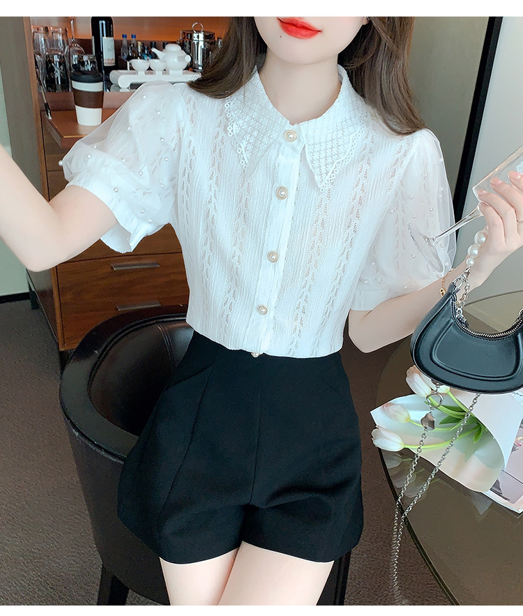 RY1168# 网纱雪纺衬衣女夏季2026新款时尚甜美娃娃领镂空泡泡短袖蕾丝上衣