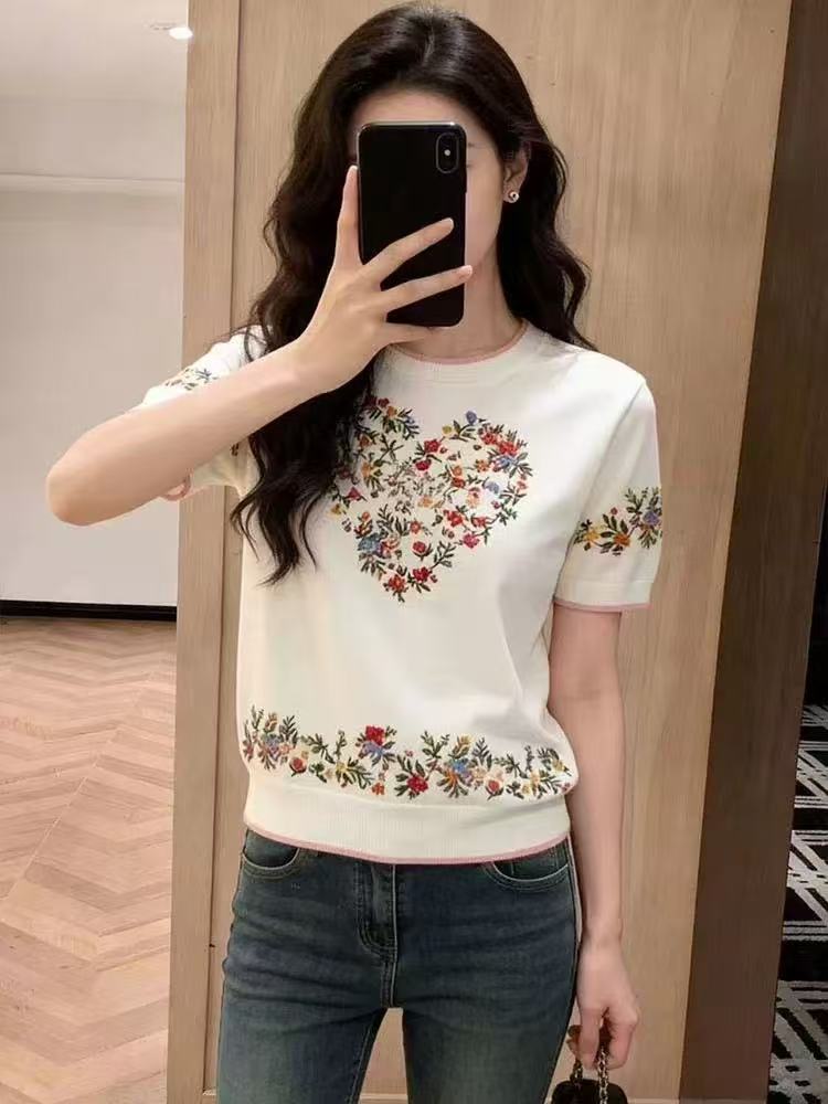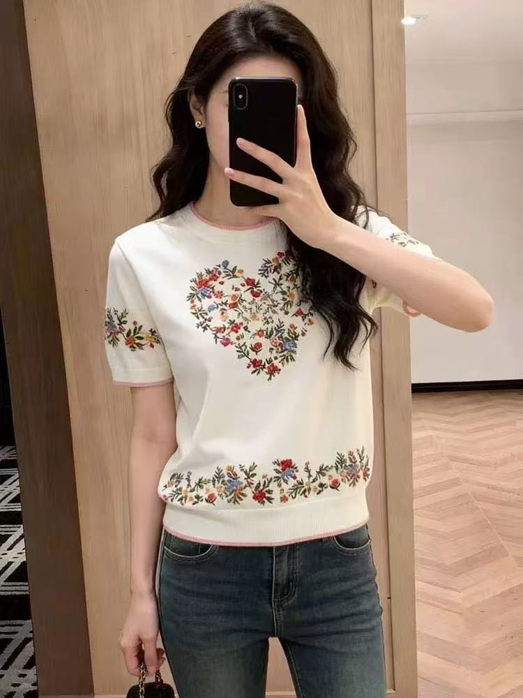 RY1171# 法式爱心碎花短袖针织衫女2026夏季新款圆领百搭高级感休闲上衣服