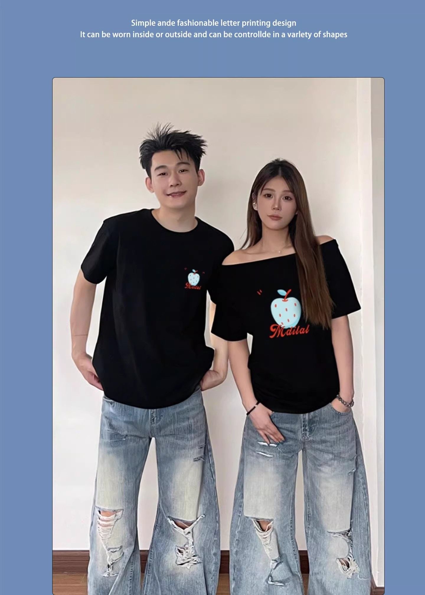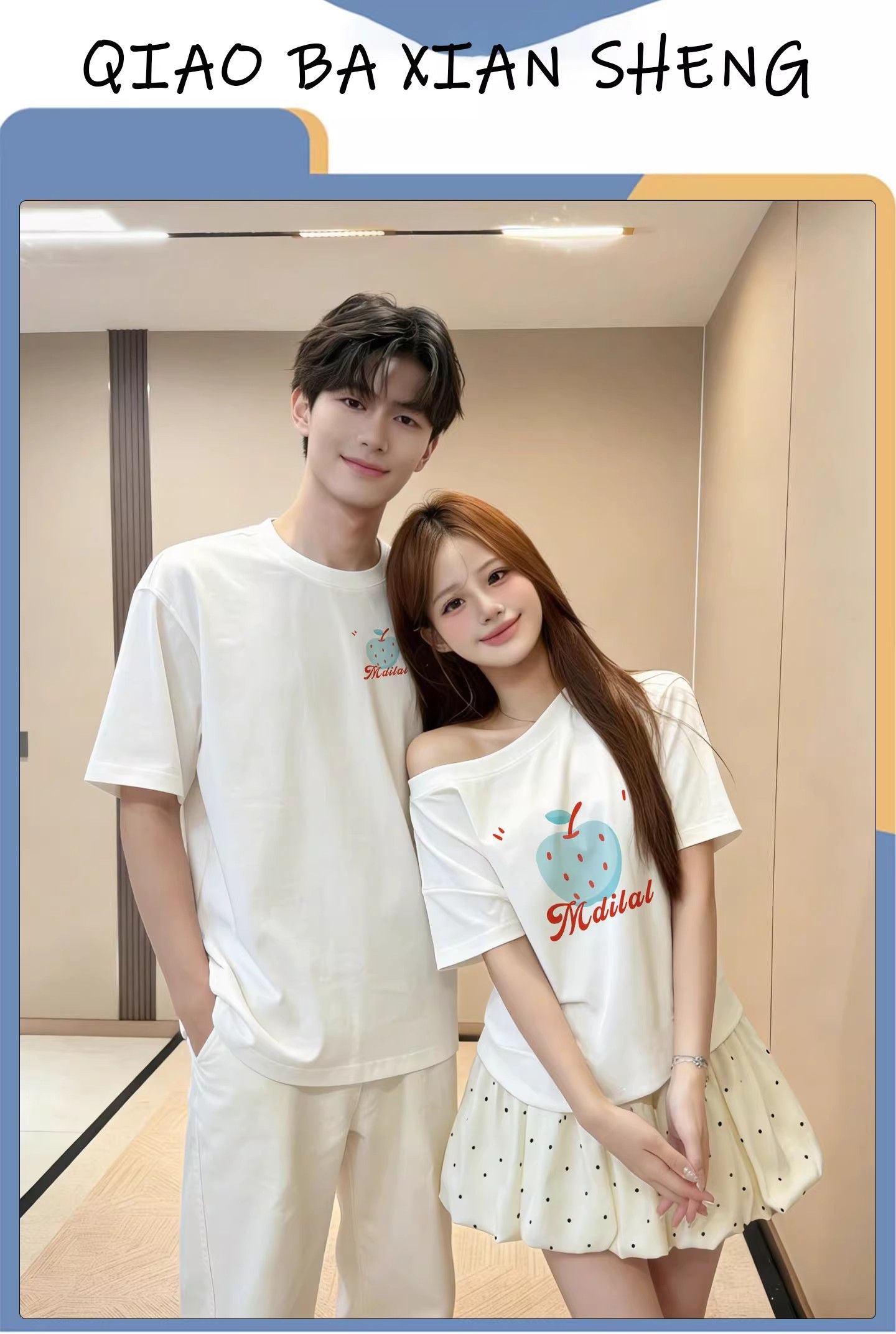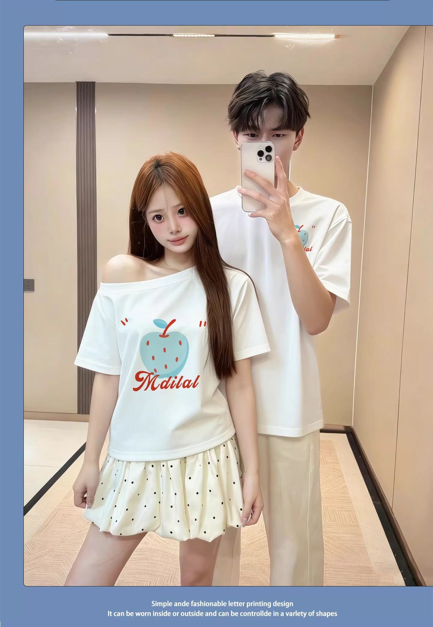 RY1175# 超好看的特别的情侣装斜肩短袖T恤2026新款夏季小众童趣印花上衣