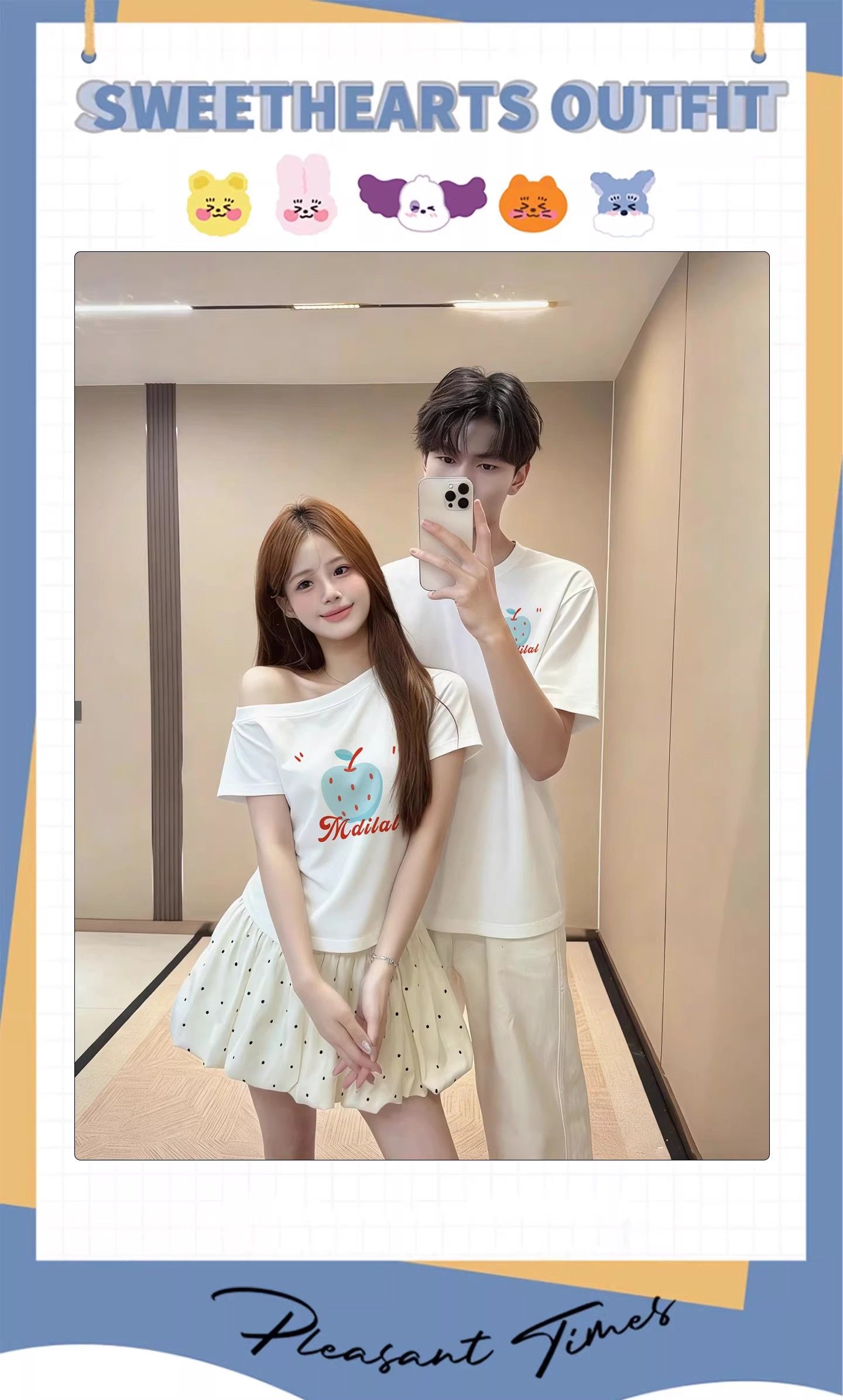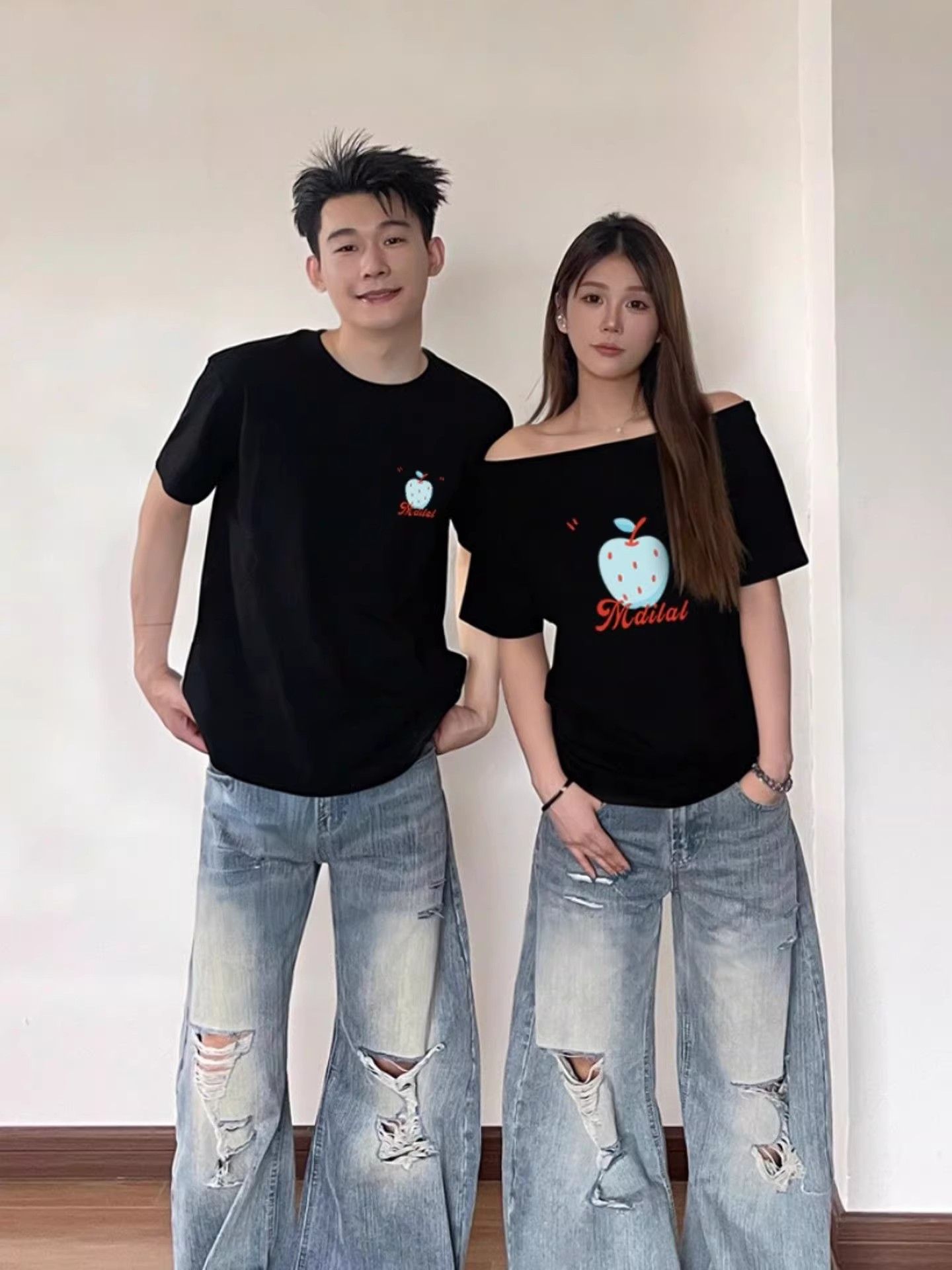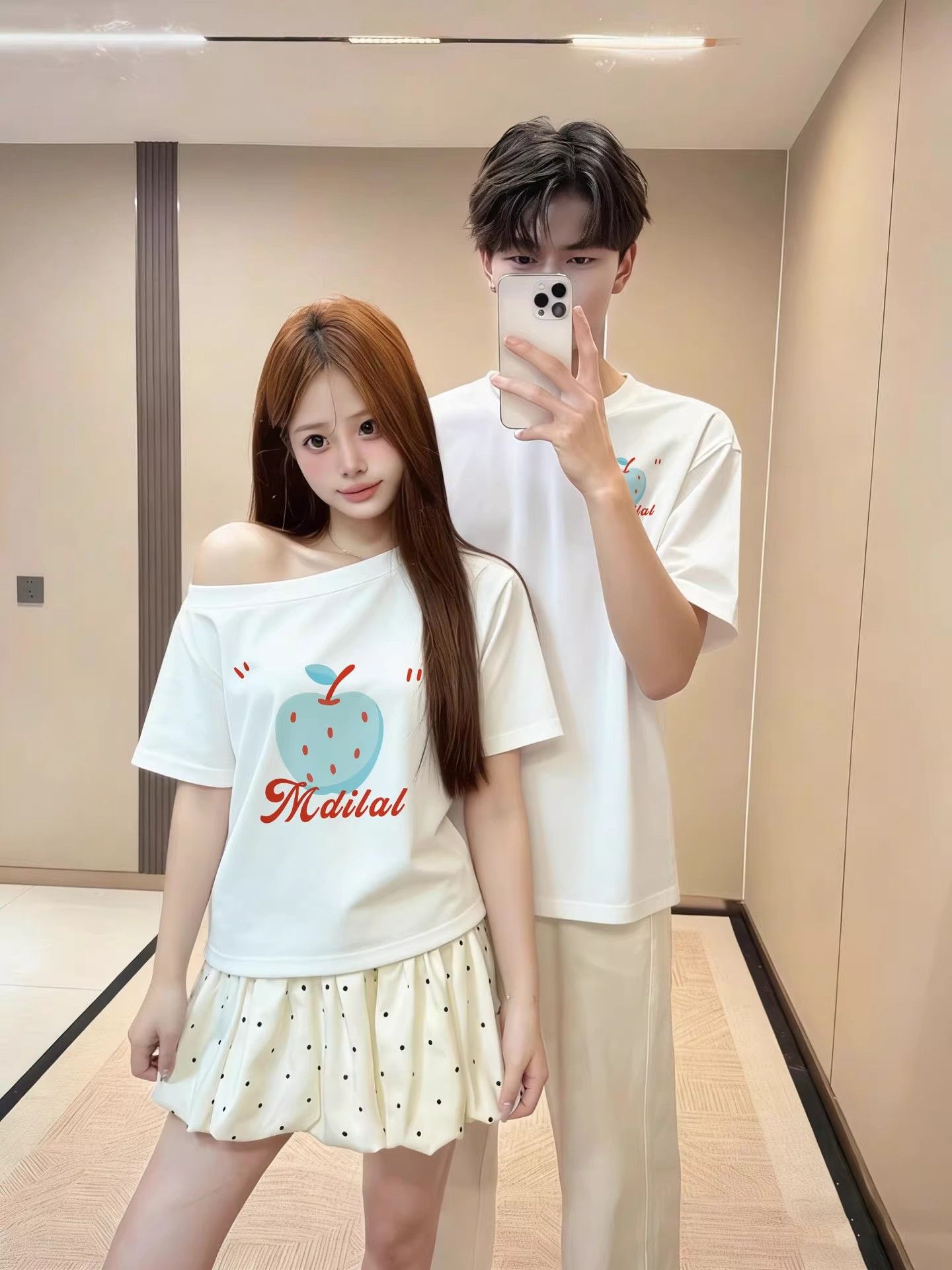 RY1175# 超好看的特别的情侣装斜肩短袖T恤2026新款夏季小众童趣印花上衣