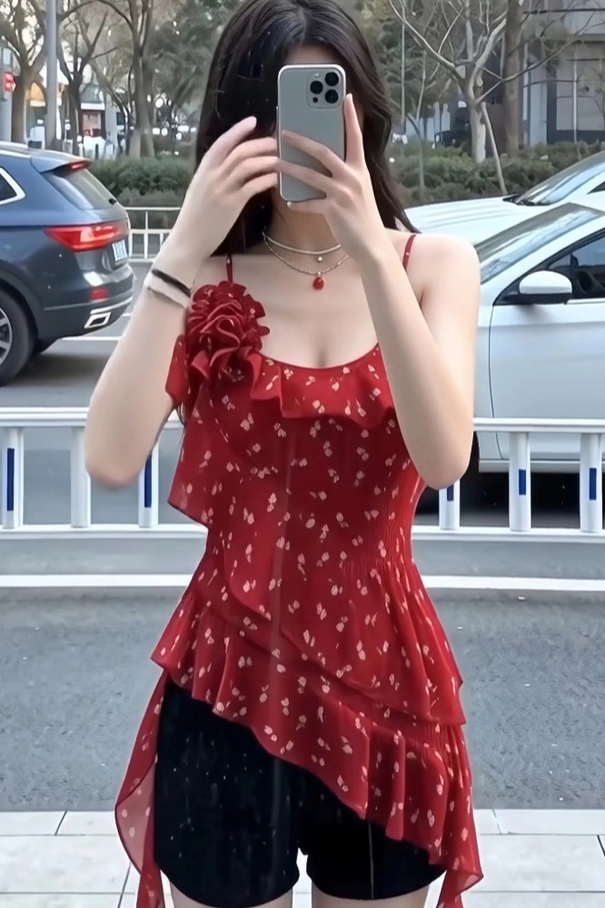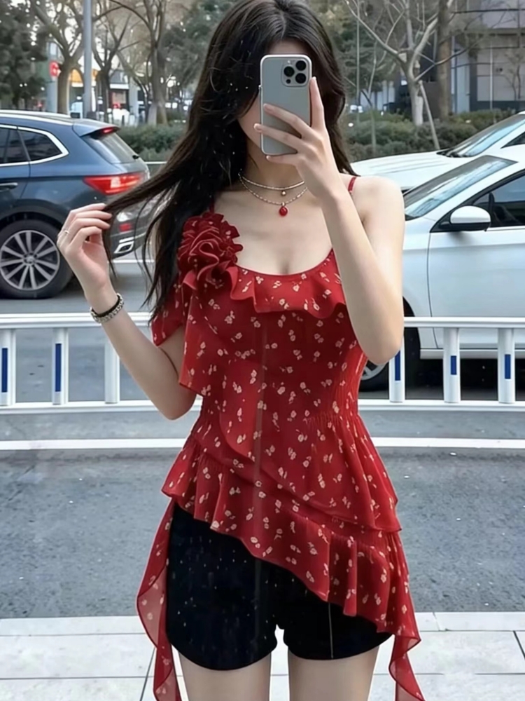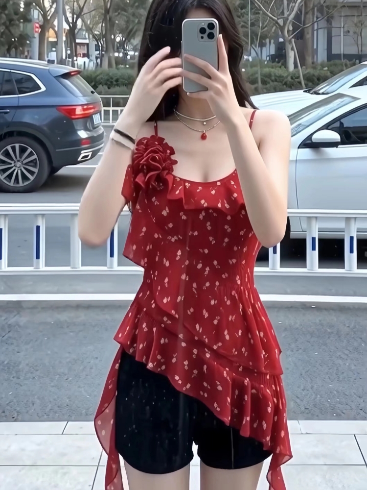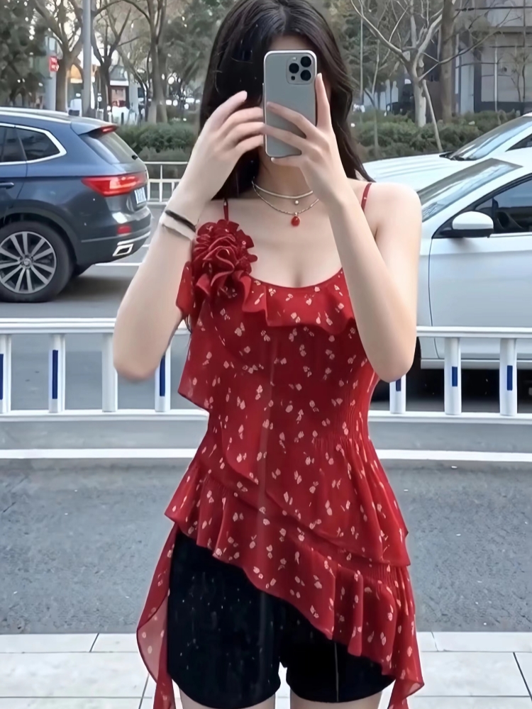 RY1185# 辣妹红色碎花吊带背心女夏季纯欲风不规则荷叶边飘带修身无袖上衣
