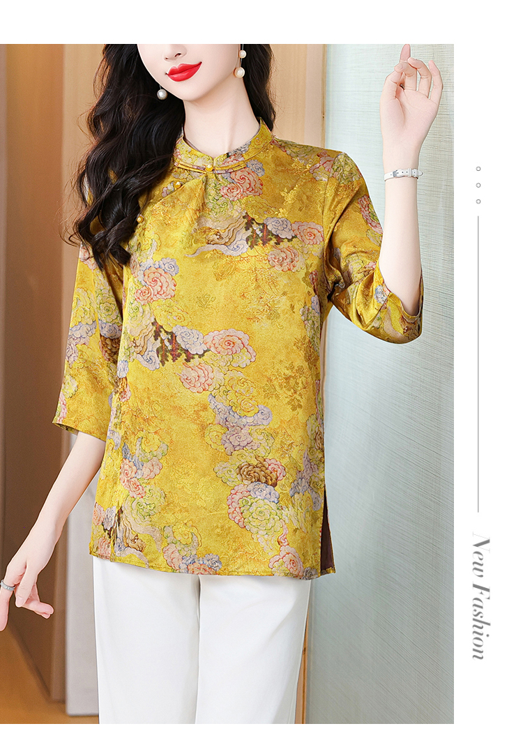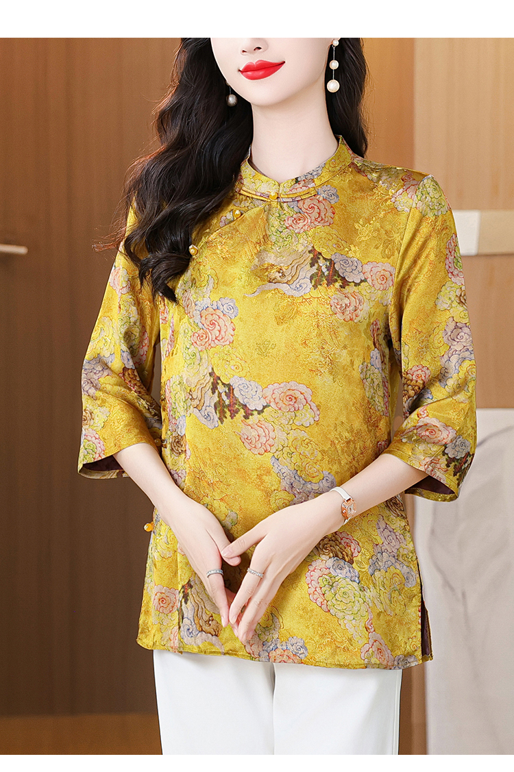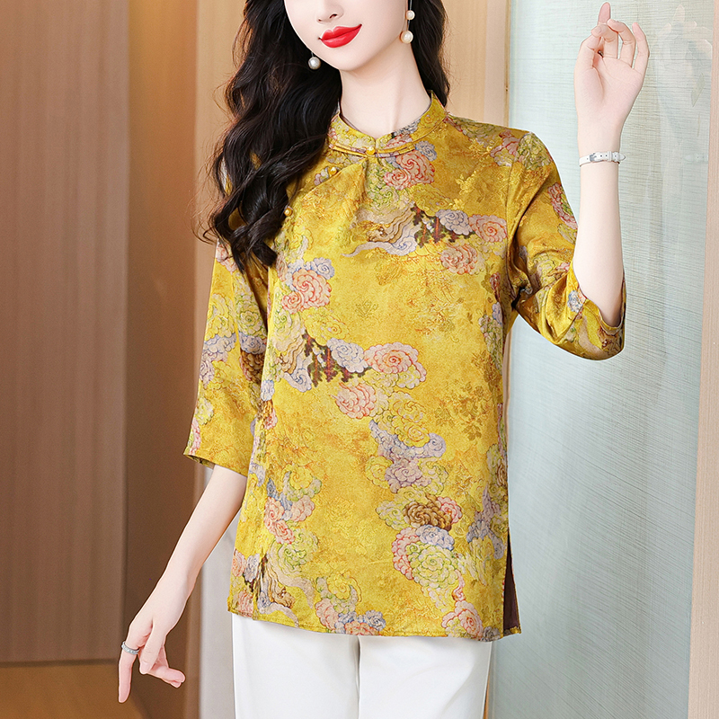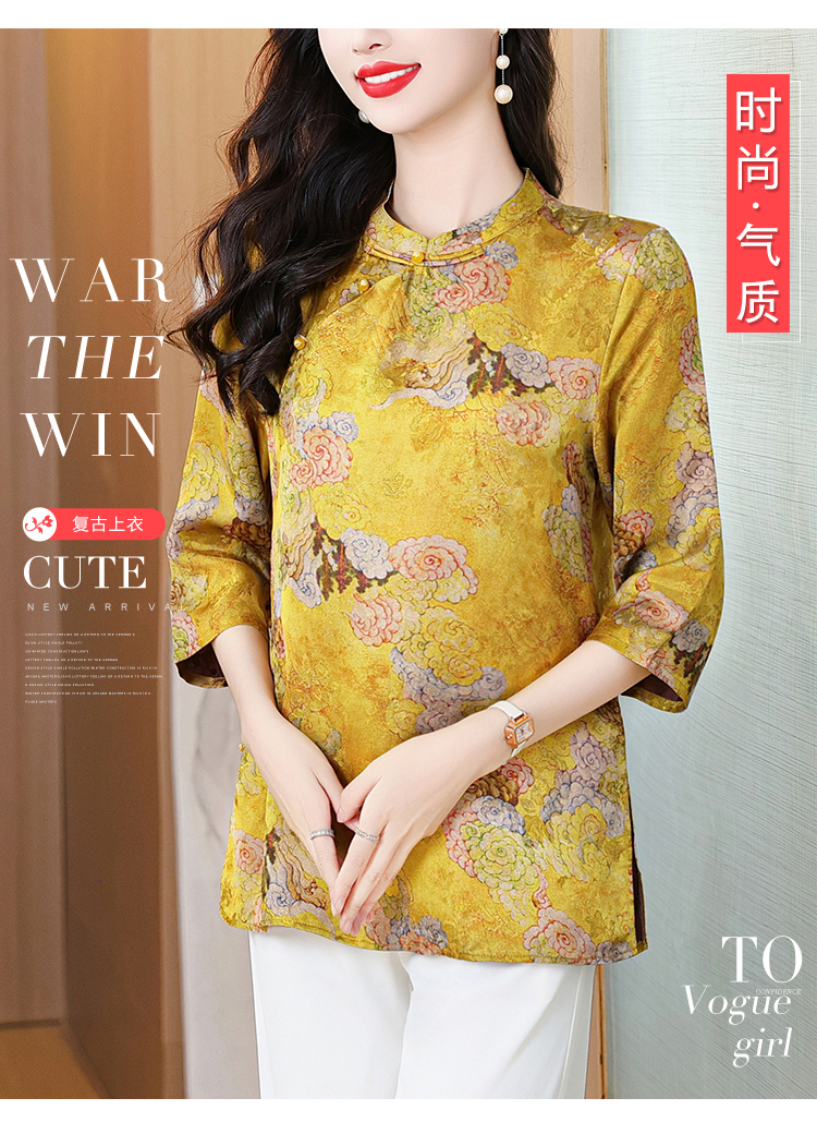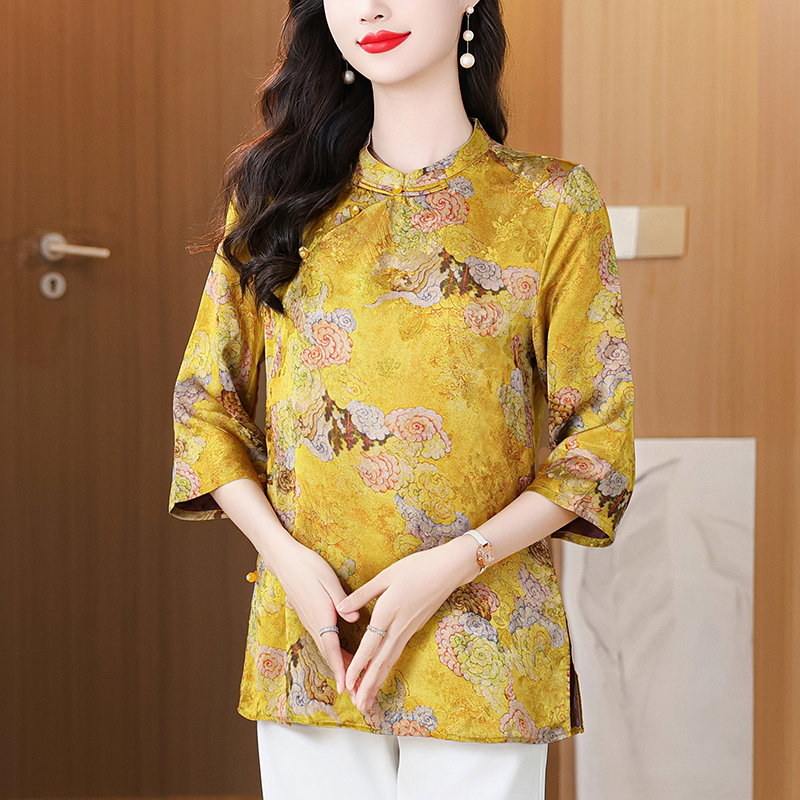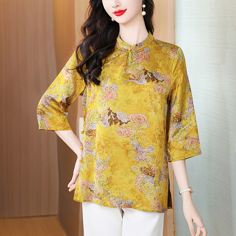 RY1191#实拍国风真丝衬衫中长款宽松大码妈妈春夏改良旗袍上衣新中式